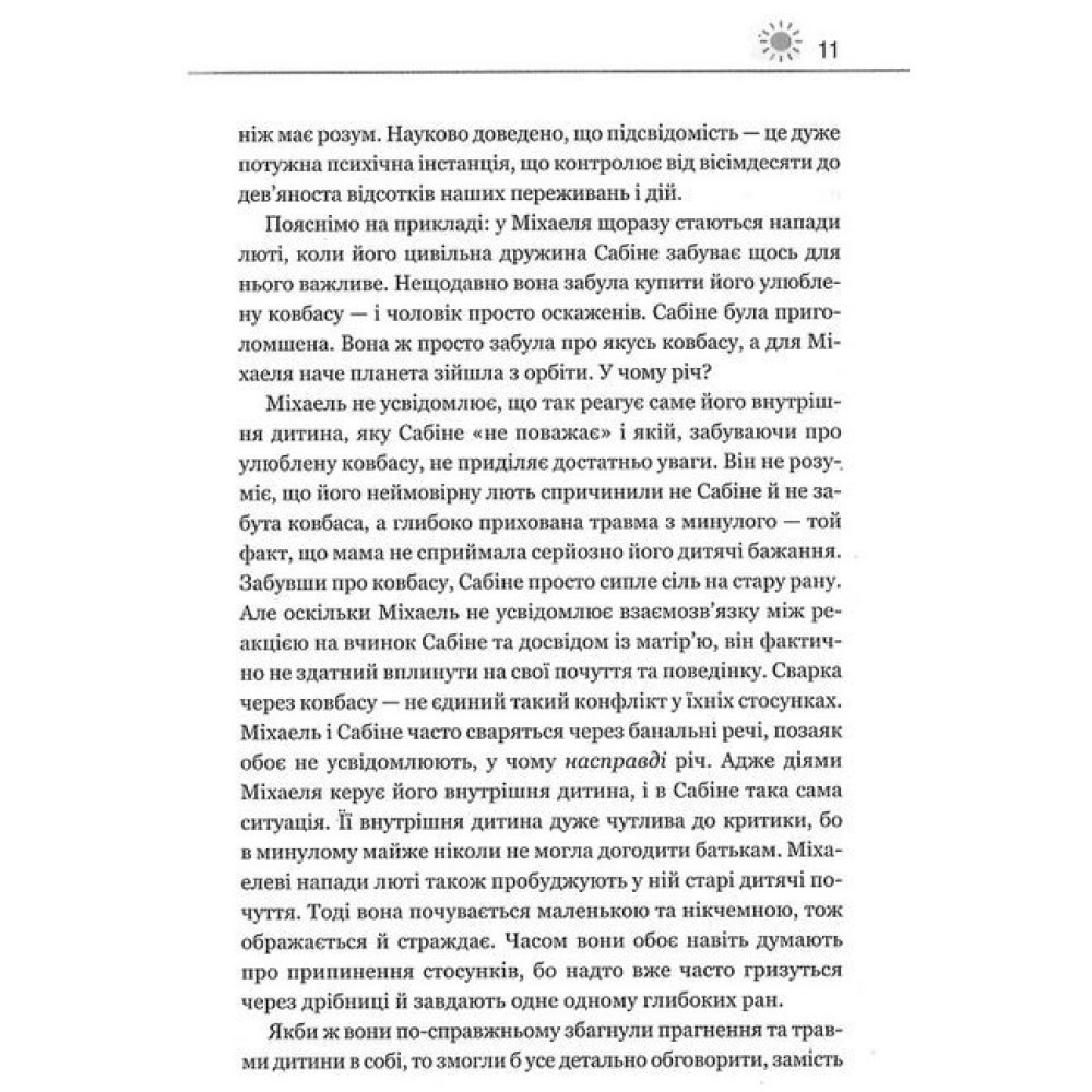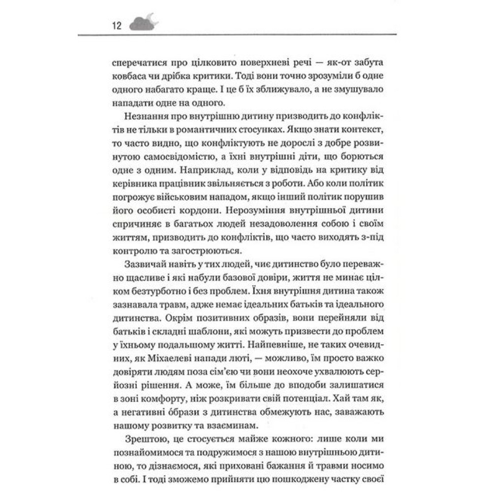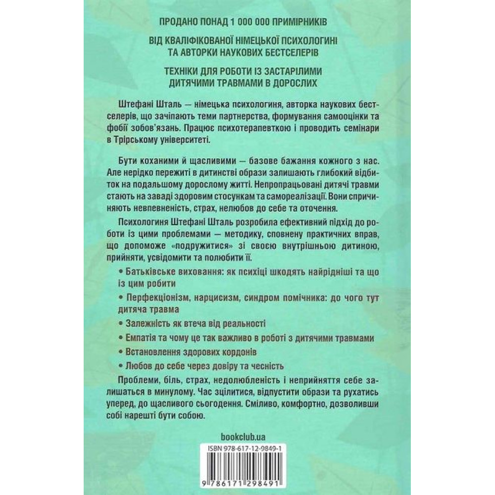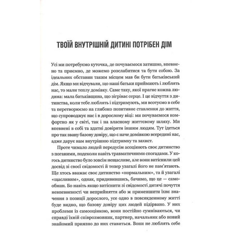 Бути коханими й щасливими - базове бажання кожного з нас. Але нерідко пережиті в дитинстві образи залишають глибокий відбиток на подальшому дорослому житті. Непропрацьовані дитячі травми стають на заваді здоровим стосункам та самореалізації. Вони спричиняють невпевненість, страх, нелюбов до себе та оточення. Психологиня Штефані Шталь розробила ефективний підхід до роботи із цими проблемами - методику, сповнену практичних вправ, що допоможе "подружитися" зі своєю внутрішньою дитиною, прийняти, усвідомити та полюбити її. • Батьківське виховання: як психіці шкодять найрідніші та що із цим робити. • Перфекціонізм, нарцисизм, синдром помічника: до чого тут дитяча травма. • Залежність як втеча від реальності. • Емпатія та чому це так важливо в роботі з дитячими травмами. • Встановлення здорових кордонів. • Любов до себе через довіру та чесність тощо.Проблеми, біль, страх, недолюбленість та неприйняття себе залишаться в минулому. Час зцілитися, відпустити образи та рухатись уперед, до щасливого сьогодення.