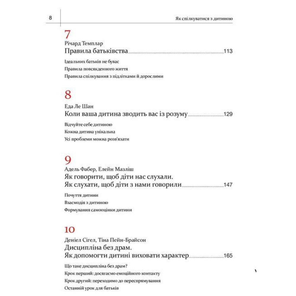 Книжка «Як спілкуватися з дитиною» — це збірник самарі світових бестселерів для люблячих батьків, які замислюються над тим, як будувати стосунки з дитиною, щоб зберегти тонкий душевний зв’язок, як виховувати без крику й лайки, як підбирати такі слова і дії, щоб дитина усвідомлювала, що батьки мають рацію, росла особистістю, була щасливою й успішною.Ми, батьки, спілкуємося зі своїми дітьми в проміжках між своєю роботою, їхніми школою, спортивними секціями та гуртками. Не завжди все буває легко: трапляються і сварки, і скандали. Тотальний карантин загострив ситуацію. Ми спробували бути поруч із дітьми в замкнутому просторі 24/7. І відразу одним із нагальних стало запитання: «Як спілкуватися?».Як спілкуватися, якщо ми різні і хочемо різного — одночасно?Як спілкуватися, якщо ми зайняті, а дітям потрібна нашу увага — просто зараз?Як спілкуватися, якщо ми замкнені в чотирьох стінах? Чи нова ця проблема? Ні. Просто в стресовій ситуації, що склалася, як ніколи важливо було підтримати і зрозуміти дітей, подивитися на обставини збоку і підкоригувати емоційну атмосферу в домі. Але щоб надати дітям таку підтримку, допомоги потребували ми самі. Як у правилах безпеки в літаках: «Спочатку надіньте кисневу маску на себе, потім — на дитину». Та й без карантину для багатьох сімей питання гармонійного спілкування з дітьми залишається актуальним. Цей збірник — своєрідна киснева маска для батьків. Тут зібрані самарі книжок, які допоможуть думаючим мамам і татам успішно впоратися зі своєю роллю, дадуть інструменти і додадуть упевненості. Вчіться краще розумітися одне з одним і ставайте ближчими. Проводьте час разом усією сім’єю із задоволенням.