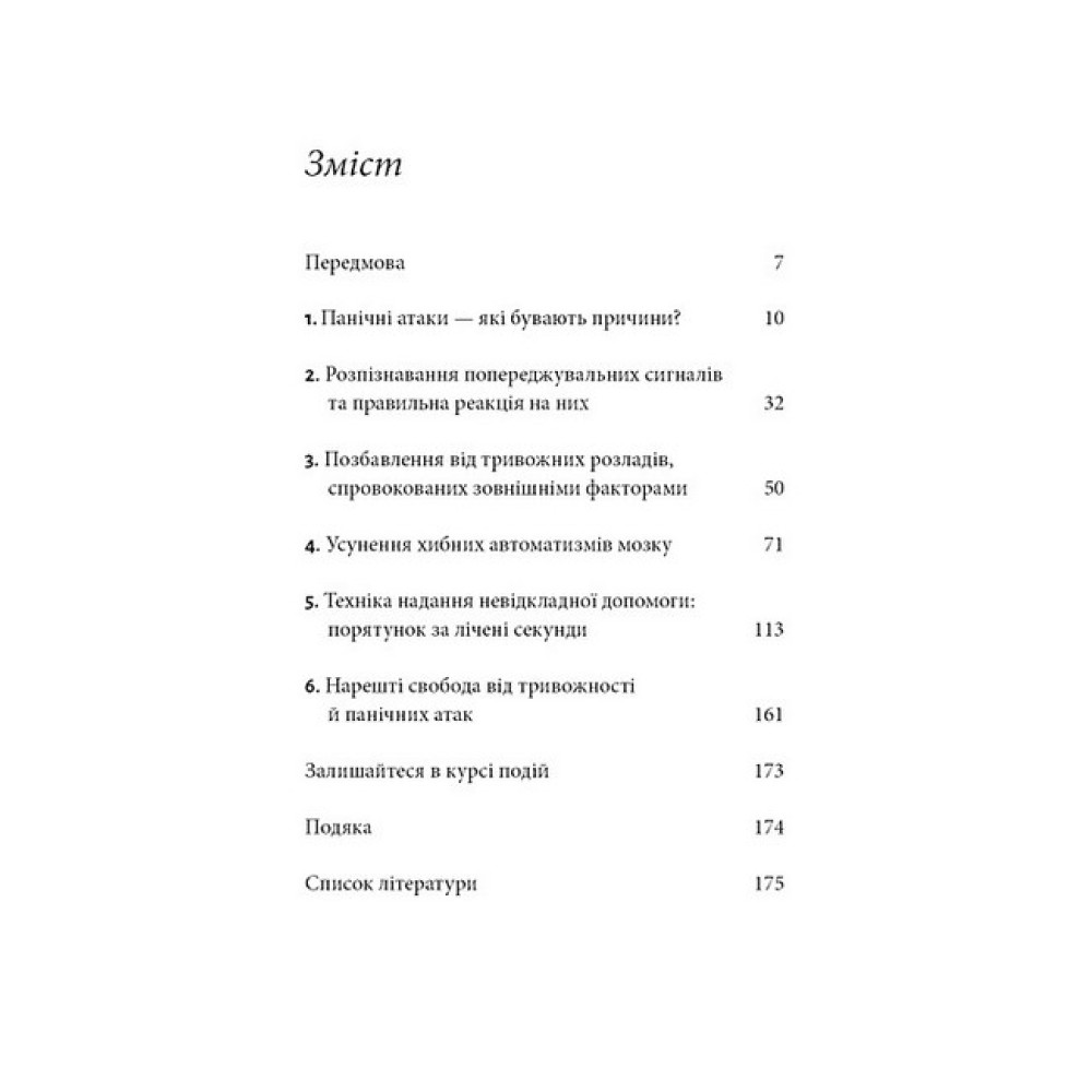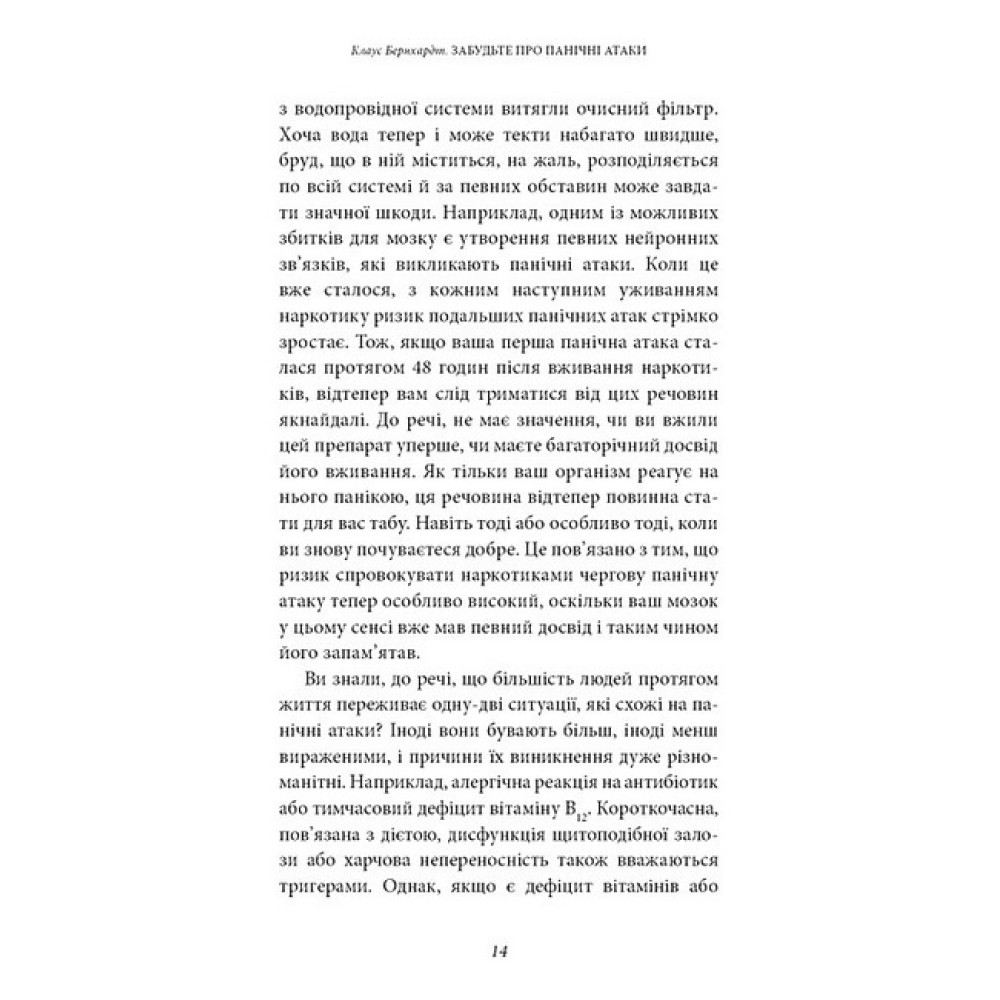 Експерт із питань тривоги Клаус Бернхардт проаналізував види терапії, які зазвичай застосовуються в роботі з тривожними станами й панічними атаками, і порівняв їх із результатами сучасних досліджень мозку. Його висновки вражають: більшість із цих видів терапії вже давно застаріла й на сьогодні не має обґрунтування з нейронаукового погляду. На підставі сучасних досліджень він розробив абсолютно новий тип терапії з урахуванням особливостей роботи нашого мозку, що допомагає пацієнтам із тривогою та панікою. Вправи й техніки, із якими Клаус Бернхардт знайомить читачів цієї книги, дають змогу багатьом людям повернутися до життя без страху вже за кілька тижнів.