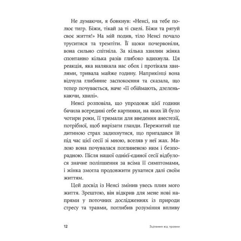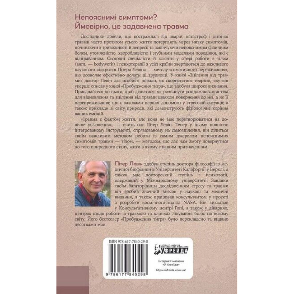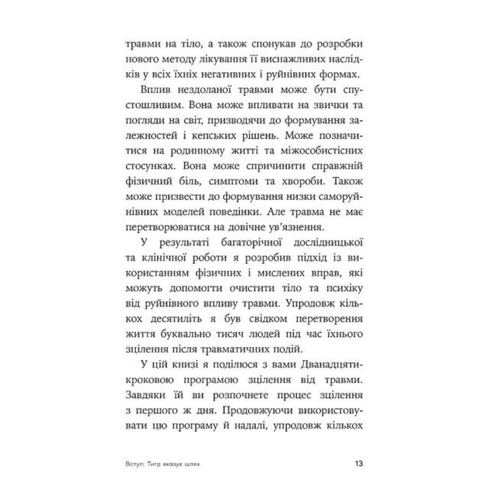 Сучасна психіатрія ставиться до багатьох довгострокових наслідків травми як до невиліковної хвороби, яку лише частково можна контролювати за допомогою ліків або через управління поведінкою. Медикаменти іноді можуть бути дуже помічними, але самі по собі вони неефективні, вважає автор цієї книги доктор Пітер Левін. Як досвідчений лікар та фізіолог із класичною медичною освітою, пропрацювавши з травмою упродовж кількох десятиліть, він дійшов висновку, що люди з'являються на світ із вродженою здатністю здобувати перемогу над травмою. Доктор Левін переконаний, що травма є виліковною, а сам процес зцілення може виявитися каталізатором глибинного пробудження — порталом до емоційного та духовного перетворення. У результаті багаторічних досліджень і клінічної роботи він створив унікальний підхід, що ґрунтується на фізичних та ментальних вправах, які допомагають очистити тіло й розум від згубних наслідків травматичного досвіду. Призначена для психотерапевтів та всіх, хто цікавиться цією тематикою.Подяки......................7ВСТУП Тигр вказує шлях......................10 ПЕРШИЙ РОЗДІЛ Що таке травма?......................18 ДРУГИЙ РОЗДІЛ Причини та симптоми травми......................24 ТРЕТІЙ РОЗДІЛ Як травма впливає на тіло?......................47 ЧЕТВЕРТИЙ РОЗДІЛ Дванадцятикрокова програма зцілення від травми......................60 П’ЯТИЙ РОЗДІЛ Сексуальна травма: зцілення від священної рани......................118 ШОСТИЙ РОЗДІЛ Духовність і травма: шлях до пробудження......................132Помічні підказки та техніки для запобігання травмам......................138 Додаткові ресурси......................152 Про автора......................154