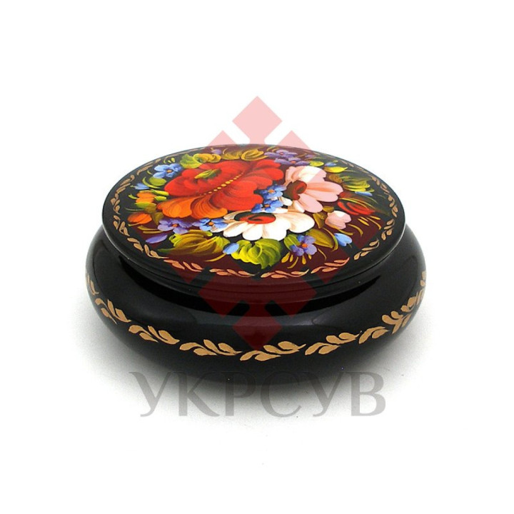 Шкатулка ручної роботи, розписана в техніці "Петриківський розпис", авторська робота. Має підпис художника.На дно виробу наклеєна м'яка тканина (кашемір) чорного кольору.Матеріал виробу: дерево (береза)Фарба для розпису: маслоФінішне покриття: чотири шари глянцевого лакудіаметр - 83 ммвисота - 36 ммМалюнок в асортименті