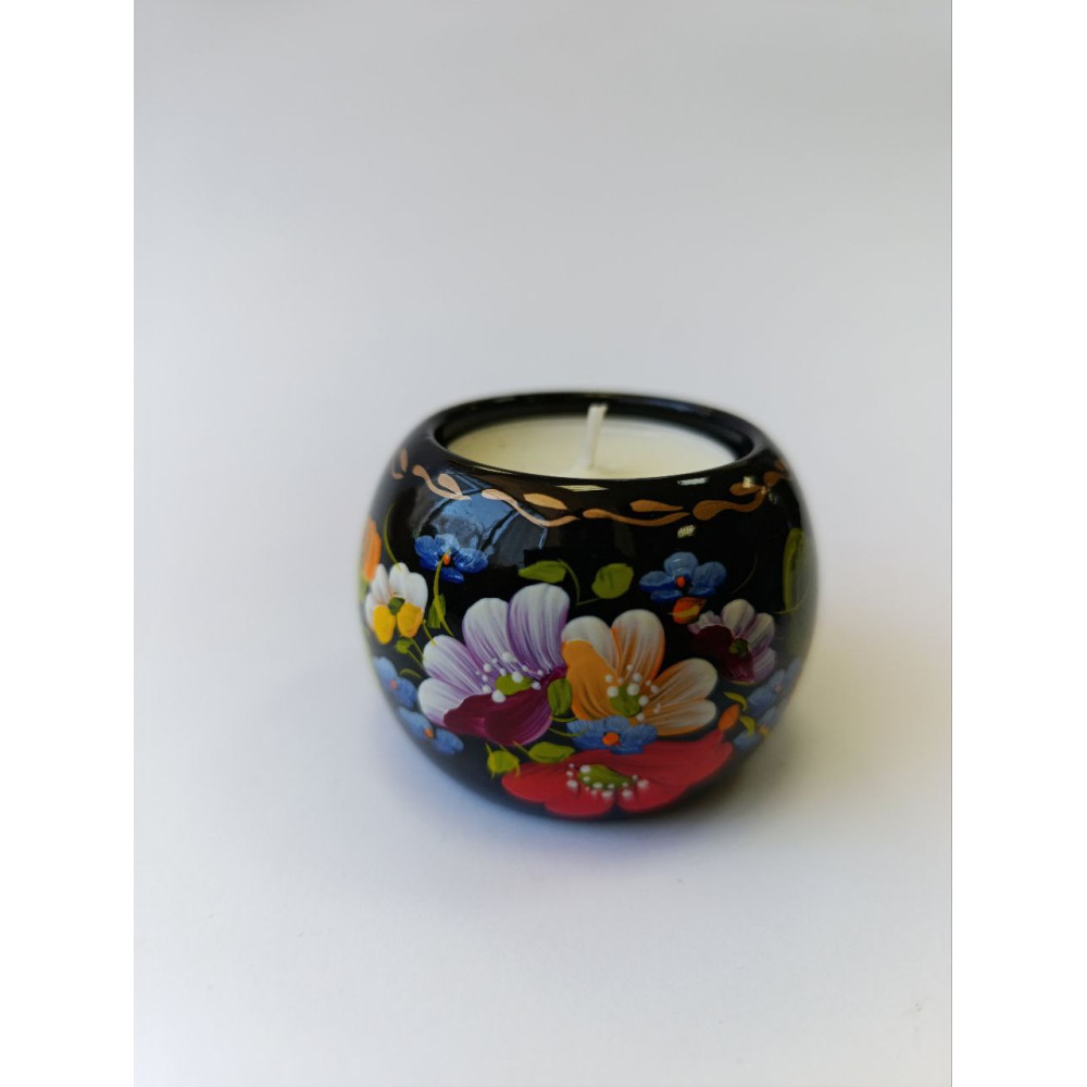 Свічник розписаний в техніці Петриківський розпис. Ручний розпис, авторська робота. Матеріал виробу: дерево Фарба для розпису: художні олійні фарби Покриття: чотири шари глянцевого лаку