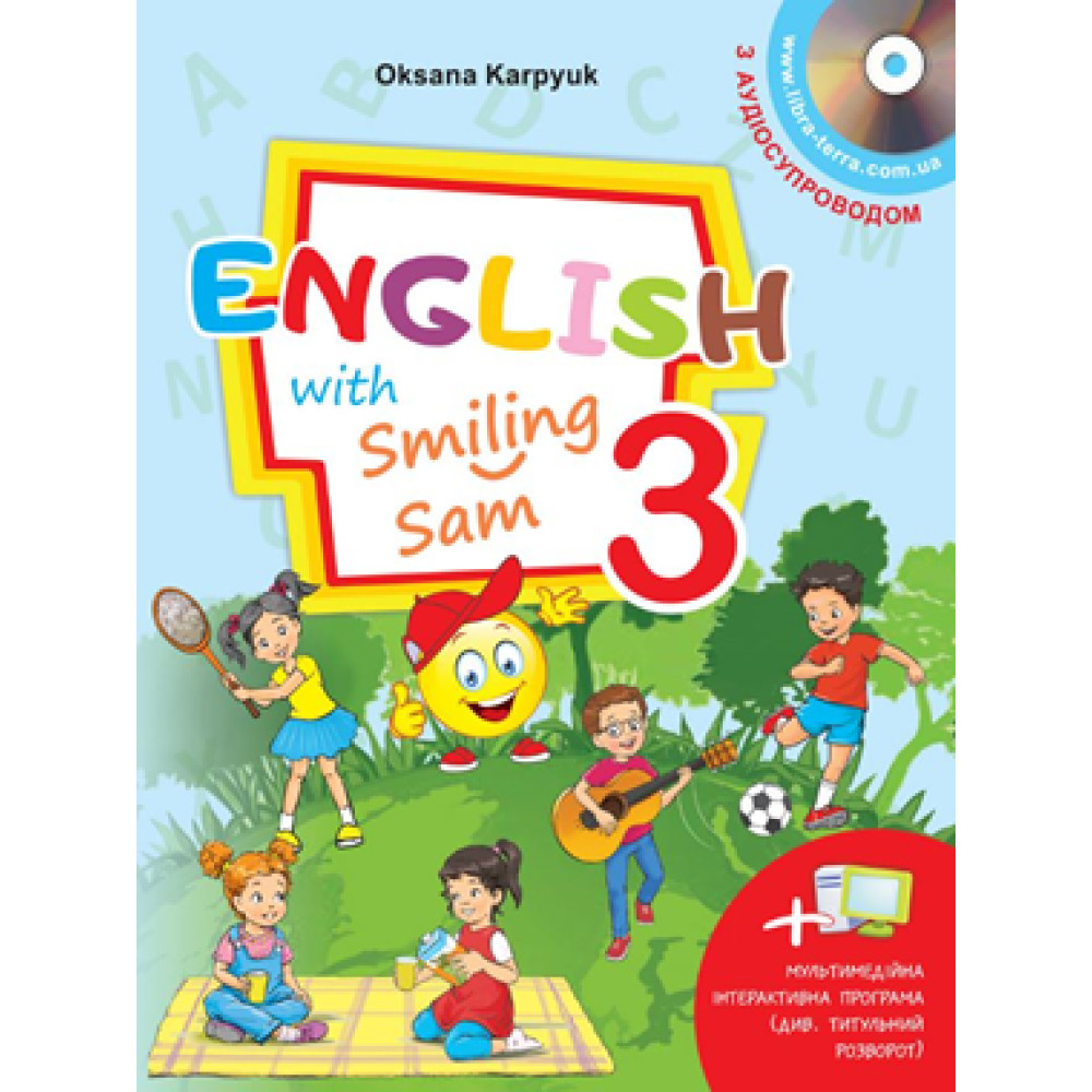 Підручник Англійська мова 3 клас English with Smiling Sam НУШ + інтерактивна програма Карпюк О. Лібра-Терра. Основний навчальний матеріал підручника є доступним для сприймання третьокласником, який досяг наприкінці 2-го класу рівня володіння англійською мовою Pre-A1 та продовжує рухатись до рівня елементарного володіння A1 в усіх 4-х видах мовленнєвої діяльності.