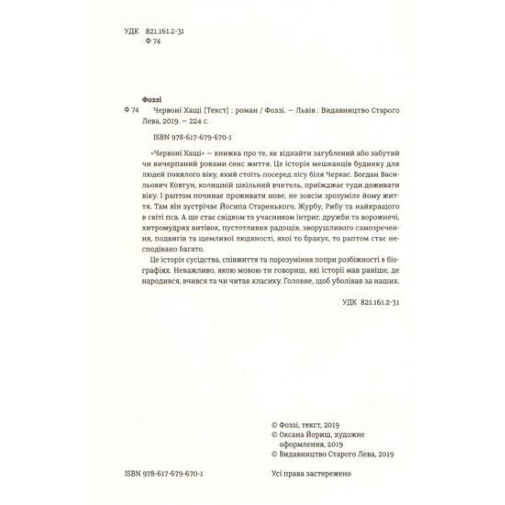 «Червоні Хащі» — книжка про те, як віднайти загублений або забутий чи вичерпаний роками сенс життя. Це історія мешканців будинку для людей похилого віку, який стоїть посеред лісу біля Черкас. Богдан Васильович Ковтун, колишній шкільний вчитель, приїжджає туди доживати віку. І раптом починає проживати нове, не зовсім зрозуміле йому життя. Там він зустрічає Йосипа Старенького, Журбу, Рибу та найкращого в світі пса. А ще стає свідком та учасником інтриг, дружби та ворожнечі, хитромудрих витівок, пустотливих радощів, зворушливого самозречення, подвигів та щемливої людяності, якої то бракує, то раптом стає несподівано багато.Це історія сусідства, співжиття та порозуміння попри розбіжності в біографіях. Неважливо, якою мовою ти говориш, які історії мав раніше, де народився, вчився та чи читав класику. Головне, щоб уболівав за наших.