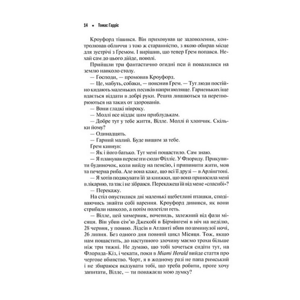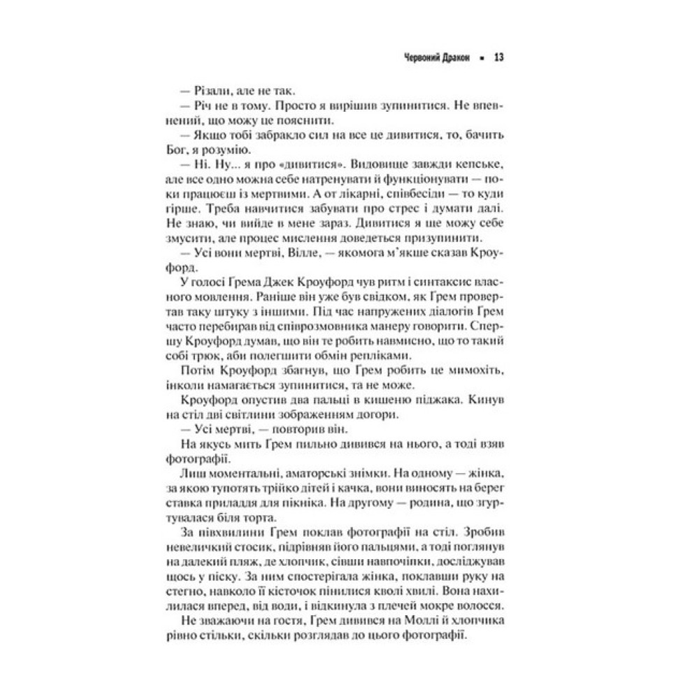 № 27 серед «100 кращих детективних романів усіх часів» за версією Асоціації детективних письменників США З того часу як слідчий Вілл Ґрем спіймав та посадив за ґрати сенсаційного злочинця - колишнього психіатра Ганнібала Лектера, минуло 5 років. Вілл перебуває на заслуженій пенсії й не збирається повертатися до роботи, яка коштувала йому здоров’я. Однак в Америці з’являється новий серійний убивця, який жорстоко розправився з двома сім’ями і, схоже, не планує зупинятися. Тож Ґрем змушений взятися за цю справу. Опрацьовуючи її матеріали, слідчий розуміє: без допомоги Ганнібала зупинити подібні злочини неможливо. А маніяк за ґратами однак уже не зможе нашкодити. Правда ж? Культовий роман, в якому вперше з’являється епічний персонаж - серійний вбивця та канібал Ганнібал Лектер та єдиний раз, коли героєм є Вілл Ґрем - профайлер ФБР.