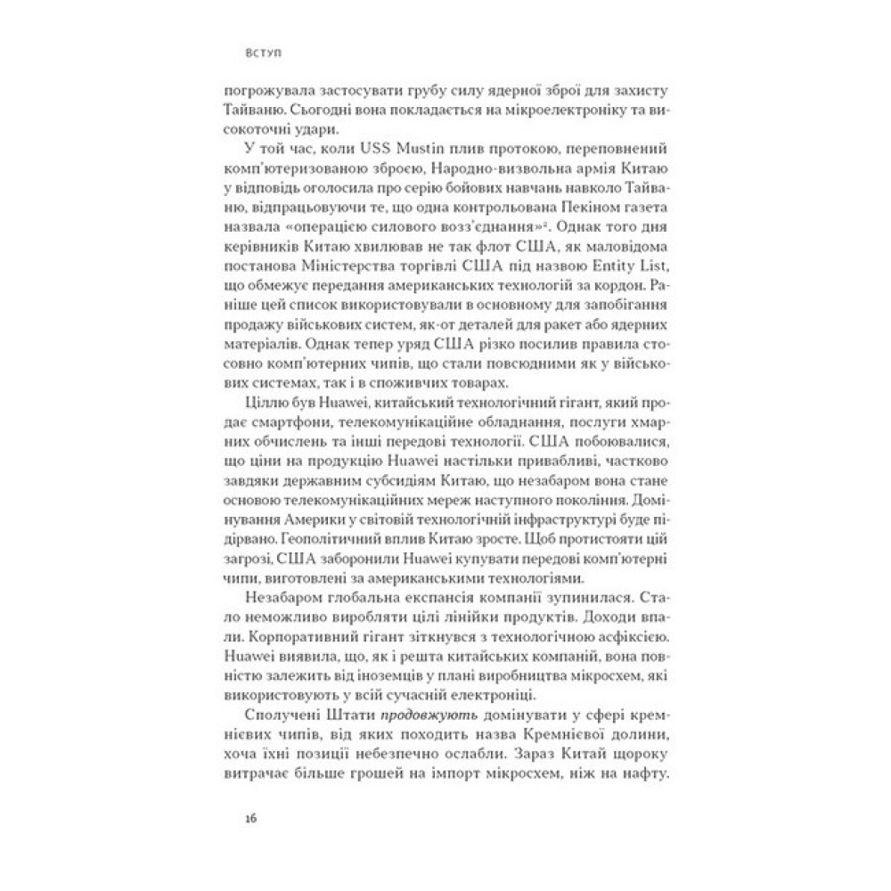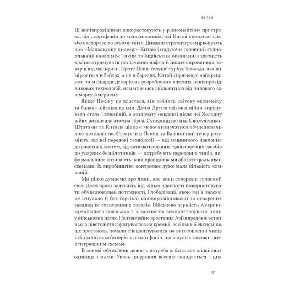 Мікрочипи — це як нова нафта. Саме від цього дефіцитного ресурсу залежить весь світ. І це не перебільшення: на мікросхемах працює майже все — від мікрохвильовок і смартфонів до ракет і фондового ринку. Та як розвивається індустрія мікрочипів і як вона змінюватиме наше майбутнє?Кріс Міллер створив не суху технічну оповідь, а захопливу історію про економічні та геополітичні стратегії. Ви поринете у світ глобальних інтриг і технологічних битв, де корпорації та держави ведуть жорстку війну за панування у виробництві мікрочипів. Довідаєтеся, як США здобули основну роль на ринку, як шпигунська мережа ставала секретною зброєю СРСР і чому Тайваню варто остерігатися.Це книжка про те, як маленькі кремнієві пластини стали ключем до глобального впливу, а також про ризики й можливості війни технологій.Кріс Міллер — економічний історик, науковець. Викладач міжнародної історії у Флетчерській школі Університету Тафтса. Керівник напряму «Євразія» в Інституті досліджень зовнішньої політики (США) та консалтингової компанії Greenmantle, що спеціалізується на геополітиці та макроекономіці.