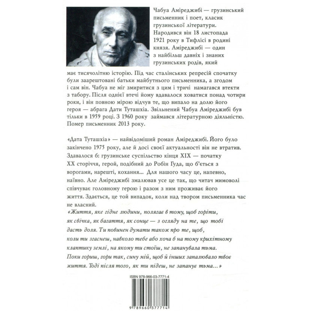 Чабуа Аміреджибі — грузинський письменник і поет, класик грузинської літератури. Народився він 18 листопада 1921 року в Тифлісі в родині князя. Аміреджибі — один з найбільш давніх і знаних грузинських родів, якиймає тисячолітню історію. Під час сталінських репресій спочатку були заарештовані батьки майбутнього письменника, а згодом і сам він. Чабуа не міг змиритися з цим і тричі намагався втекти з табору. Після однієї втечі йому вдавалося переховуватися понад чотири роки, і він повною мірою відчув те, що випало на долю його героя — абрага Дати Туташхіа. Звільнений Чабуа Аміреджибі був тільки в 1959 році. З 1960 року займався літературною діяльністю. Помер письменник 2013 року. «Дата Туташхіа» — найвідоміший роман Аміреджибі. Його було закінчено 1975 року, але й досі своєї актуальності він не втратив. Здавалося б: грузинське суспільство кінця ХIХ — початку ХХ сторіччя, герой, подібний до Робін Гуда, що б’ється з ворогами, нарешті, кохання... Для нашого часу це, напевно, наївно. Але Аміреджибі змалював усе це так, що читач мимоволі співчуває головному герою і разом з ним проживає його життя. Здається, це той випадок, коли над твором письменника час не владний.