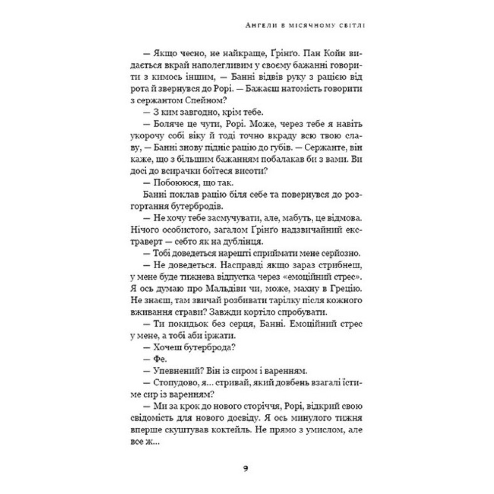 «Ангели в місячному світлі» — не просто приквел «Дублінської трилогії». Це яскраве знайомство з харизматичним Банні МакҐаррі.У романі подано захопливу передісторію становлення молодого детектива. Життя його непросте, а деякі події лише додають клопотів. 1999 рік, серед кримінальної спільноти Дубліна Банні має репутацію великої скалки в дупі, й це збігається з думкою його начальства. Друг і напарник МакҐаррі має великі борги через залежність від азартних ігор, що може зруйнувати його подальшу кар’єру. Відтак Банні дістає нагоду зіграти на повну силу. Він поставив собі за мету знищити найвправнішу та найзухвалішу банду грабіжників у історії Ірландії. Тож останнє, що йому потрібно в житті — це ще одна халепа.Її звуть Симона. Вона розумна, весела, талановита і, як-то кажуть, не без проблем. Коли її драматичне минуле починає виринати на поверхню, стосунки з Банні дедалі ускладнюються, ставлячи під загрозу шанси на спільне майбутнє.Якщо доведеться вибирати між дотриманням норм законності та захистом тих, кого він любить, який бік обере цей здоровань?
