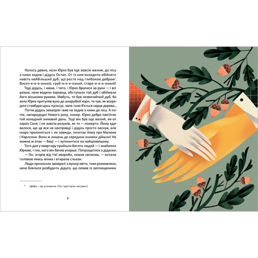 Понад усе Юрко любить їздити до лісу з дідусем, мамою і татом, а згодом — і з сестричкою Сонею. Там, у лісі, родина має своє улюблене дерево — обіймальний дуб, який можна обхопити лише всім разом. Проте одного дня родину роз’єднує війна — тато іде на фронт захищати Україну…«Дубочок з війни» — щемка оповідь про війну і втрату, але також і про силу роду та любові, таких міцних, як кремезне мудре дерево.