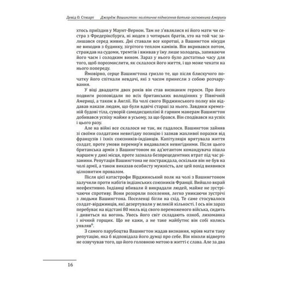 Девід О. Стюарт (нар. 1951 р.) — американський письменник і адвокат, пише історичні нехудожні твори та історичні романи.Автор детально описав життєвий шлях першого президента США, створив реалістичний портрет найважливішого лідера Америки. Вашингтон був обраний президентом США у 1789 році й працював на цій посаді два терміни, до 1797 року. Багато традицій президента, які зберігаються досі, встановив саме Вашингтон. За його президентства була створена двопартійна система, заснований Перший банк США. Вашингтон постає перед читачем звичайною людиною, плантатором, який протягом життя став великим політиком і був обраний на найвищу посаду країни.