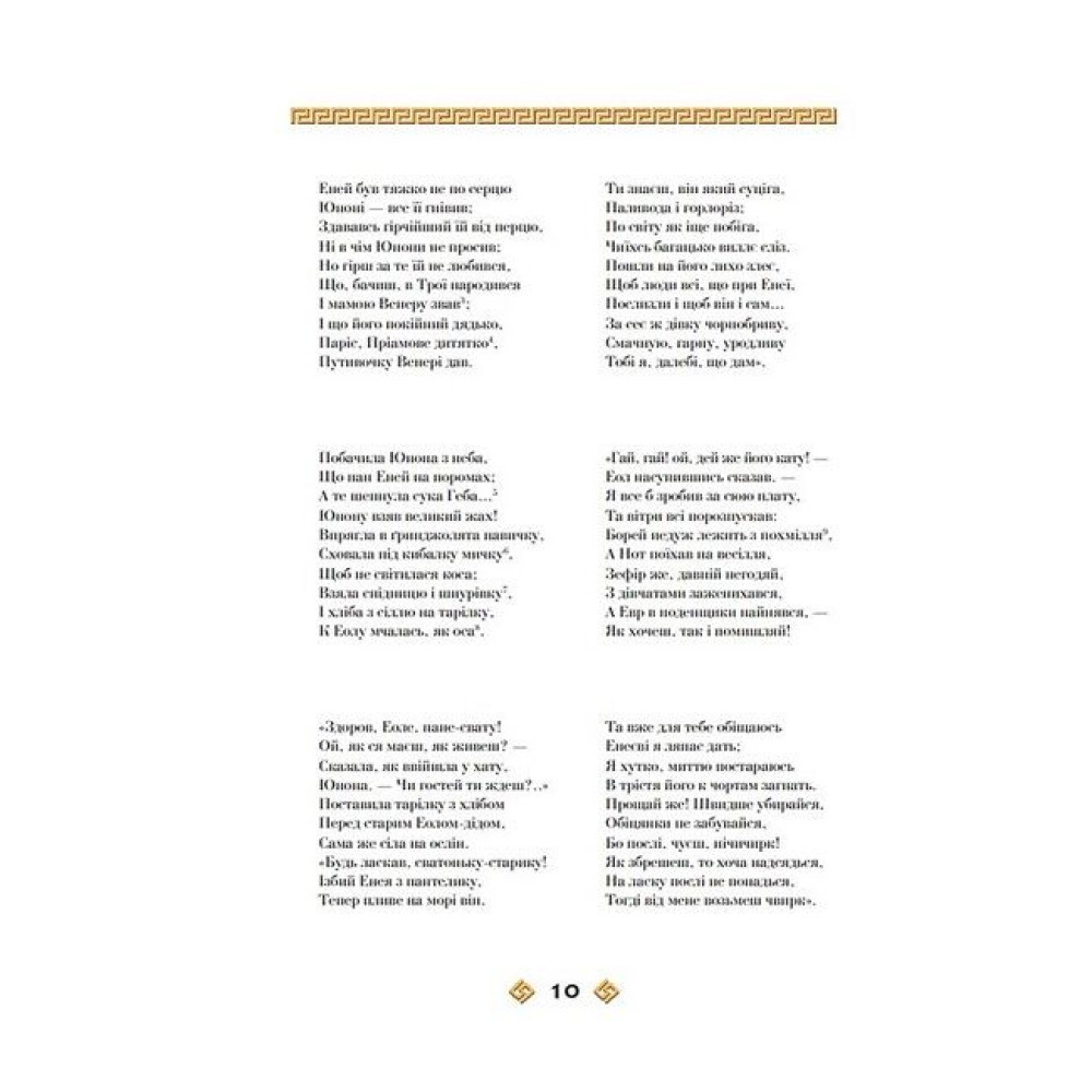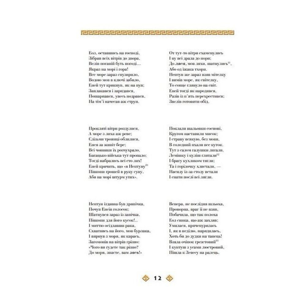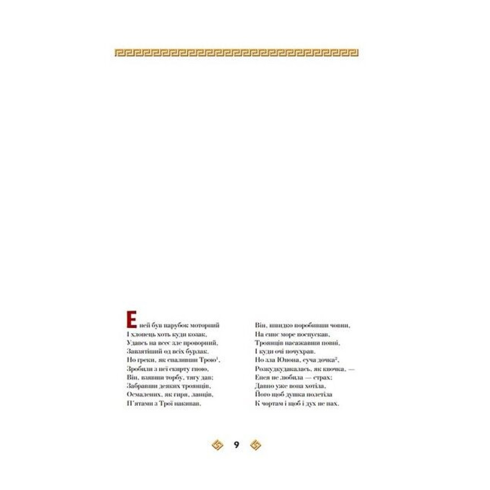 Ім’я Івана Петровича Котляревського (1769—1838), засновника нової української літератури, пов’язують, у першу чергу, з його поемою «Енеїда» (1798). Це була перша друкована українська книга, написана народною мовою, перша національна поема.Запозичивши сюжет античної поеми Вергілія, Котляревський наповнив цей твір дотепним українським гумором, повір’ями, звичаями, картинами воєнного і мирного життя, описом одягу, страв — усе це надає поемі яскравого національного колориту. «Енеїду» сміливо можна назвати своєрідною енциклопедією українського побуту кінця ХVІІІ — початку ХІХ століття.В книзі вміщено ілюстрації видатного українського художника Анатолія Базилевича.Оправа книжки виготовлена з матеріалу на тканинній основі. Обріз зафарбований. Папір - Імперіал. Шовкове лясе. Колір книги - жовто-гарячий.