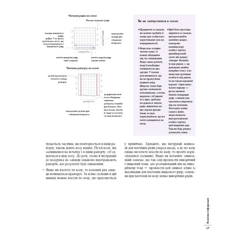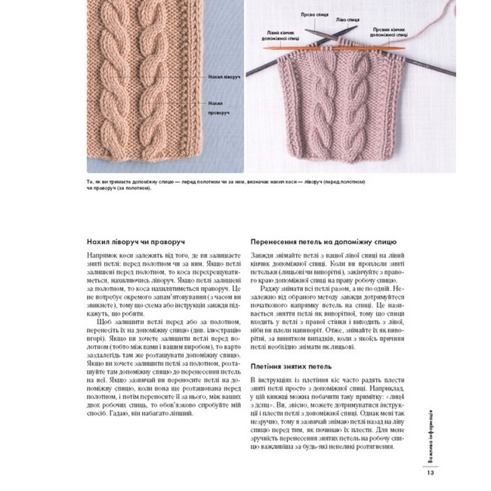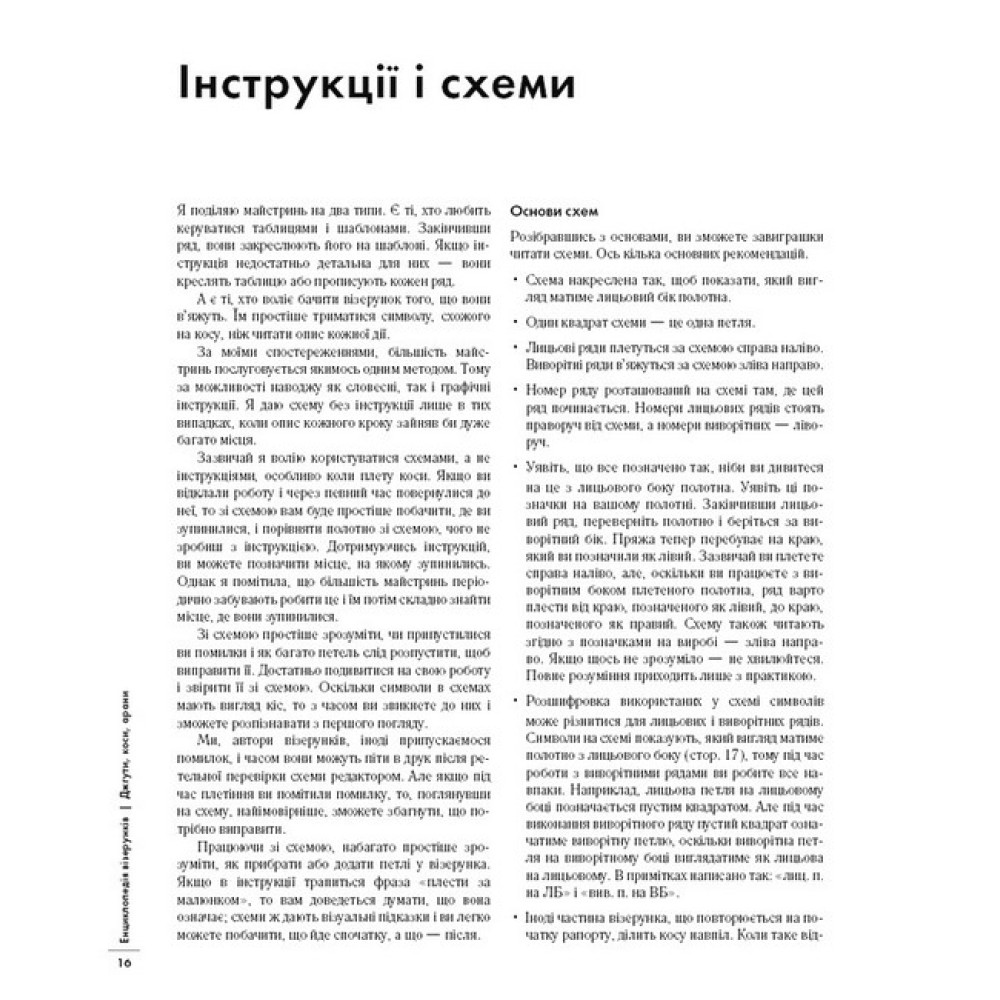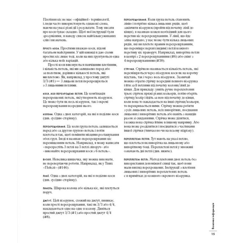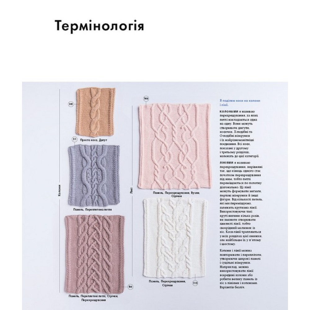 У цьому посібнику для сучасної майстрині наведено не лише понад 150 унікальних та інноваційних авторських візерунків і дизайнів від найпростіших до найскладніших. У ньому ви знайдете вичерпну інформацію про призначення тих чи тих візерунків, як їх правильно припасовувати й варіювати, створюючи нові дизайни. Із цієї унікальної книги ви довідаєтеся, як безпосередньо зможете створювати свої моделі плетеного одягу.Якщо ви прагнете крокувати в ногу з модою і носити унікальний авторський одяг — ця книга для вас! Почавши з основ плетіння, Нора Ґоан поділиться з вами усіма секретами створення плетеного полотна, поєднання деталей одягу, розрахунку кількості петель і відповідності деталей викрійці. Авторка пропонує понад 150 візерунків для плетіння у вигляді як схем, так і порядкових описів, а також оригінальну систему поєднання та підбору джгутів у проектах. Вона розкриває свій алгоритм створення нових візерунків, який стане вам у пригоді під час створення нових моделей. У книзі ви також знайдете 15 моделей одягу, які можна плести за наданими схемами або використовувати як шаблони для нових унікальних комбінацій джгутів.Завдяки докладним інструкціям, ви зможете:опанувати основи плетіння джгутів, кіс і аран;навчитися органічно вплітати ці елементи в деталі одягу;гармонійно поєднувати мотиви й створювати авторські моделі.
