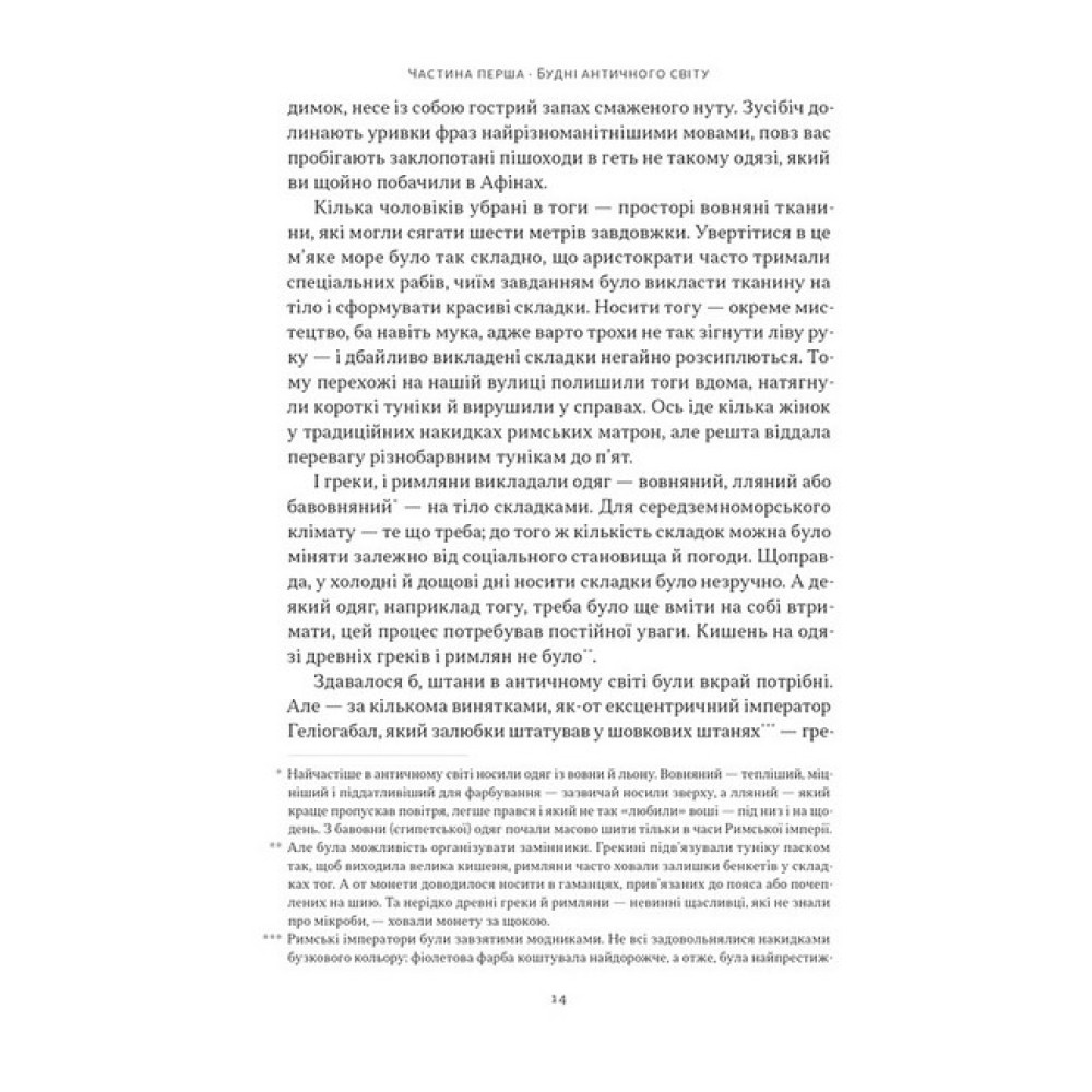 Чому греки не носили штанів, а у вино додавали порошок мармуру? На якій дієті сиділи гладіатори і скільки заробляли талановиті спортсмени? Що про військову медицину можна дізнатися з «Іліади»? Це лише частина запитань, на які відповідає Ґаррет Раян.Він пише просто й цікаво, а ще — зосереджується не так на постатях і подіях, як на деталях із повсякденного життя. Як ставилися до стосунків і через що розлучалися, як робили операції та які використовували контрацептиви, коли в тренді були бороди, а коли ні. Автор не заявляє про всеохопність, але претендує на захопливість.У цій книжці є оракули та шпигуни, Рим і Афіни, Спарта й Карфаген, Цезар і Нерон, язичники та християни, леви на арені й домашні улюбленці. Немає хіба занудства й намагання розповісти найвичерпнішу історію античності.Ґаррет Раян — науковець, письменник, мандрівник. Вивчав античність у Карлтонському коледжі, здобув докторський ступінь з історії Греції та Риму в Мічиганському університеті, викладав у кількох вишах. Автор двох захопливих книжок про античність, ютуб-каналу toldinstone і блогу про подорожі.