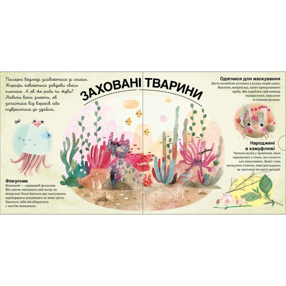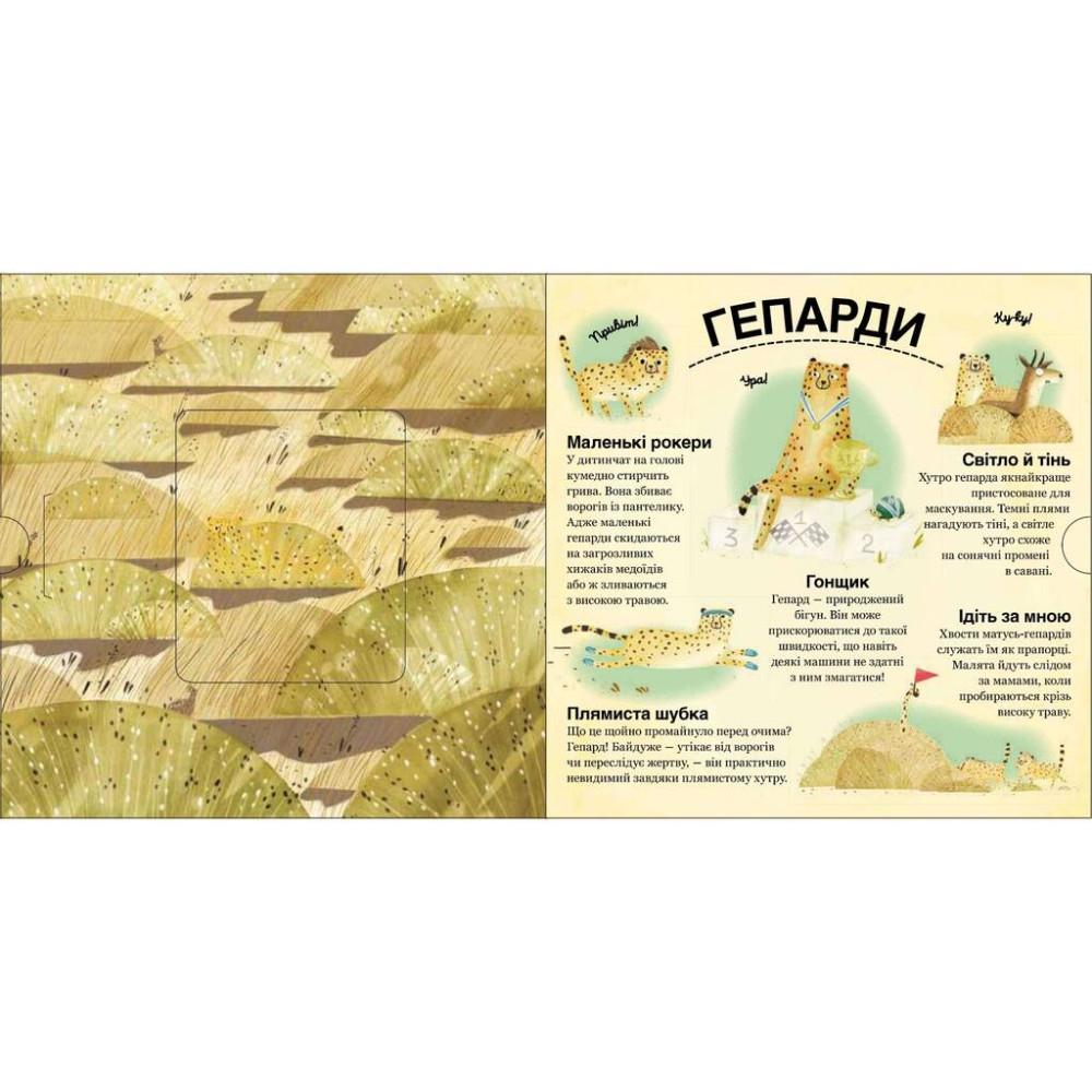 У пустелі, в африканській савані, чи в морських водах знайдуться створіння неперевершені у грі в хованки. Спробуймо перевірити чи відшукаєш ти їх усіх? Легко та захопливо — через гру ця книжка створена саме для того, щоб пізнавати світ було цікаво.