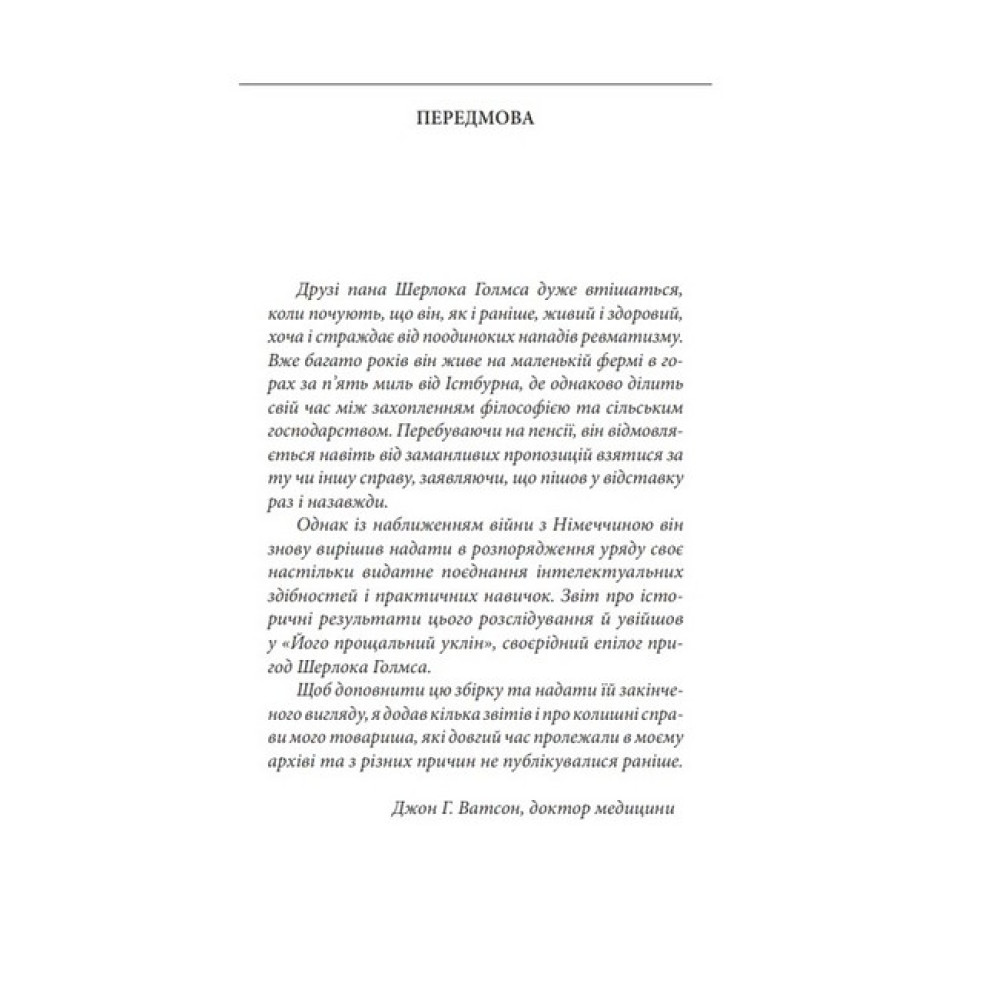Сер Артур Ігнатіус Конан Дойл (1859—1930) — англійський лікар і письменник, ім’я якого нерозривно пов’язане із легендарним літературним героєм — сищиком Шерлоком Голмсом, який володіє дедуктивним методом не гірше, ніж смичком улюбленої скрипки. «Родзинкою» «самітника із Бейкер-стрит», який не знає собі рівних в умінні розплутати найскладніший злочин, стали інтелектуальність, іронічність і духовний аристократизм. Характери Шерлока Голмса та його приятеля доктора Ватсона були показані настільки яскраво, що здавалися реальними. А згодом на скромній лондонській вулиці Бейкер-стрит з’явився будинок Шерлока Голмса, який щороку приймає мільйони відвідувачів з усього світу. Сам же Голмс увійшов до Книги рекордів Гіннеса як найбільш екранізований літературний персонаж. До цієї збірки, виданої в розпал Першої світової війни, 1917 року, ввійшли вісім оповідань, написаних переважно в 1910-ті роки. Автор розповідає про кращого німецького шпигуна в Англії, фон Борка, який готується до від'їзду на батьківщину із секретними документами і якому невтямки, що Шерлок Голмс уже вийшов на його слід («Його прощальний уклін»). «Пригода з картонним пуделком», «Випадок із багряним колом», «Зникнення леді Френсіс Карфекс» — в усіх цих справах, за словами того ж таки доктора Ватсона, славетний сищик справді «перевершує самого себе».