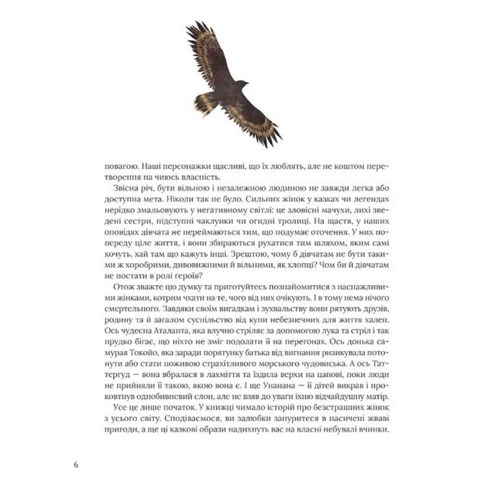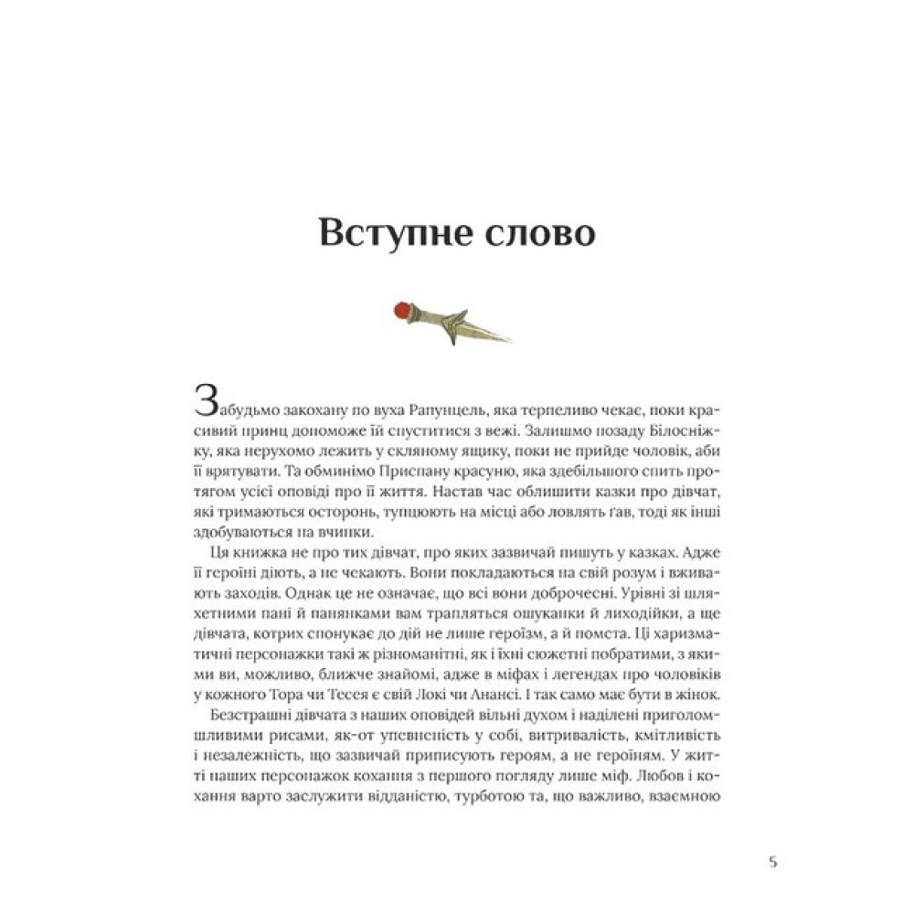 Справжні героїні знають: «довго і щасливо» — це те, за що варто боротися. «Казки для відважних дівчат» — книжка, у якій звеличено п’ятнадцять персонажок народних казок, які беруть власні долі у свої руки та прокладають свій шлях у житті. Знайомтеся: відважна Брадаманта вирушає на битву верхи на летючому коні, Унанана рятує своїх дітей із черева слона, маленька Моллі Вуппі виявляється доволі кмітливою, щоб обдурити велетня, та ще багато інших відважних героїнь, яким присвячено цю чудово ілюстровану книжку.