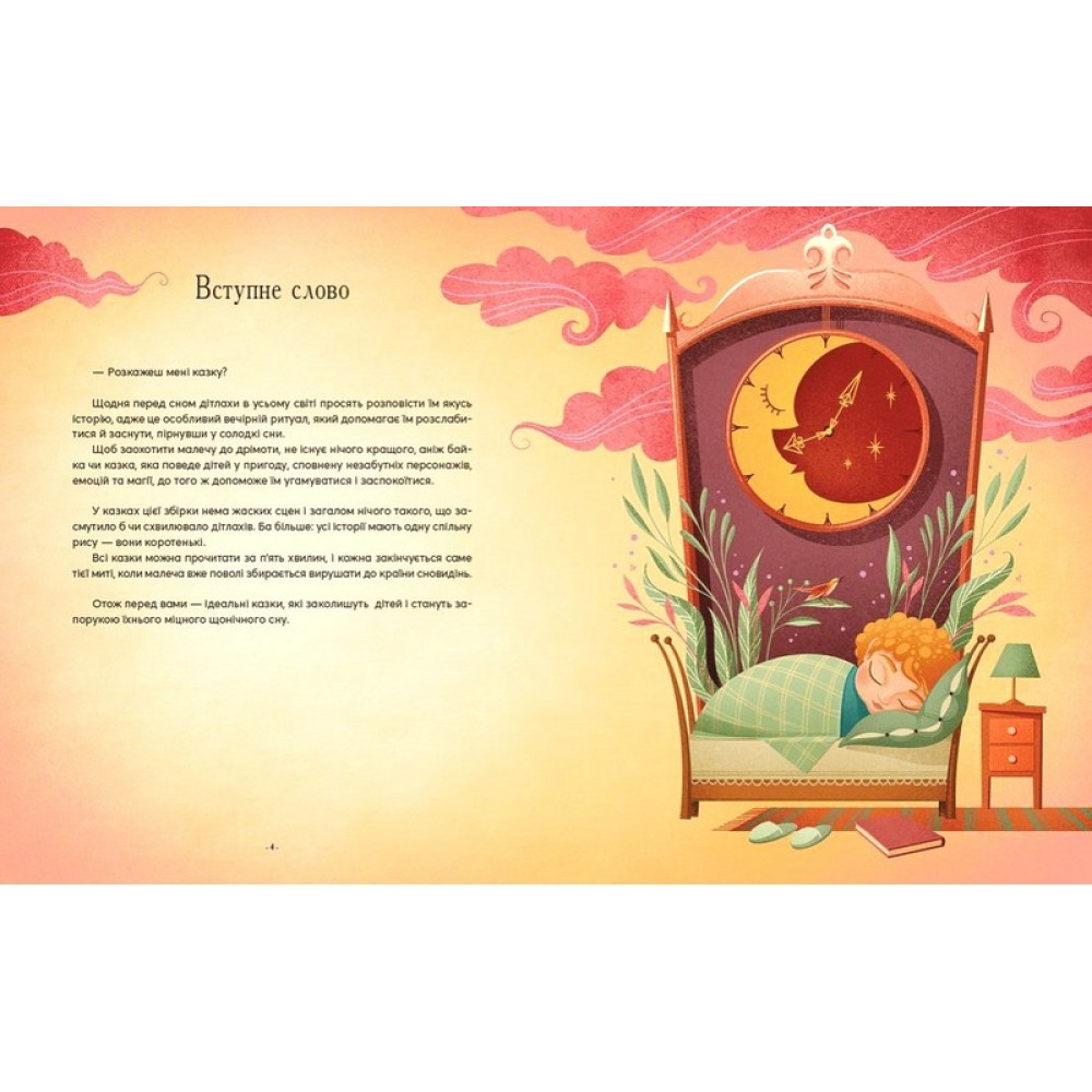 «Розкажеш мені казочку?» Щовечора це питання стає частиною ритуалу, який допомагає дітям заспокоїтися після активного дня й побачити солодкі сни. Збірка зворушливих історій із яскравими персонажами, емоціями та чарівними моментами якнайкраще заспокоїть малюків перед сном. До того ж усі казки мають дещо спільне — стислість. Кожну можна прочитати за п’ять хвилин! Так що незабаром повіки малюків поважчають, і вони спокійно поринуть у дрімоту. Це ідеальні казки, які допоможуть заколисати дітлахів, гарантуючи солодкі сни ніч за ніччю.