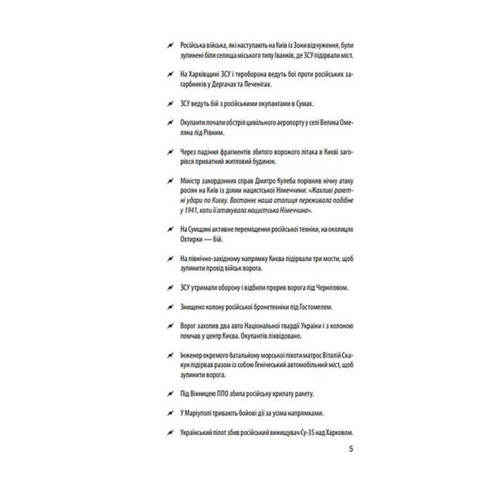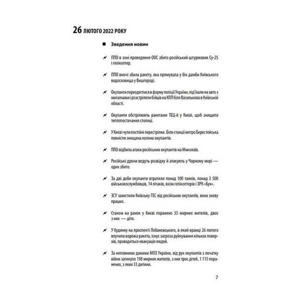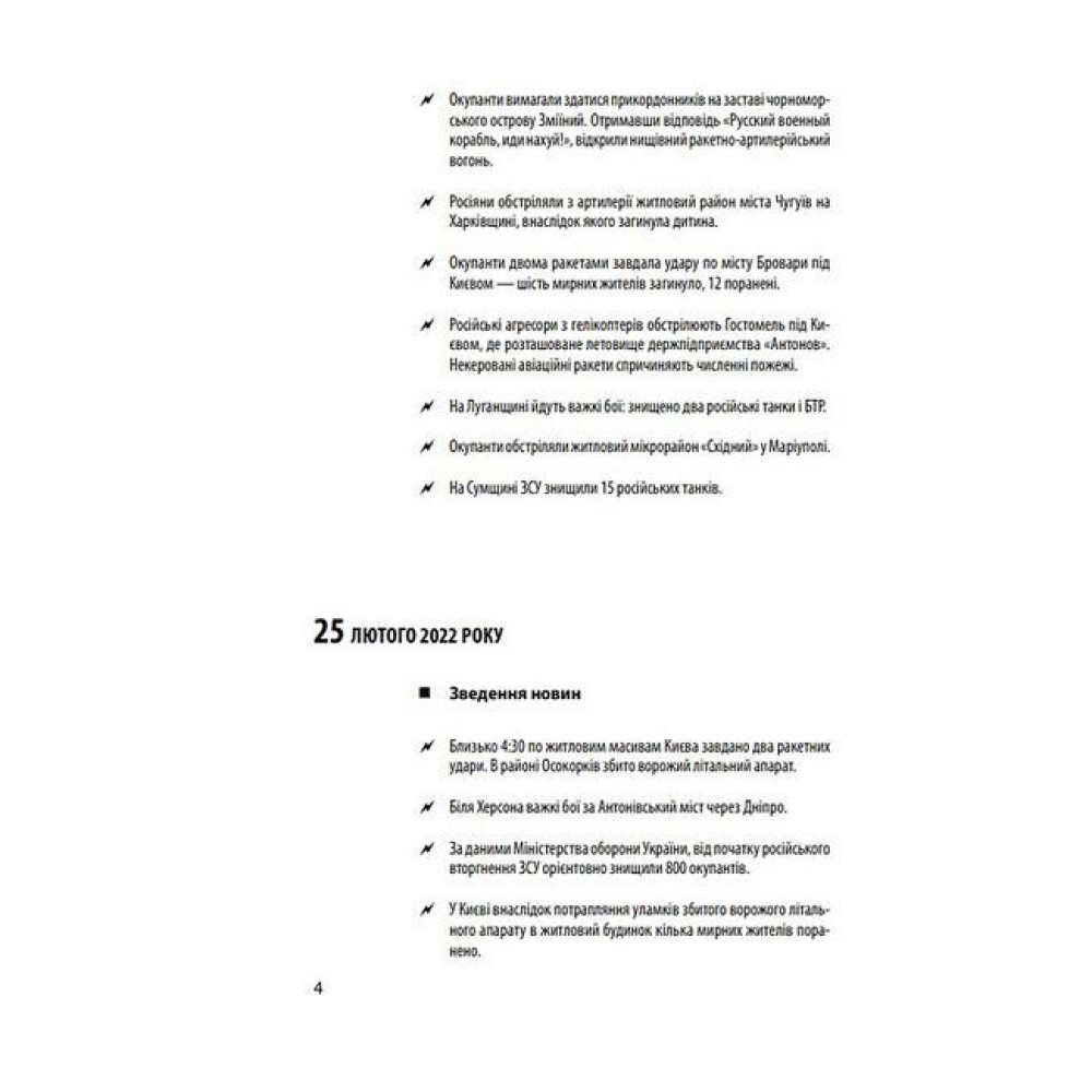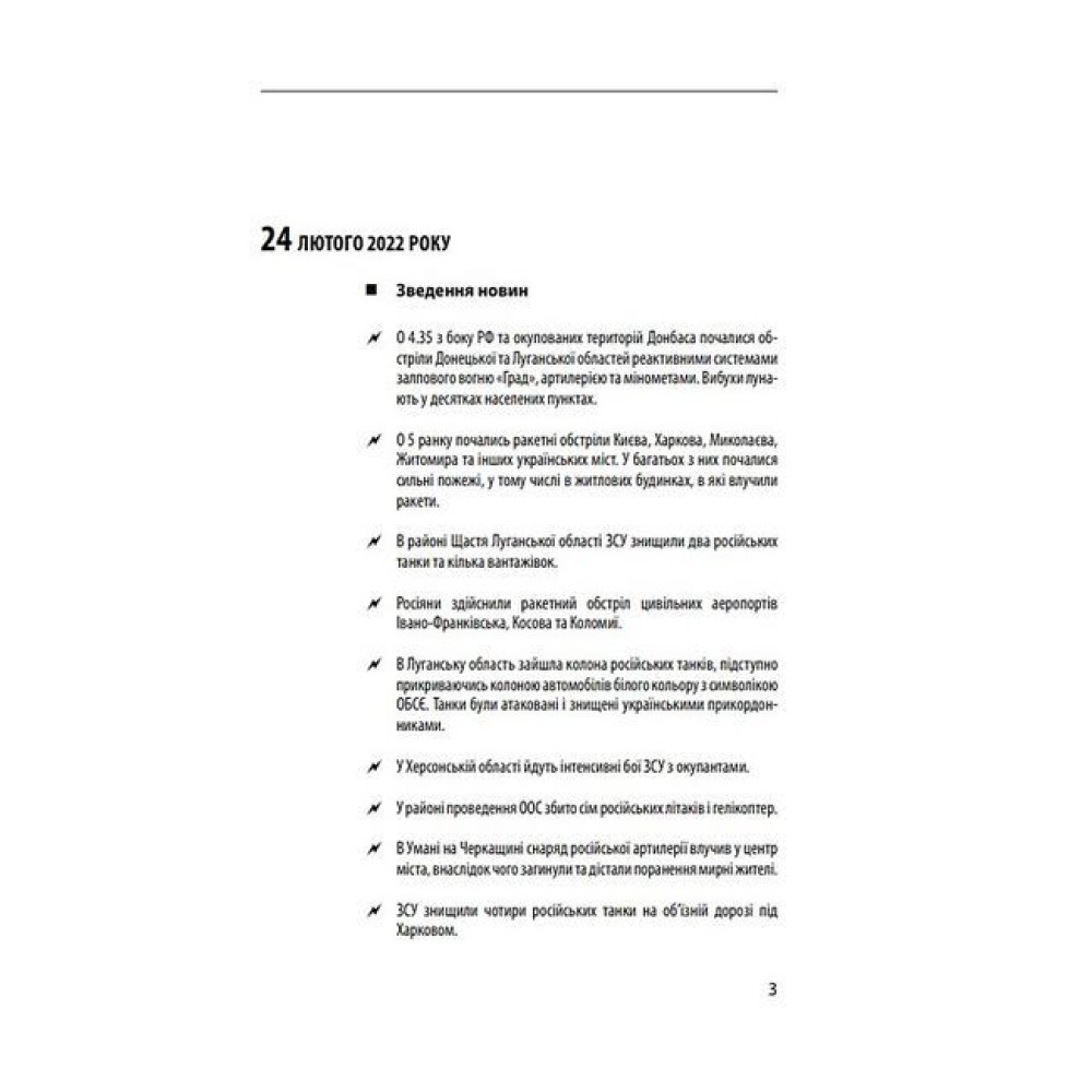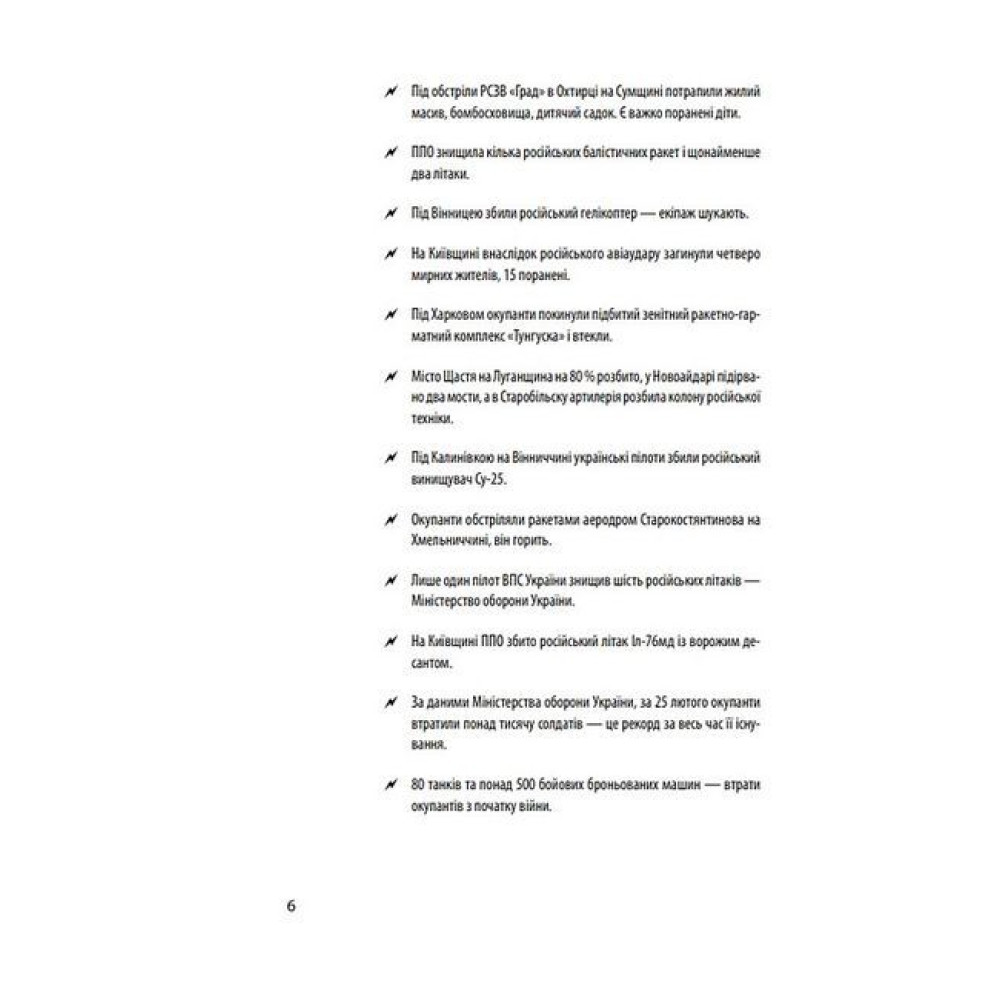 Документальна хроніка повномасштабного вторгнення Росії в Україну нагадує читачу про трагічні та героїчні події шести перших місяців гарячої фази війни з 24 лютого до 24 серпня 2022 року. Ворог планував «блискавично» підкорити країну, вбиваючи мирних мешканців і знищуючи міста, але українці героїчно чинили опір. Кремль не зміг реалізувати план швидкого захоплення України та зміни влади в країні. Головною перепоною для окупантів стали єдність українців та стійкість ЗСУ разом з іншими силами оборони України, а ціною опору — тисячі жертв серед цивільного населення, зруйновані долі мільйонів українців через втрату близьких, дому, колишнього життя. Війна створила нові ризики економічного характеру. Світу загрожують паливна і продовольча кризи. Наш неймовірний опір агресору відкрив очі Заходу, ЄС і НАТО, на те, чим насправді є Росія та її «друга армія». Рівень солідарності європейців з українцями безпрецедентний. Українці зі зброєю в руках захищають спокій Європи. У книзі хронологічно впорядковано публікації щоденних новин, повідомлення з офіційних джерел.