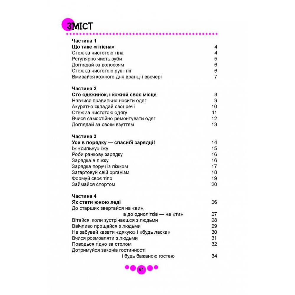Ця книга призначена для дівчаток 5–8 років. У легкій і доступній формі в ній розказується про гігієну, здоров’я, культуру поведінки, правила спілкування; пропонуються цікаві ідеї виробів, які можна зробити власноруч. Мета цієї книги — викликати у дитини бажання слідкувати за своєю зовнішністю, бути акуратною, охайною, чемною, уважно ставитися до людей, одним словом, бути справжньою леді. У книзі використані матеріали різних довідників і енциклопедій, що робить її пізнавальною і цікавою.