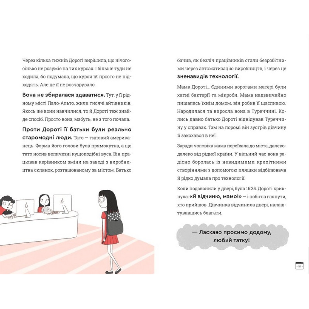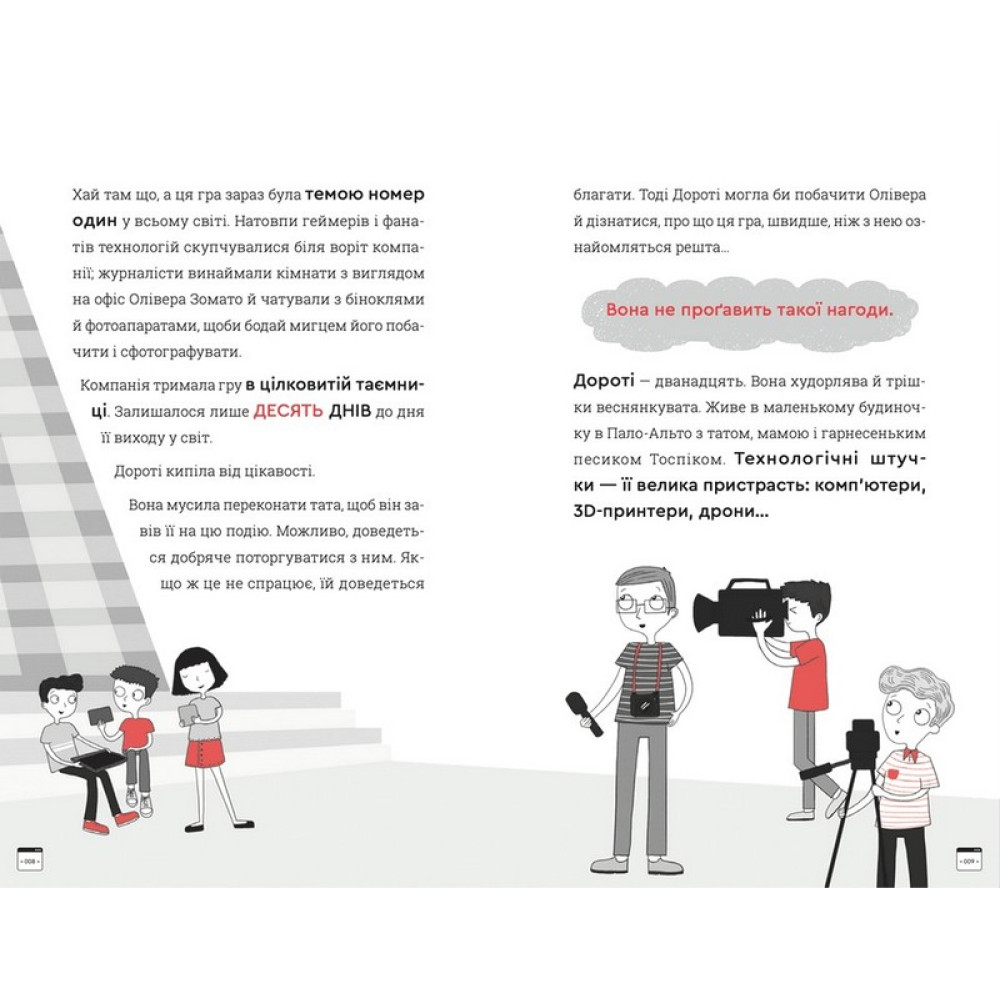 Дванадцятирічна Дороті захоплюється комп’ютерами, 3D-принтерами, дронами й подібними технологічними штучками. У майбутньому дівчинка планує стати айтівницею. Саме в її містечку Пало-Альто відомий на весь світ розробник Олівер Зомато ось-ось представить найбільш очікувану фанатами комп’ютерну гру. Дороті мріє побувати на презентації — але батьки її не підтримують. Засмучена Дороті йде на прогулянку, на якій знаходить дивні окуляри — і разом зі своїм маленьким песиком Тоспіком потрапляє у дивовижну пригоду.Герої казкової історії — Опудало, Робот-Тесля, страшний Лев та інші — допоможуть дітям зрозуміти, що таке алгоритми, умови, цикли, у чому суть бінарного методу й техніки п’яти «чому».Книжка зацікавить дітей, що планують опанувати основи програмування.