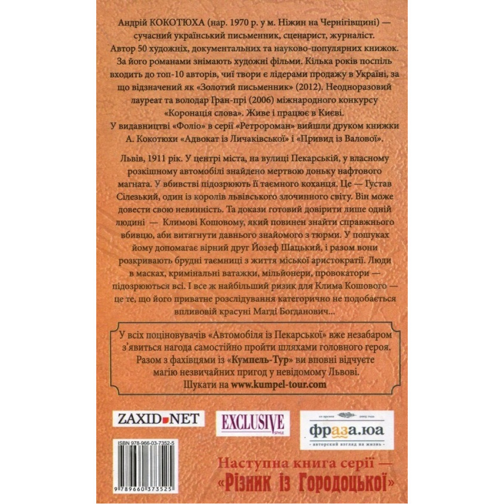 Львів, 1911 рік. У центрі міста, на вулиці Пекарській, у власному розкішному автомобілі знайдено мертвою доньку нафтового магната. У вбивстві підозрюють її таємного коханця. Це - Густав Сілезький, один із королів львівського злочинного світу. Він може довести свою невинність, та докази готовий довірити лише одній людині - Климу Кошовому. Тепер герой повинен знайти справжнього вбивцю, аби витягнути давнього знайомого з тюрми. У пошуках йому допомагає вірний друг Йозеф Шацький, і разом вони розкривають брудні таємниці з життя міської аристократії. Люди в масках, кримінальні ватажки, мільйонери, провокатори - підозрюються всі. І все ж найбільший ризик для Клима Кошового - його приватне розслідування категорично не подобається впливовій красуні Магді Богданович...