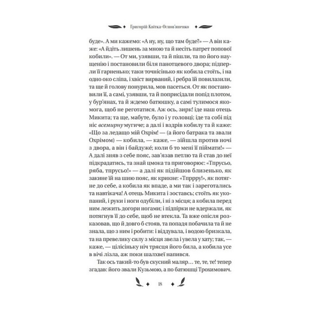 Вперше за останні сто років проза Григорія Квітки-Основ’яненка повертається до читачів такою, як вона була насправді. Зі своїм ритмом та особливою слобожанською говіркою. Мстиві відьми, мерці, які справляють Великдень, зачаровані скарби, перекотиполе — свідок проти вбивці… Перед нами постає яскрава й містична картина життя на українських землях від Конотопа до Харкова. Повісті Квітки-Основ’яненка — це ще і європейські сюжети, перенесені на вітчизняний ґрунт, проповіді, літературна полеміка, мовна гра. І про це ніколи не пишуть у підручниках. • Сатирично-фантастична повість «Конотопська відьма» є яскравим зліпком переживань, думок та способу життя людей на початку ХІХ століття. Майстерно і точно передає письменник характери своїх колоритних персонажів — настільки, що вони не лише оживають в уяві, але й стали архетипами для укрліту. • Візьміть до рук саме цю книжку, якщо лише починаєте відкривати для себе прозу Квітки-Основ’яненка. А також, коли плануєте більше заглибитися в особливості розвитку українського слова в його колисці й осередку становлення — на Слобожанщині у перші десятиліття позаминулого століття. Гарантуємо, подорож на такій «машині часу» не лише пізнавальна, але й неабияк дотепна!Про автора Геній Григорія Квітки-Основ’яненка важко переоцінити — саме йому належить честь засновника жанрів художньої прози та соціально-побутової комедії в українській літературі. Письменник зіграв велику роль в розвитку нашої мови, брав участь у виданні першого українського журналу «Український Вісник», долучився до створення професійного театру у Харкові. Тонкий психологізм і знання людської душі роблять його твори близькими читачеві й понині.