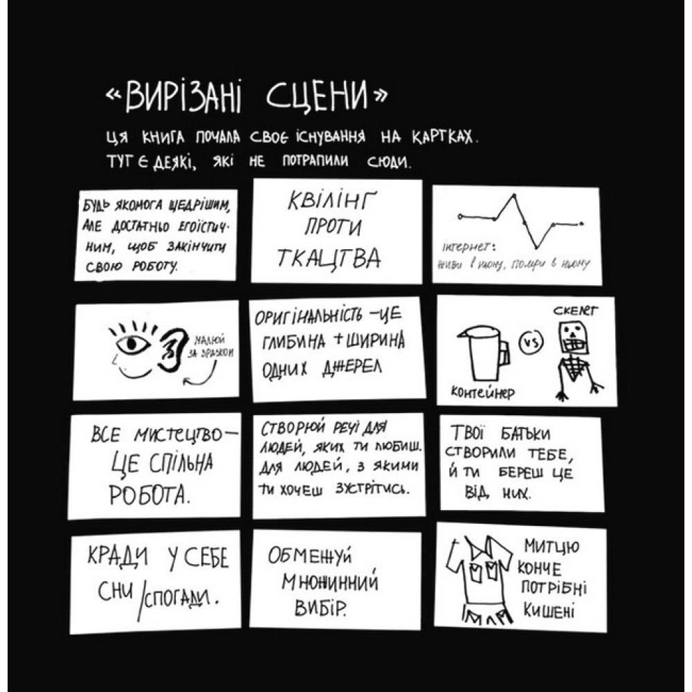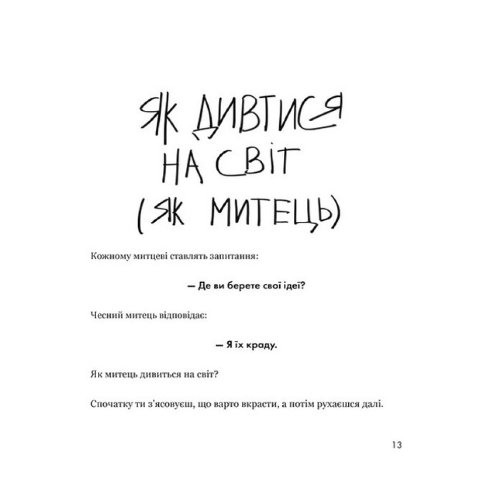 «Кради як митець»— маніфест до всіх творчих людей, тобто до вас (ким би ви не були за фахом та чим би не займалися у житті)!Остін Клеон — відомий художник, дизайнер, письменник й просто непересічна особистість — створив оригінальний, повний чудових ілюстрацій, прикладів та вправ путівник, що допоможе відкрити чи посилити художні якості вашого характеру. «Мислити творчо може кожний!», — стверджує автор. У світі ніщо не є оригінальним, ідеї не беруться з повітря — їх можна «вкрасти»! Тож відкрийте серце для творчості й «крадіть» чесно.Книжка розповість, як це зробити, щоб не просто наслідувати інших, а створювати щось нове! Завдяки наведеним прикладам, ілюстраціям, порадам ви навчитеся переробляти та переосмислювати чужі ідеї та народжувати власні шедеври. Тож шукай, наслідуй, твори!Книги зараз надруковано понад півмільйона примірників і перекладено на понад двадцять сім мов. Найпопулярніша книга Amazon 2012 року.