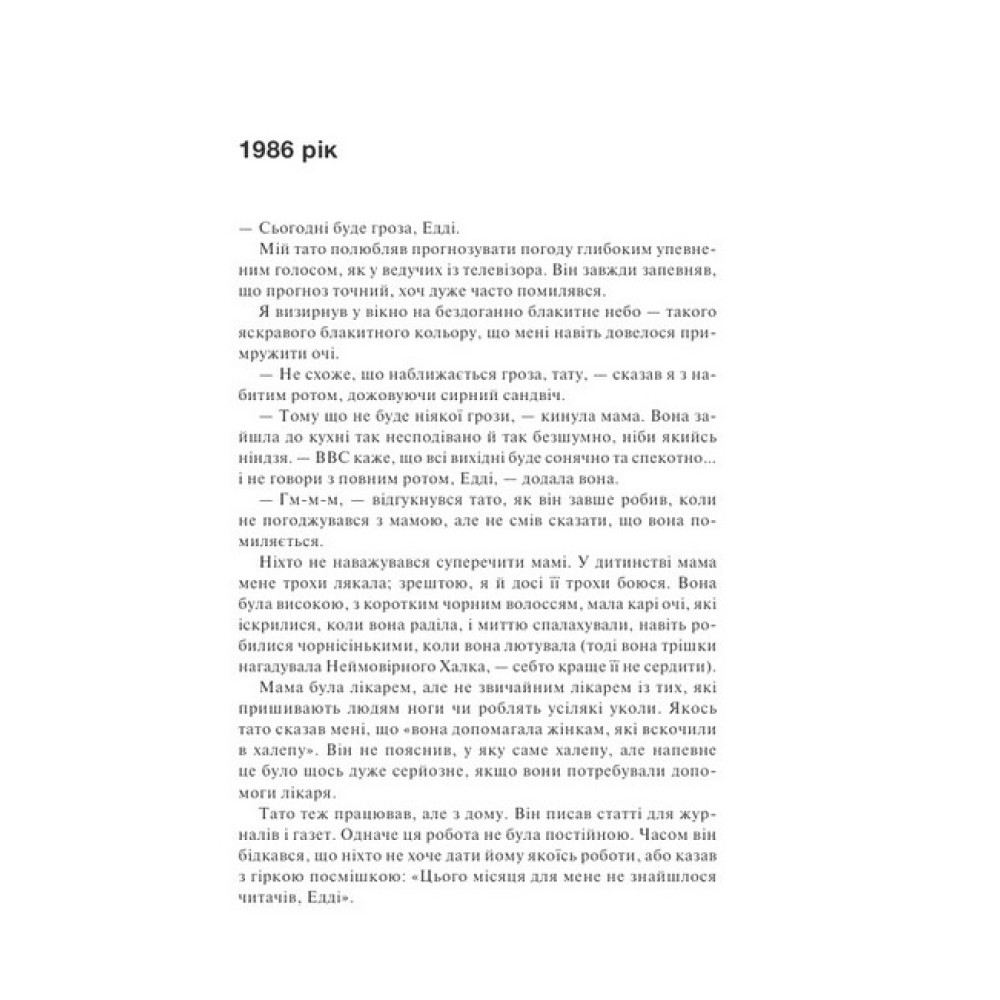 Увага! Продукція сексуального характеру або інша продукція з віковим обмеженням. Продаж неповнолітнім заборонено. Продаж відповідно до вікового обмеження.Переклад роману вже виданий у 27 країнах світуАвторку порівнюють із культовим Стівеном КінгомУ кожного є Таємниця. І краще не знати яка…П’ятеро друзів — Едді Мюнстер, Гладкий Ґев, Металевий Міккі, Гоппо і Нікі — давно виросли з того віку, коли для спілкування використовували зашифровані послання, написані кольоровою крейдою. Але минуле не стирається так само легко, як крейда з пальців. Сорокарічний Ед усе ще пам’ятає, як він і його шкільний учитель урятували дівчину Елізу. І пам’ятає її обезголовлений труп, який знайшли в лісі… Через багато років Ед Адамс зустрічається з Міккі, який заявляє, що знайшов убивцю Елізи. Наступного дня його самого знаходять мертвим, із намальованим крейдяним чоловічком у кишені. Друзі розуміють: те, від чого вони втікали, повернулося. На згадку про минуле в кожного з них лишилася не тільки крейда під нігтями, але й кров. Чия вона?..Про автора: С. Дж. Тюдор — сучасна британська письменниця, нове ім’я в жанрі гостросюжетного психологічного трилера. Її роман «Крейдяна Людина» підкорив десятки країн і продовжує завойовувати популярність. Незвичний сюжет у кращих традиціях Стівена Кінга і Гарлана Кобена гарантує повне занурення у зловісну атмосферу нерозгаданої таємниці.