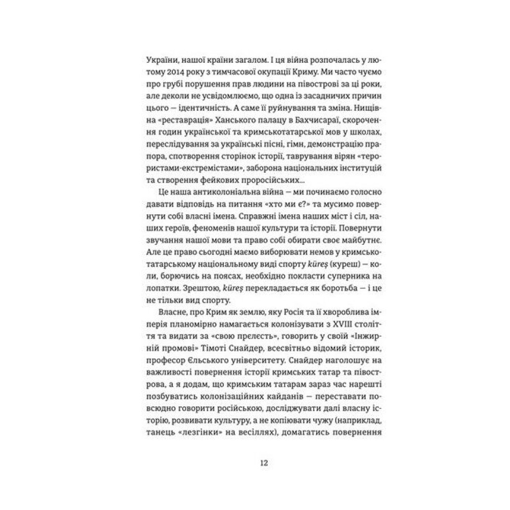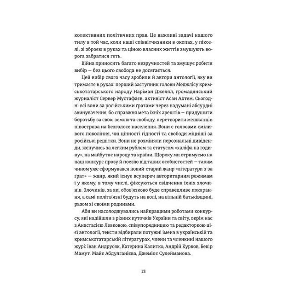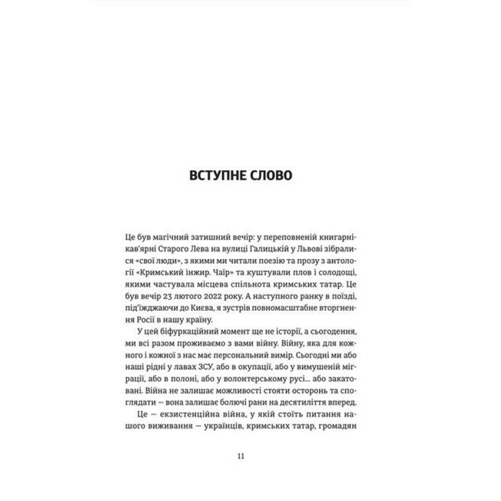 Антологія є результатом четвертого письменницько-перекладацького конкурсу «Кримський інжир» (2021–2022). У ній традиційно зібрано найкращі твори, подані на конкурс, українською та кримськотатарською мовами. Ці твори надійшли з різних куточків України та світу, а деякі автори, зокрема перший заступник голови Меджлісу кримськотатарського народу Наріман Джелял, громадянський журналіст Сервер Мустафаєв, активіст Асан Ахтем перебувають нині за російськими ґратами через надумані абсурдні звинувачення, справжня мета яких — придушити боротьбу за свою землю та свободу. Поезія та проза, перекладні тексти дадуть змогу широкому колу читачів більше дізнатися про автентичну культуру Криму, ознайомитися з класиками й сучасниками української та кримськотатарської літератур, відкрити для себе історії минувшини та сучасні реалії життя півострова. Новацією книжки є те, що твори кримськотатарською мовою, в оригіналі написані кирилицею, паралельно подано й латинічною графікою, оскільки на сьогодні кримськотатарська мова офіційно перейшла на цю графіку. У Криму вона де-факто зараз під забороною.