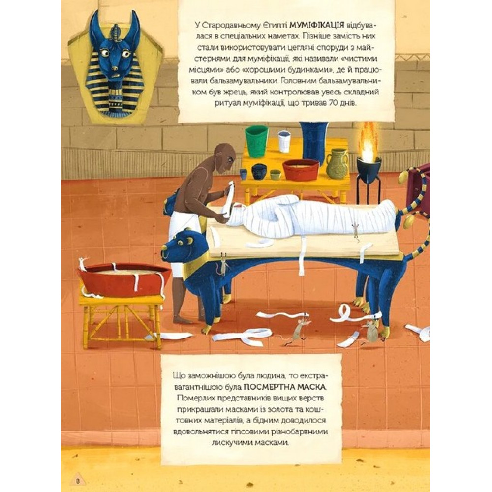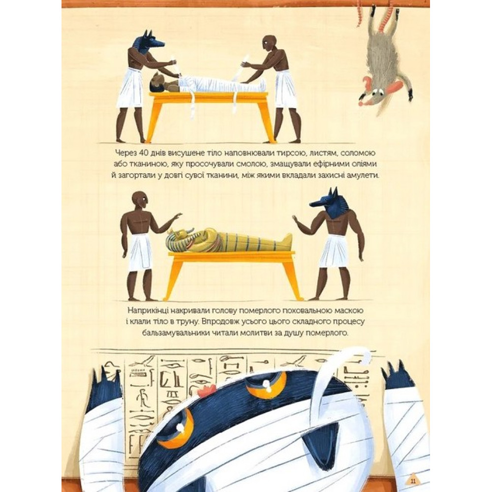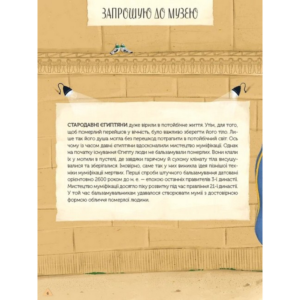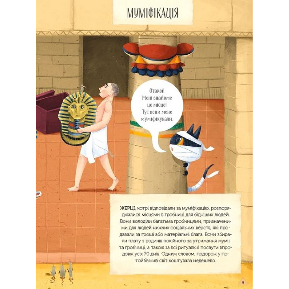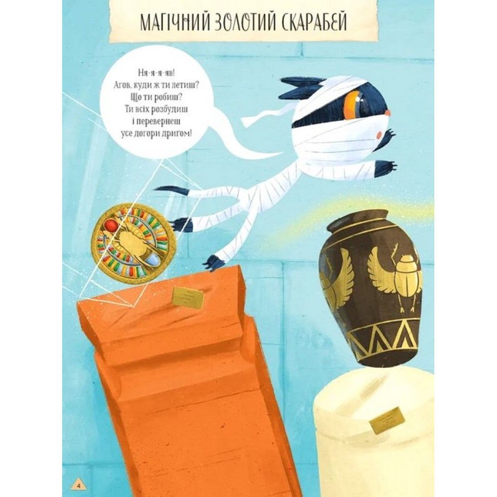 Нумо навздогін за магічним скарабеєм! Хтось вважає музеї цікавими, а хтось — нудними. А якщо сповнити музей магії та чарів — це буде вже щось інакше. Якщо не вірите, розгорніть цю книжку — і дещо відбудеться. Закляття священного скарабея подіє: музейні експонати Стародавнього Єгипту оживуть, а з ними котик, який ще пам’ятає Клеопатру. Завдання котика полягає в тому, щоб усе привести до ладу, спіймати скарабея та зняти закляття. Утім, ця справа нелегка. Разом із котиком та сірими помічницями-мишками ви пробіжитеся музеєм навздогін за чарівним скарабеєм. На цьому шляху мимохідь ви дізнаєтеся багато цікавого про неймовірну цивілізацію Стародавнього Єгипту.