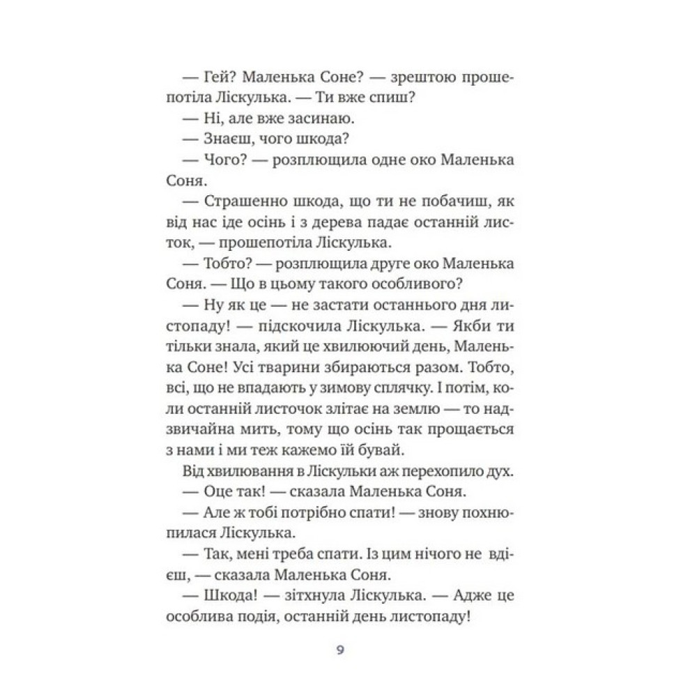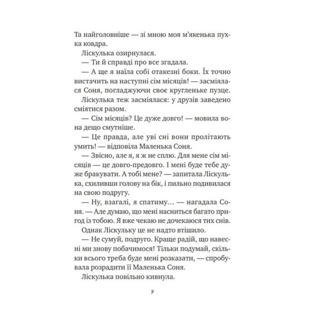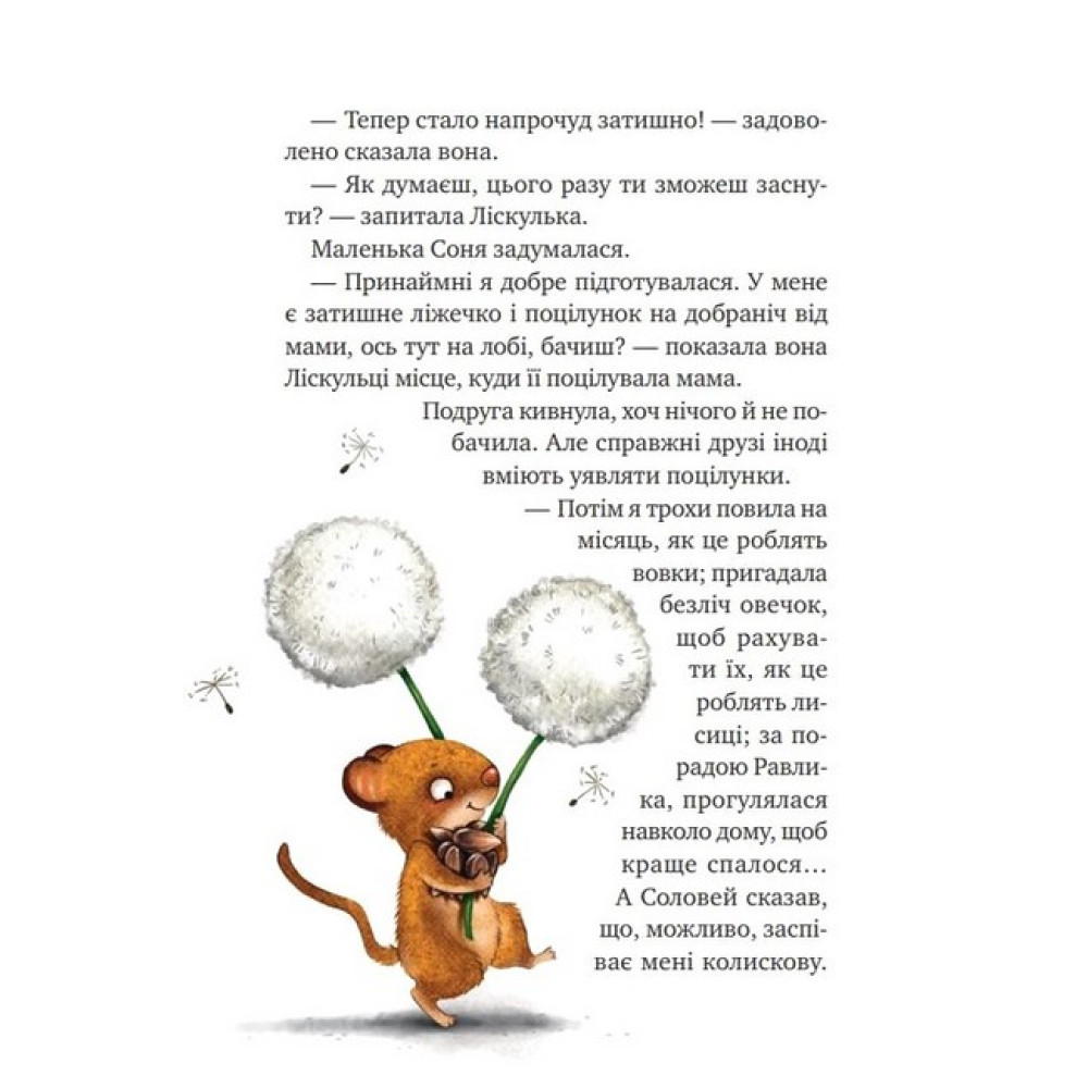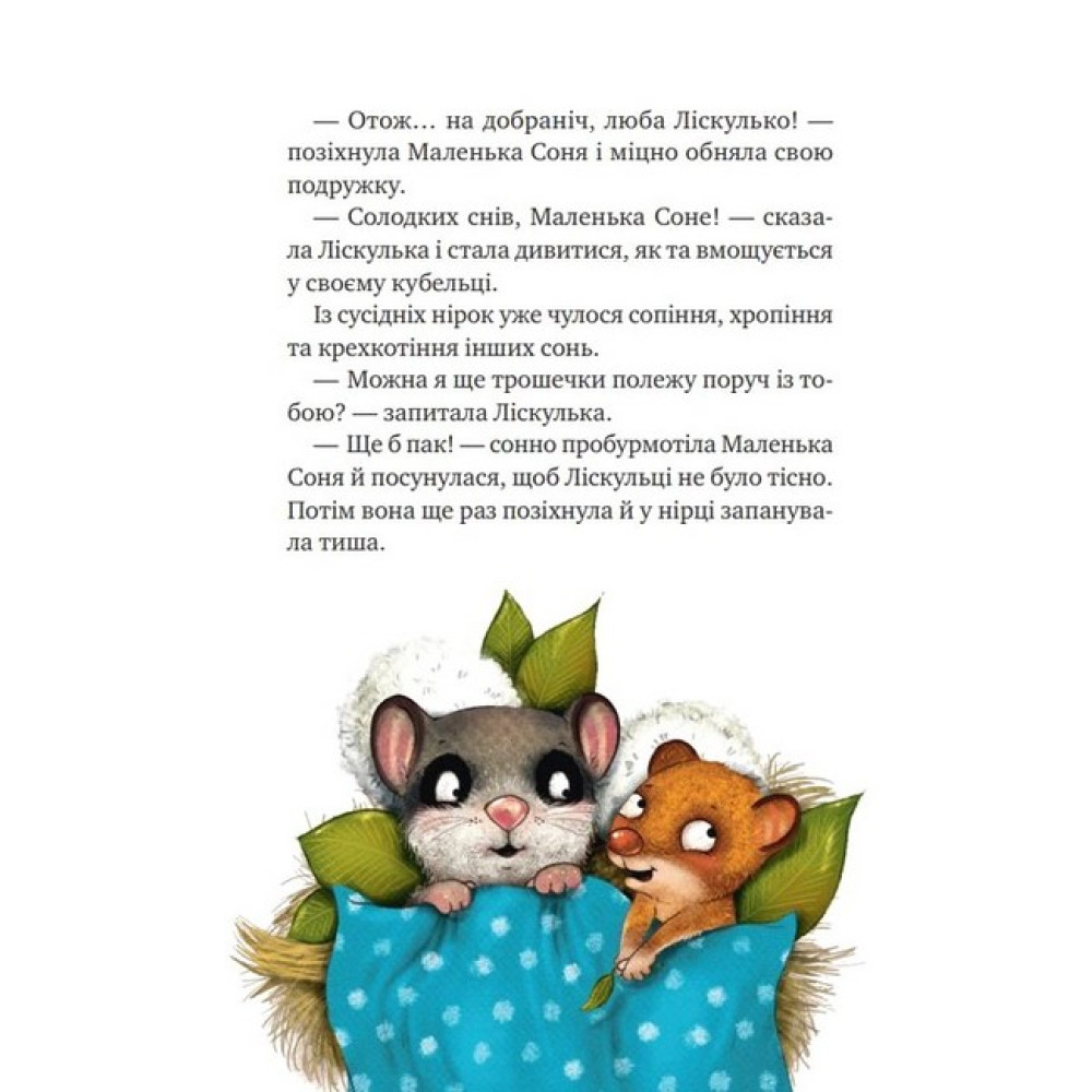 Восени Маленька Соня впадає у сплячку аж на сім місяців. Тому вона ніколи не бачить, як із дерева падає останній осінній листочок, не знає, як пахне перший сніг і як лоскоче в пузці від їзди з гірки на колоді. Але цьогоріч Ліскулька, найліпша подружка Маленької Соні, не дасть малій проґавити найвеселіші миті зими. Зрештою, що станеться, якщо та засне не сьогодні, а трішки згодом? Ця затишна книжечка, повна оповідок про зимові пригоди, огортає турботою і дарує найдивовижніші сновидіння всім маленьким соням.