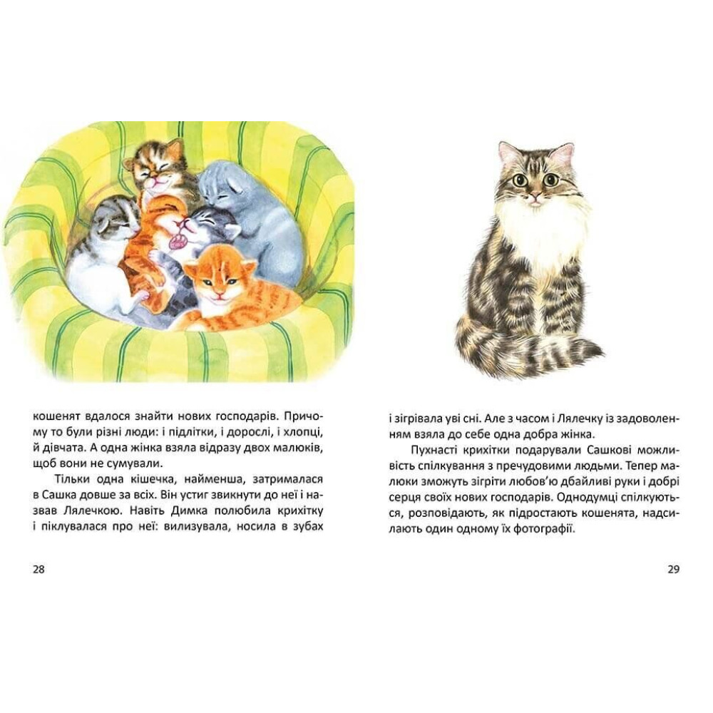 У нашу збірку ввійшли зворушливі оповідання про тварин. Такі книги формують ставлення до оточуючих, виховують дитину, роблять її уважною, чуйною людиною. Дуже важливо, щоб саме в ранньому віці малюк познайомився із захоплю-ючими історіями про тварин, щоб його душа збагатилася переживаннями про братів наших менших. Це ще більш важливо для сучасних дітей, у яких комп'ютерні ігри часто замінюють спілкування з живою природою. Наша книга адресована юним читачам, які роблять перші кроки самостійного читання. Саме тому тут використовується великий шрифт, а барвисті ілюстрації спонукають розглядати деталі, розвивають увагу, уяву. Така книга обов'язково сподобається малюкам.