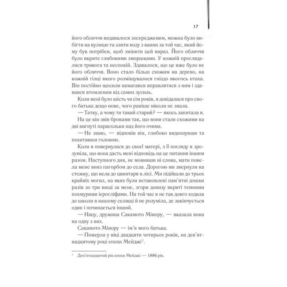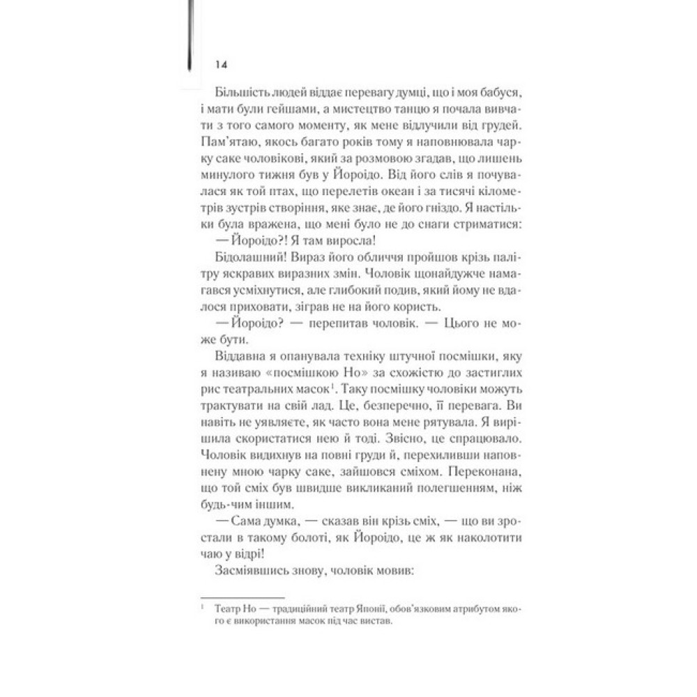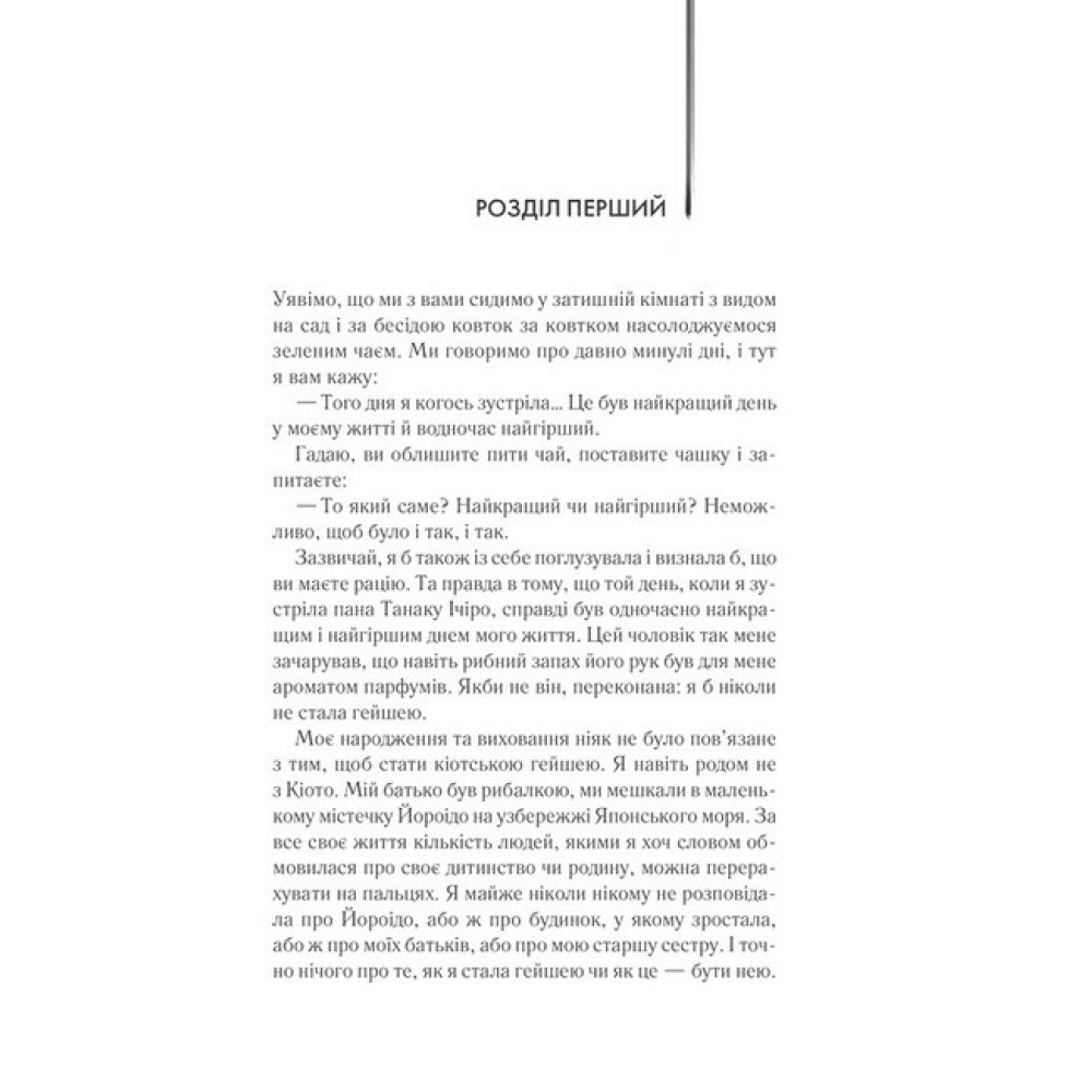 • 2 роки у списку бестселерів від New York Times • Серія художньої літератури «КУЛЬТREAD» • Блискуча екранізація Роба Маршалла здобула премії «Оскар», «BAFTA», «Золотий глобус» та «Греммі» Чійо було лише дев’ять, коли її продали до відомого будинку гейш. Там дівчинка з незвичайними сіро-блакитними очима вчиться бути втіленням витонченості: досконало танцювати, вишукано носити кімоно, відточеними рухами наливати клієнтам чай та саке, розважати їх розмовою й плести павутиння натяків, що так збуджують чоловіків і викликають ненависть суперниць.Із тихого рибальського містечка вона потрапляє у світ, де дівочу цноту продають на аукціоні, а кохання вважають небезпечною ілюзією. Її шлях до слави не буде легким. Та одного разу дівчина зустріне того, заради кого буде готова порушити всі правила...