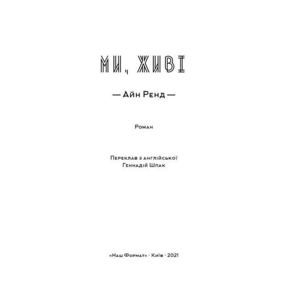 Людина проти держави, індивідуалізм проти колективізму, вільнодумство проти покори. Це нерівне протистояння, але Кіра Аргунова, донька колишніх аристократів, інакше не може. Вона точно знає, чого прагне від життя, і її бачення не вписується в радянську дійсність. Кіра хоче бути особистістю, а не гвинтиком. Зводити будинки зі скла й сталі, а не рвати жили на заводі. Ризикувати, а не сидіти склавши руки. Із Лео Коваленським — сином колишнього адмірала Балтійського флоту — вона планує втекти на Захід. Але на заваді стають зловісна система, хвороба коханого й епідемія пристосуванства Із непотьмарених лишилися хіба комуніст-ідеаліст Андрій Таґанов, червоний матрос Степан Тимошенко і Кіра. Що чекати від системи, яка не може їх поглинути, але й облишити — також? Що буде з пристосуванцями, функціонерами, «порядними радянсысими людьми»? Чи вдасться підкорити нескорених? Про це розповідає Айн Ренд у романі «Ми живі», що став гімном свободі.