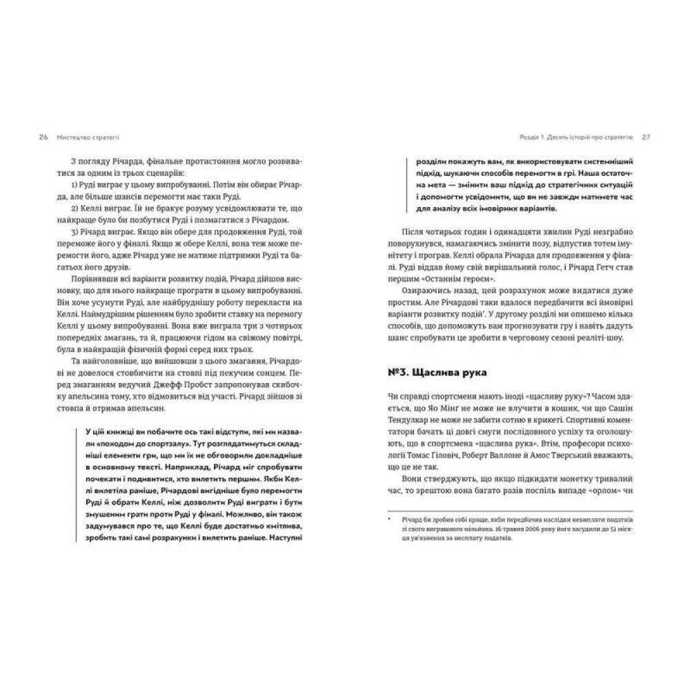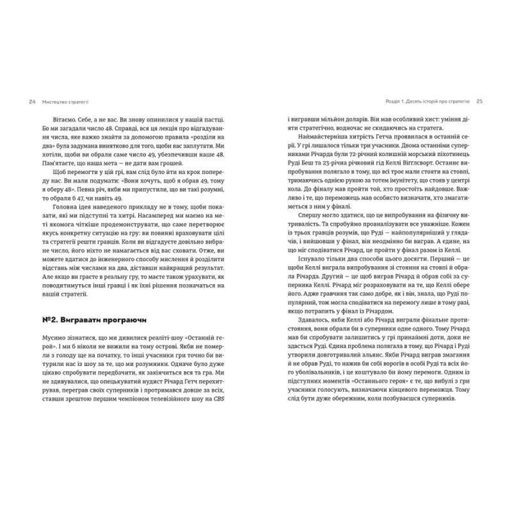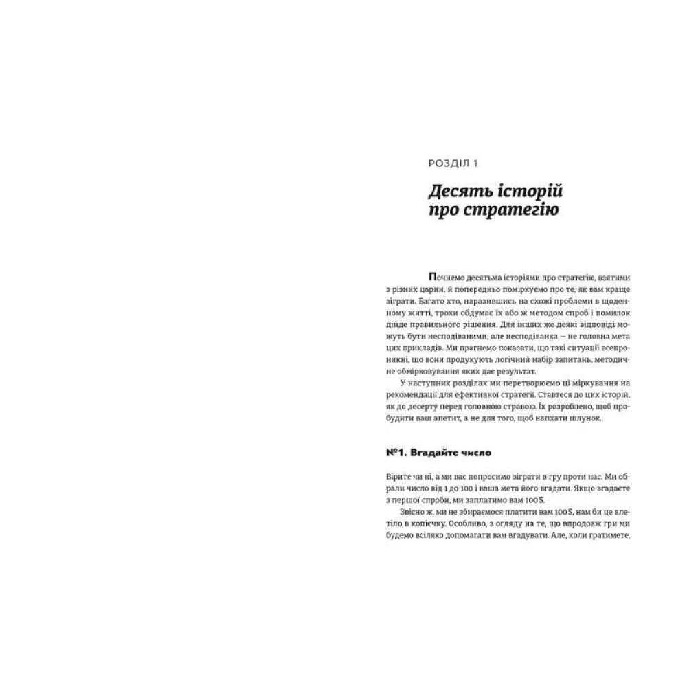 Стратегічне мислення — це мистецтво перевершити суперника, усвідомлюючи, що суперник намагається перевершити тебе. Це також мистецтво пошуку шляхів до співпраці, навіть коли інші керовані винятково особистим зиском. Це мистецтво тлумачити і виявляти інформацію. А ще мистецтво ставити себе на місце іншого, щоб передбачити його вчинки й уплинути на них. Автори книжки вважають, що майстерне стратегічне мислення за таких численних і розмаїтих ситуацій і надалі залишається мистецтвом, але в основі його є кілька простих базових принципів — так і виникає ціла наука стратегії, а саме — теорія гри. Книжка для тих, хто хоче досягти більшого у бізнесі та житті, використовуючи науково доведені стратегії, а також для тих, хто захоплюється математикою і теорією ігор.