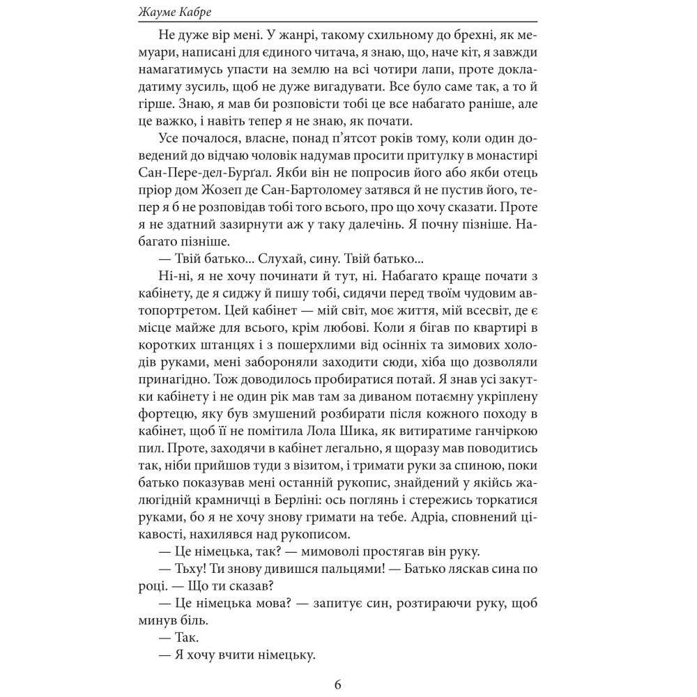 Жауме Кабре (нар. 1947 р. в Барселоні) — іспанський філолог, романіст, сценарист, історик літератури. Пише каталанською мовою. Закінчив філологічний факультет Барселонського університету, викладає в університеті Лериди, член філологічного товариства Каталонського університету. Протягом багатьох років Кабре поєднує письменницьку діяльність з викладанням, також працює на телебаченні й пише кінематографічні сценарії. Лауреат багатьох літературних премій.