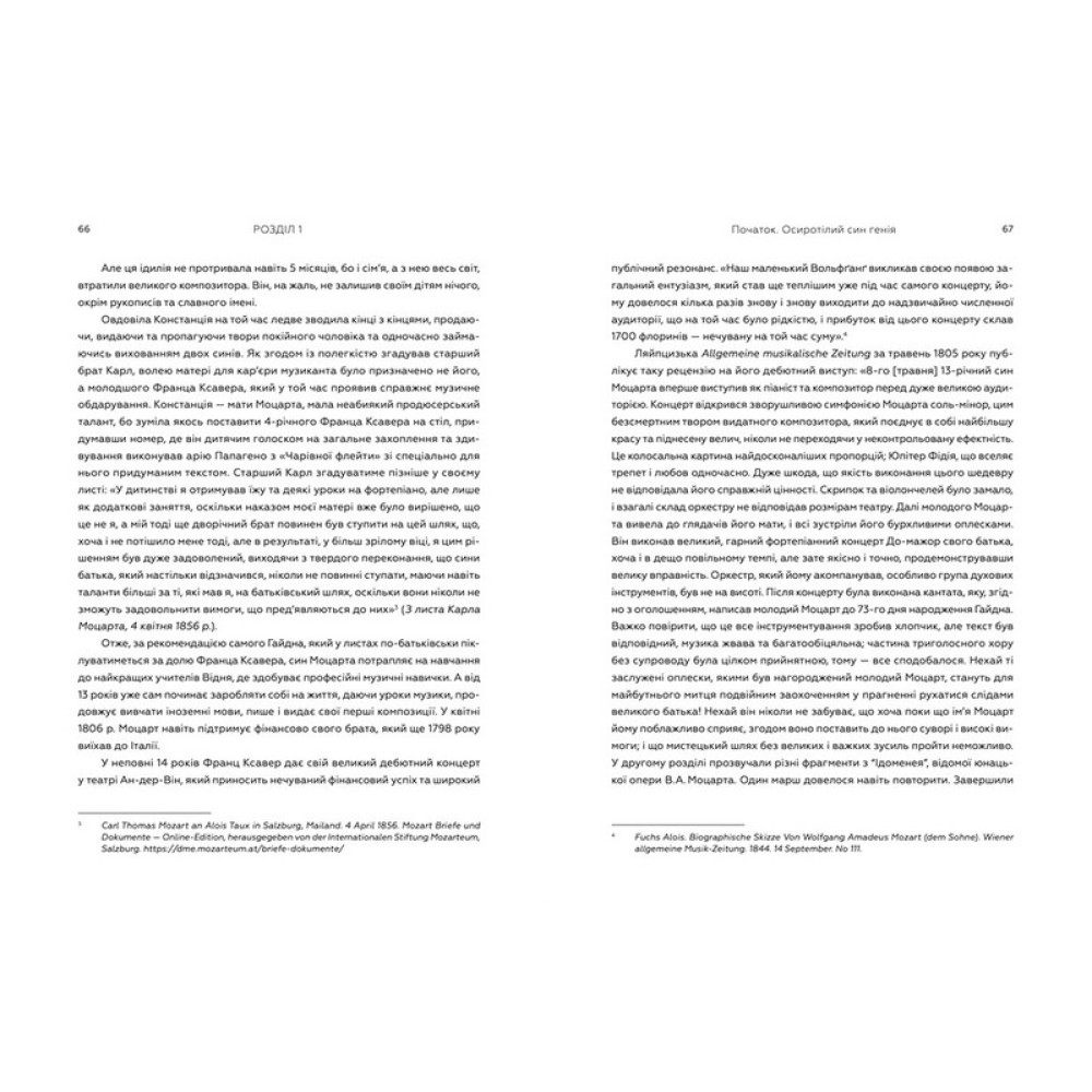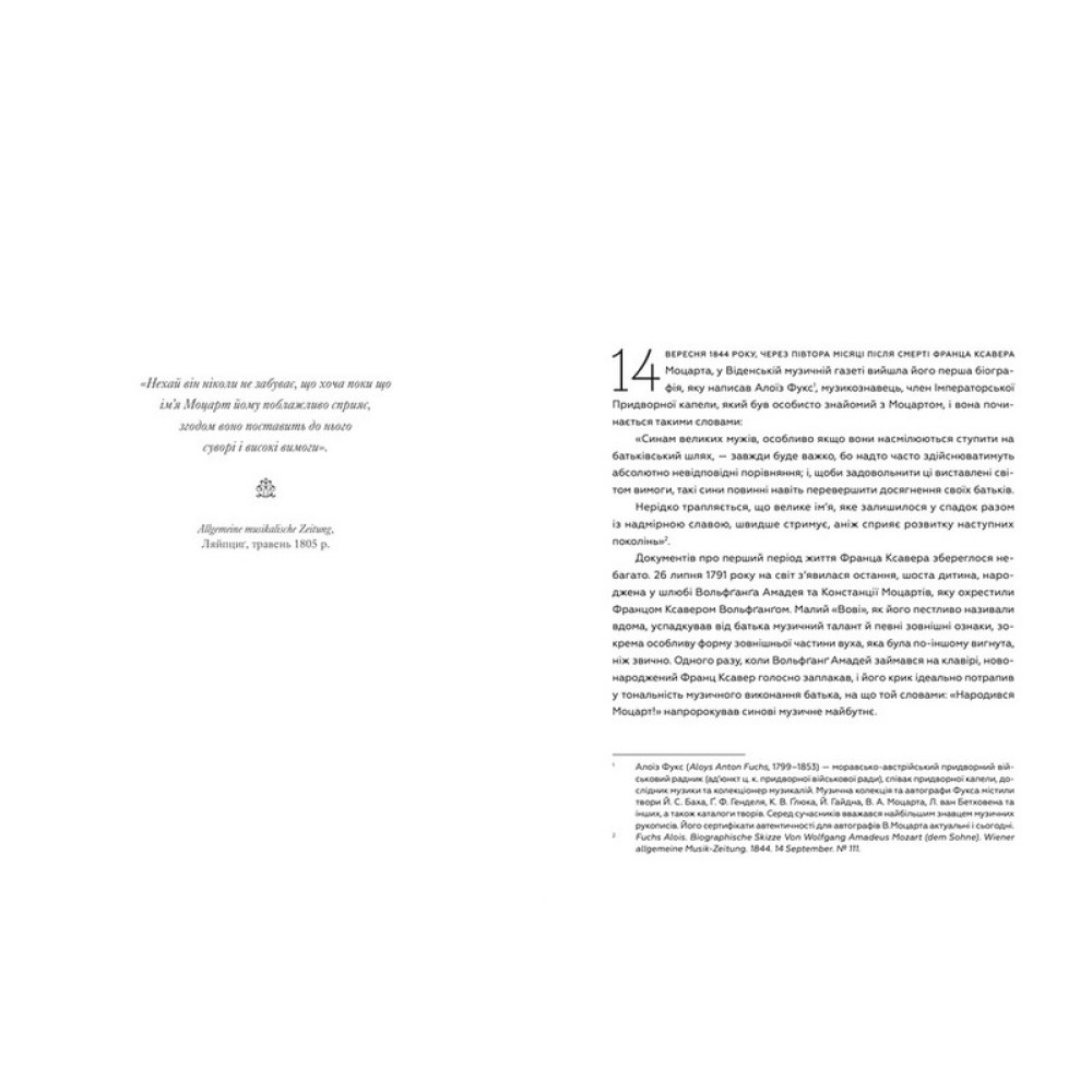 Ким був син великого Моцарта і чим прислужився Галичині та Львову на початку XIX ст., обравши роль приватного вчителя музики в графських маєтках та провівши тут понад 30 років свого життя? Унікальне видання, що зібрало переклади подорожнього щоденника Франца Ксавера Моцарта, понад 100 листів і документальних свідчень та детальний хронограф-біографію, привідкриє читачеві завісу в інше століття, покаже становлення музичної культури Львова, приватне життя композитора та засвідчить сумну долю талановитого Ксавера, який назавжди залишиться сином великого батька.