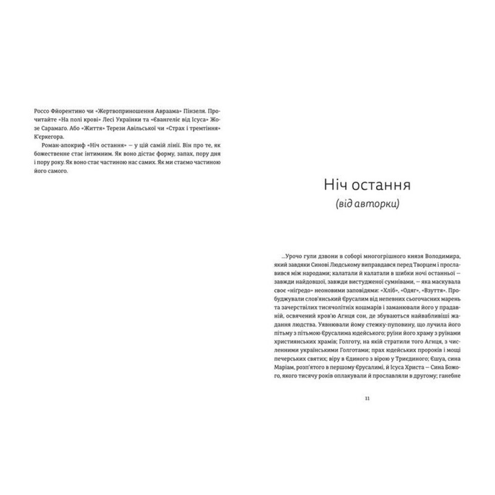 «Третього дня воскресну», — сказав Він своїм учням дивні слова, в які хотілося вірити, але не вірилося… Чи знайдеться в ніч останню бодай одна людина, чия віра у найбільше диво буде справді непохитною? Роман «Ніч остання» — перша в українській художній літературі спроба зрозуміти й уявити роздуми і переживання улюблених учнів Сина Людського, Його Матері та Його переслідувача — першосвященника Ізраїлю Йосефа Кайяти до і після містерії розп’яття. Це захоплива, глибока оповідь про людський вимір божественного, про змагу надій і сумнівів, що й досі триває в думках людей, які прагнуть пізнати істину.