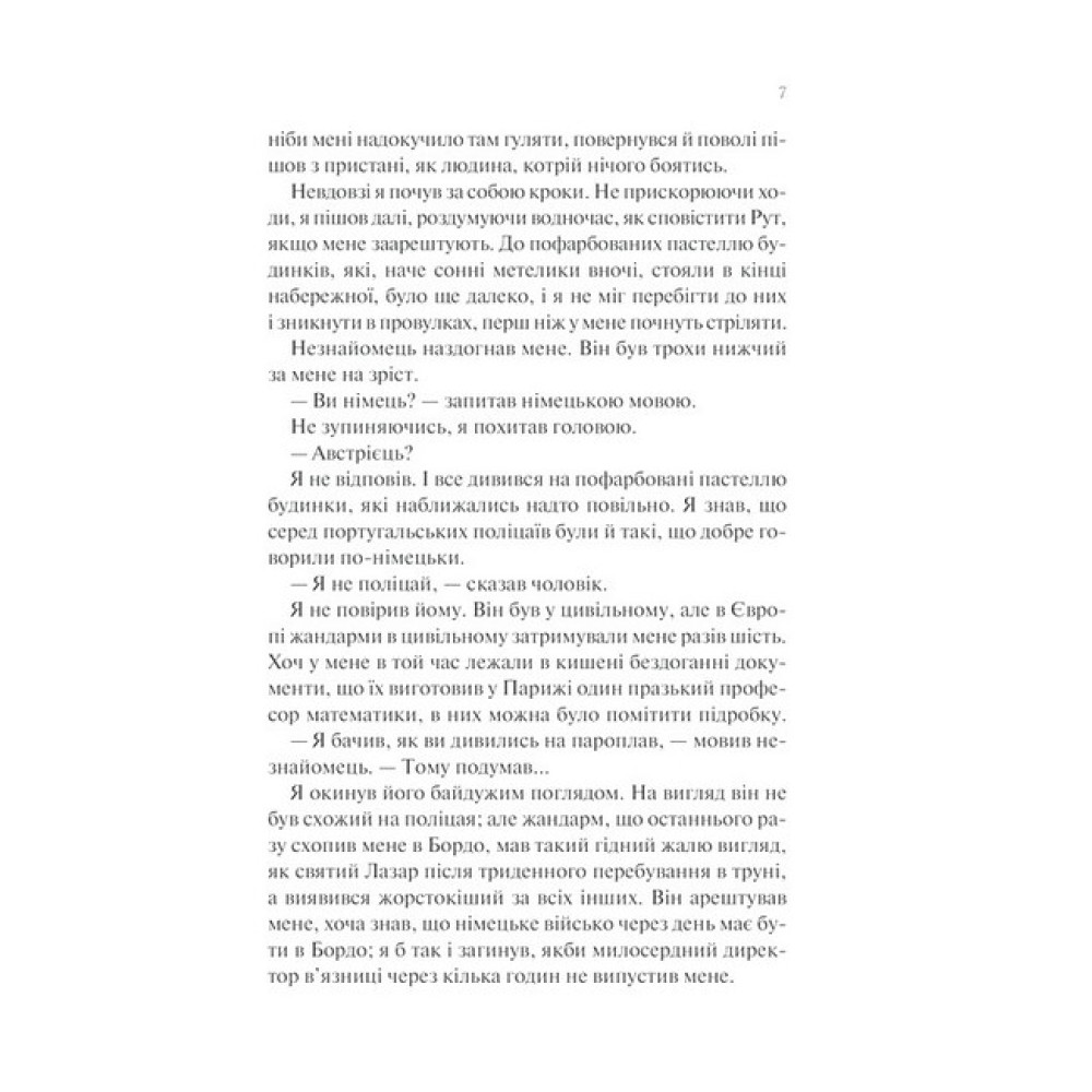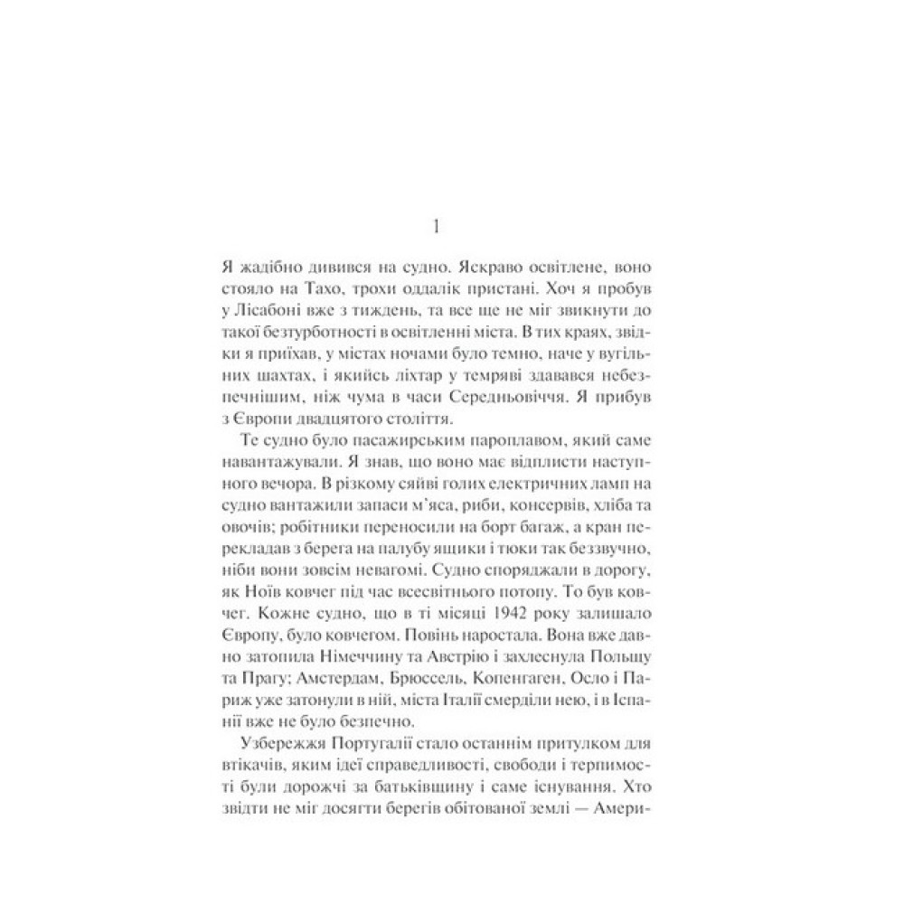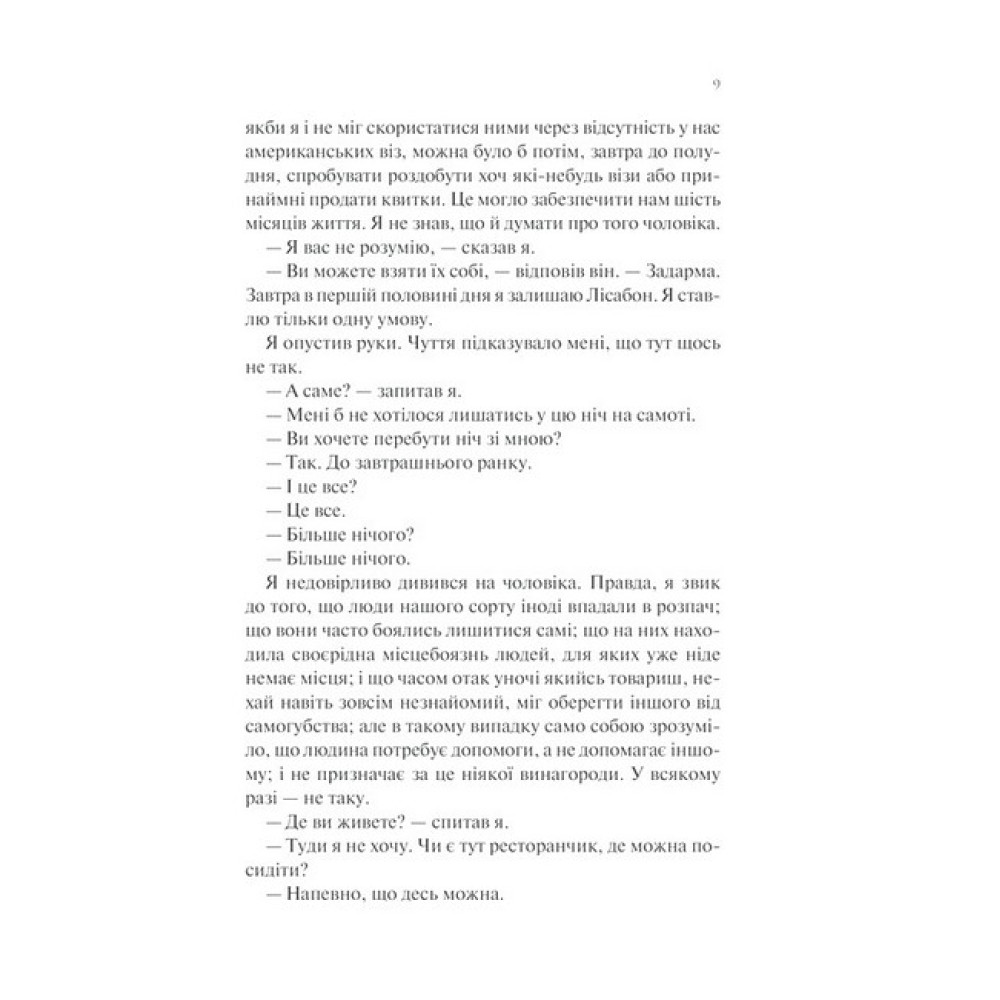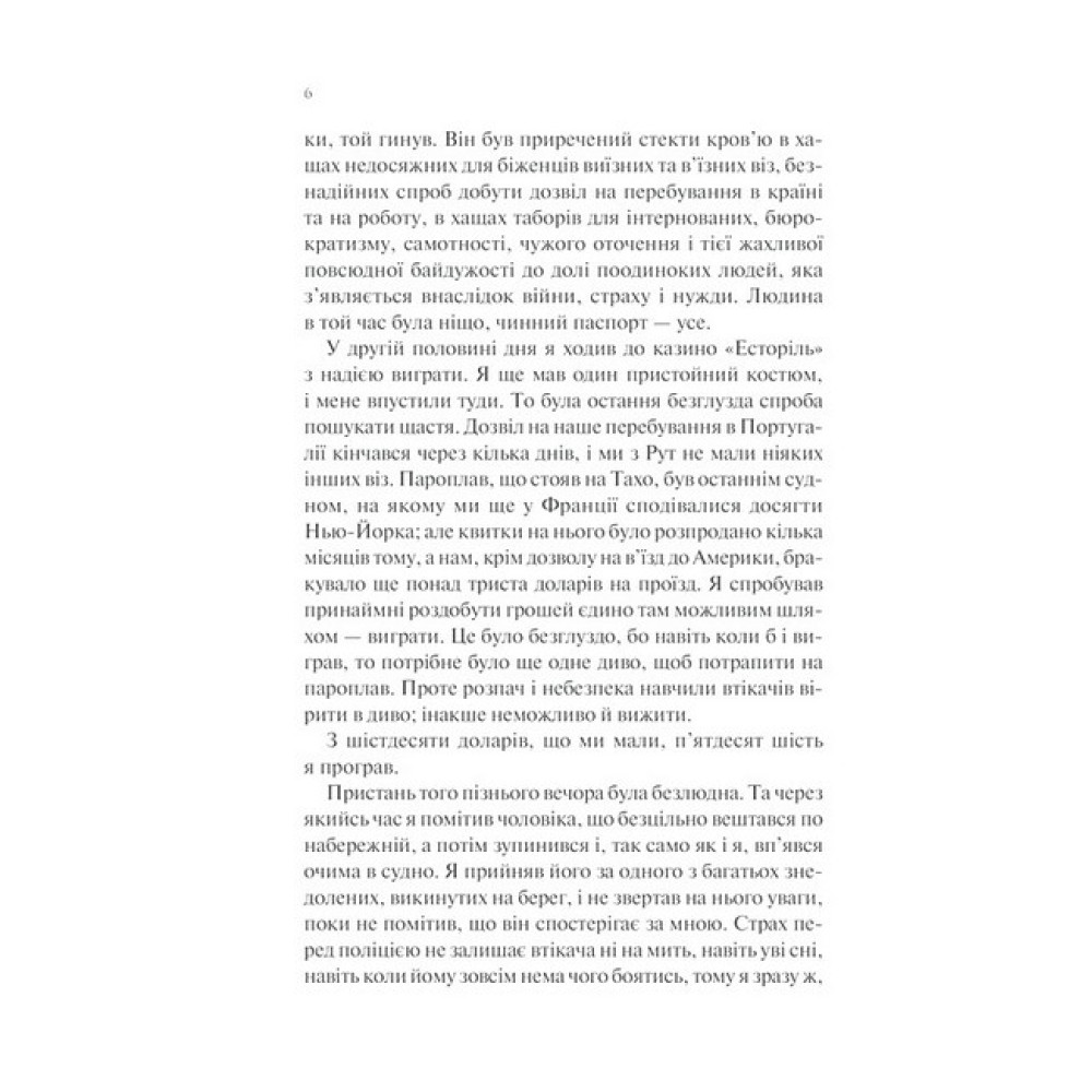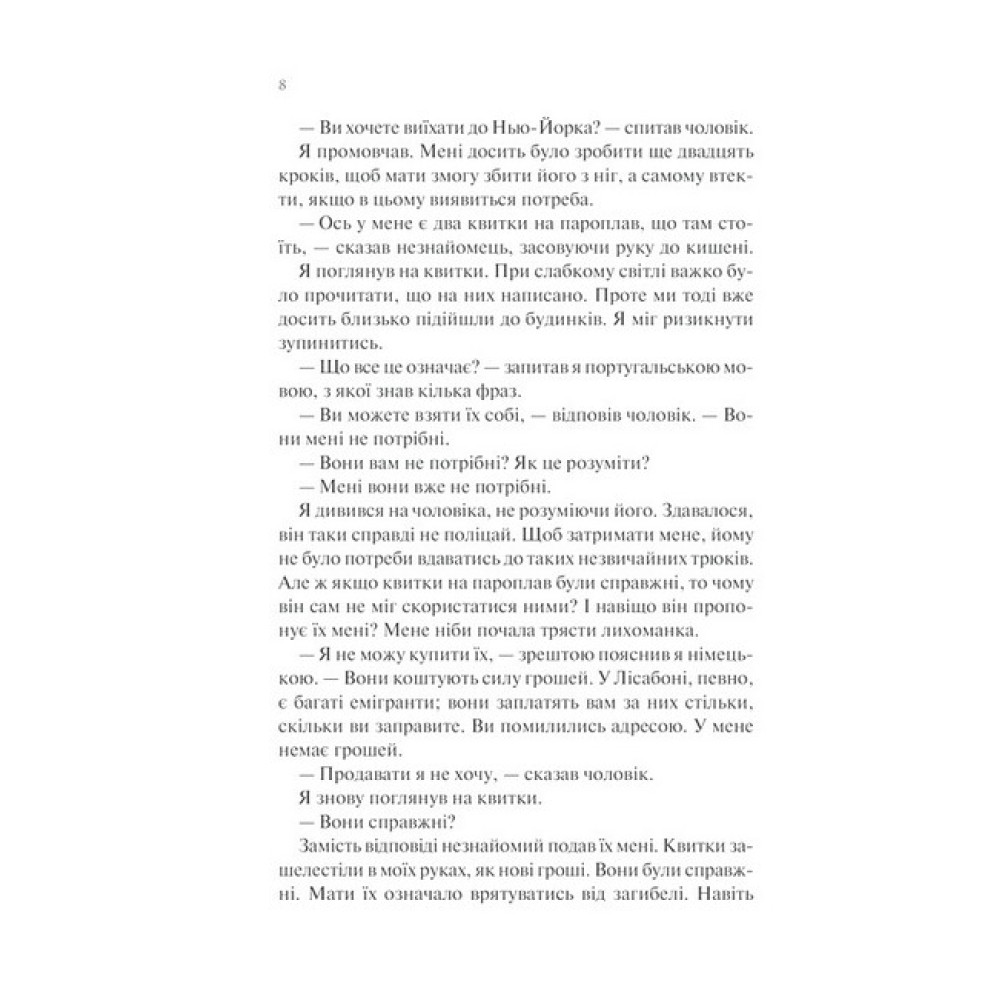 Врятуватися, втекти з Європи якомога далі від нацистів! Їхня остання надія — пароплав до Америки. Але знайти квитки на нього майже неможливо... Дивний незнайомець готовий віддати власні — в обмін на те, що його вислухають. Попереду ніч, сповнена вина й довгих розмов про життя, націю, втрату та справжнє кохання під час війни...Про автора: Еріх Марія Ремарк — один з найвідоміших письменників ХХ століття. Його антивоєнні романи «На західному фронті без змін», «Три товариші», «Тріумфальна арка» є справжніми світовими сенсаціями, що не втрачають актуальності й до сьогодні. Поруч із Гемінґвеєм та Олдінґтоном Ремарк — одна з культових постатей літературної течії «втраченого покоління».