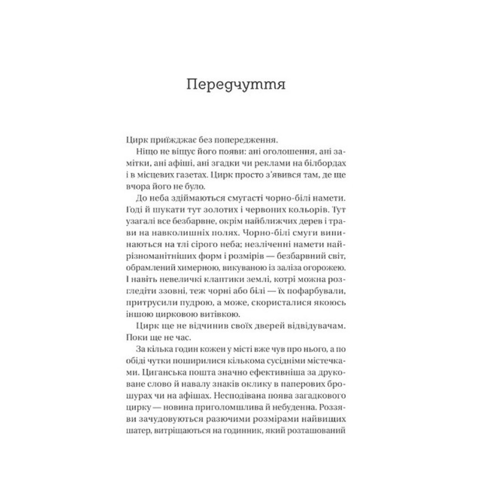 Лондонські передмістя ХІХ століття, якими їх не знала історія. Конкорд, штат Массачусетс. Повітря повниться п’янкими пахощами карамелі й кориці. Вітер смикає чорно-білі смугасті намети мандрівного цирку. А чи це вже Прага? Хай куди вас приводить нічний цирк, щоразу затамовуєте дух від трюків татуйованої дівчини-змії; милуєтеся Крижаним Садом, який можна порівняти хіба що зі сном, або блукаєте чарівним Лабіринтом, а ще… Господи, скільки див!!! Але від першої сторінки ви розумієте, що тут панує магія. Адже цирк — це арена для змагань двох чарівників, які ще самі не знають, що ціна виграшу — кохання і життя. Як же виплутаються вони з цього магічного двобою, у який їх змалку втягли наставники? Чи не щезне цілий загадковий цирковий світ через чиїсь амбіції, чи не спопелять його чари?Книга «Нічний цирк» — це історичне фентезі й дебютний роман американської письменниці Ерін Морґенштерн. Чудернацький цирк приїжджає без попереджень і ніщо не віщує його появи. Де ми? У лондонських перемістях XIX століття чи ж у штаті Массачусетс? А може вже у Празі? Куди б ці шатра не завітали, Le Cirque des Reves відкриває свої двері тільки вночі, а всередині на вас чекають дива й фокуси, від яких перехоплює подих.Татуйована дівчина-змія зачаровує трюками, а мандри чарівним Лабіринтом радше нагадують сон. Все, що тут відбувається, дихає магією і її силою. Цей цирк — арена запального протистояння двох юних чарівників Селії й Марко. Їх готували до боротьби з самого дитинства, але ж трапляється з ними історія кохання, від якого перехоплює подих. Хай там що, дуель має продовжуватись. Пара не знає: гра, у яку їх затягнули наставники змалечку, має стати смертю для одного з них.Це історія, яка розгортається у вікторіанську епоху, сповнену чар. У романі «Нічний цирк» Ерін Морґенштерн розповідає про дві школи магії: одна заснована на природних здібностях до фізичних маніпуляцій, інша — на багаторічному вивченні стародавніх практик: чарів, заклинань і ще багато іншого. Ці два підходи мають на чолі свого майстра-практика, а протистояння, щоб визначити, який тип магії кращий і сильніший триває десятиліттями (можливо, й сторіччями). От як проводиться таке змагання: кожен майстер обирає учня, передає знання, а потім зіштовхує його у магічному поєдинку до смерті з учнем іншої школи. Щасливої подорожі з Le Cirque des Reves у карколомний світ чар, запаморочливих див, неможливого кохання й розкішного ажурного письма Ерін Морґенштерн.
