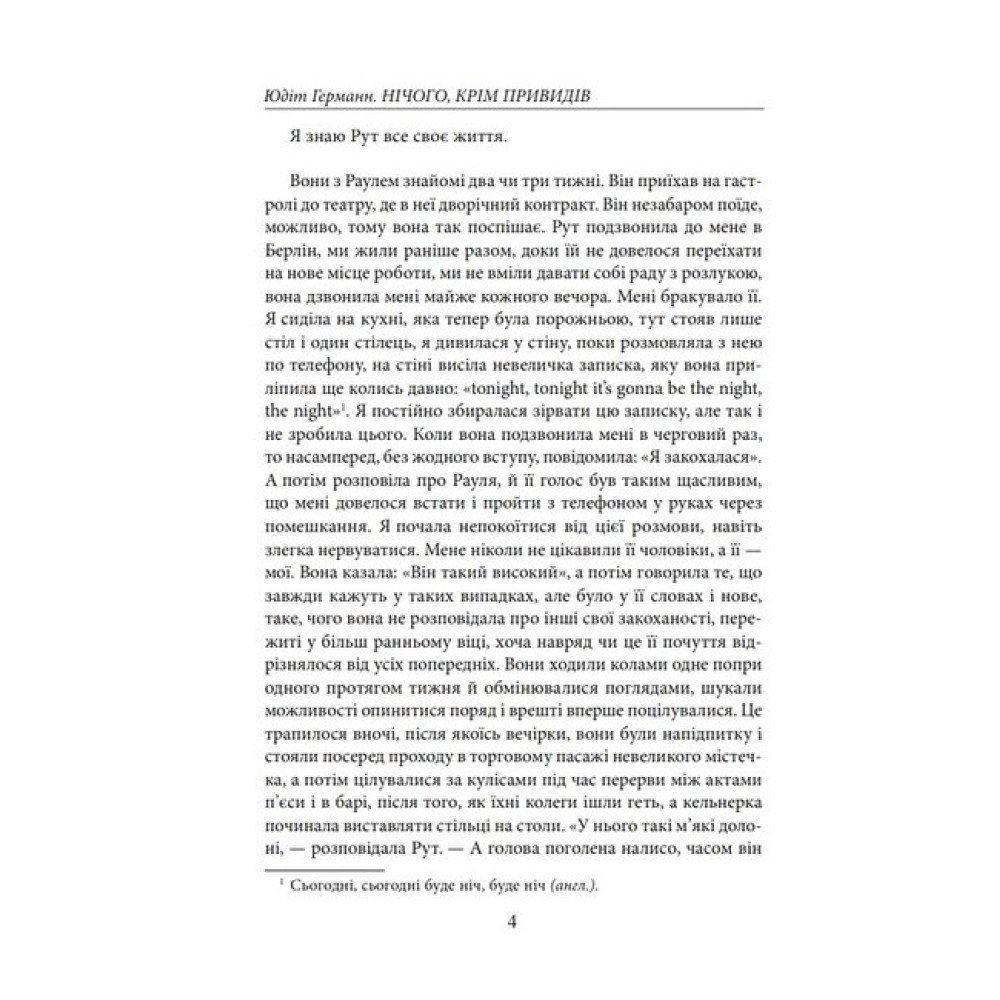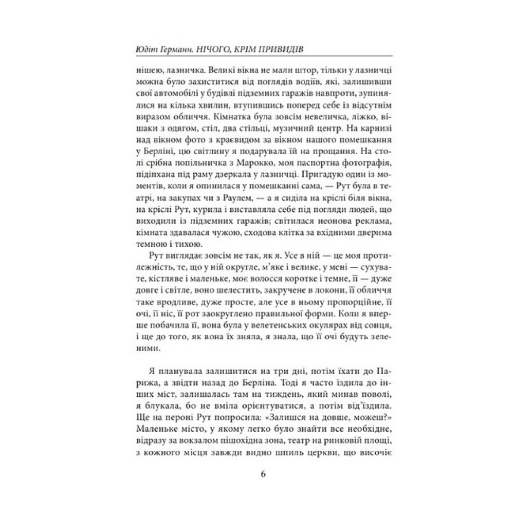 Юдіт Германн (нар. 1970 р.) — сучасна німецька письменниця. Після дебютної книжки «Літній дім, згодом» (1998), яка стала бестселером, вона визнана голосом покоління, а її твори — прозою прощання. У своїх оповіданнях Германн порушує проблеми, близькі багатьом, — і звідси наклади в сотні тисяч примірників, переклади більш ніж двадцятьма іноземними мовами. «Нічого, крім привидів» — це сім чуттєвих і дещо меланхолійних історій «пошуку себе». Авторка не нав’язує читачеві свої думки, а щиро й неквапливо розповідає про сумніви жінок щодо правильності вибору власної долі, про неспроможність налагодити стосунки з найдорожчою людиною, про душевні рани, які тривожать, про ностальгію за невикористаними шансами. Вона пропонує читачеві зазирнути туди, куди чужинців зазвичай не пускають — у душі своїх героїв. Юдіт Германн не намагається епатувати, але змушує замислитися: чи є межа між справжнім коханням і звичайною еротичною цікавістю, між реальною людиною і створеним почуттям образом? А можливо, немає зовсім нічого. Нічого, крім привидів…