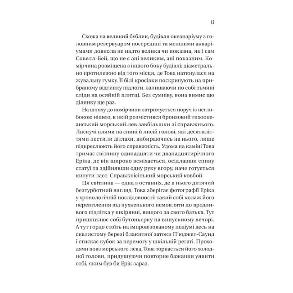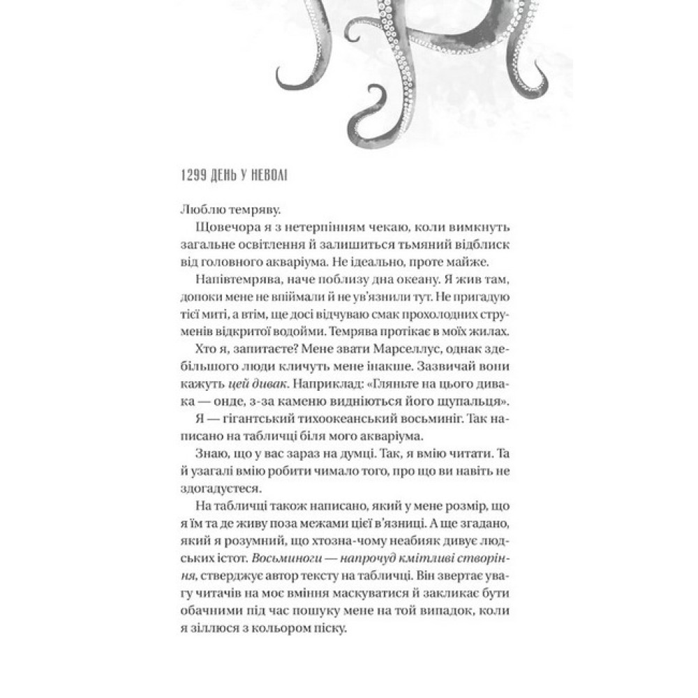 Книга «Напрочуд кмітливі створіння» — це дебютний роман канадської письменниці Шелбі Ван Пелт про Тові Салліван, стару жінку, чиє життя сповнене болю. Чоловік помер, а син загадково зник ще тридцять років тому на човні. Тамуючи самотність, головна героїня влаштовується прибиральницею до океанаріума містечка Совелл-Бей. Одного дня вона рятує восьминога Марселлуса, який опинився поза акваріумом і майже помер. Това не знає, що нібито звичайний мешканець океанаріума може допомогти їй теж. Марселлус стане ключем до таємниці зникнення сина Еріка. «Як?» — запитаєтесь ви. Ох, це захоплива, сповнена доброти й особливих героїв історія, частину якої повідає читачам сам восьминіг. Історію «Напрочуд кмітливі створіння» Шелбі Ван Пелт починає так, що одразу розумієш: ця книжка дуже відрізняється від усього прочитаного раніше. Себе представляє нам Марселлус МакКальмарович. Ім’я, яким його нарекла людська дитина, восьминогу не до душі, бо бути прийнятим за кальмара — найбільша образа. Він розповідає про своє буття в акваріумі досить конкретно визначає час, який залишився в його житті як гігантського тихоокеанського восьминога — 160 днів. Він уміє рахувати і вміє читати, адже Марселлус — напрочуд кмітливе створіння. Може ще й зламувати замки й тікати з акваріума, коли ніхто не дивиться. Після ми знайомимося з сімдесятирічною Товою, яка приходить після робочого дня почистити акваріум. Одного вечора вона знаходить наше напрочуд кмітливе (й дотепне!) створіння заплутаним у зарядному шнурі. Той не може повернутися до свого резервуара, бо пізно ввечері перекусив покинутою їжею. Жінка рятує його й тримає в таємниці його нічні мандрівки. Так починається історія чудернацької дружби, яка змінить життя обох. Знаємо багато книжок про дружбу котів, собак з людьми. А от друг-восьминіг — це, напевно, літературне вперше, що точно вартує уваги. Ви могли поставитись скептично до такого розумного Марселлуса. Та чи знали ви, що восьминоги піддаються дресуванню, вміють розрізняти людей і геометричні фігури? Хто знає, може десь існує справжня Това Салліван, яка зберегла таємницю розумного створіння й подружилась з ним… Втім, перша сторінка запевняє, що всі схожості з реальністю — випадковість. Залишається читати «Remarkably Bright Creatures» Шелбі Ван Пелт і гадати, насолоджуючись цією теплою історією.