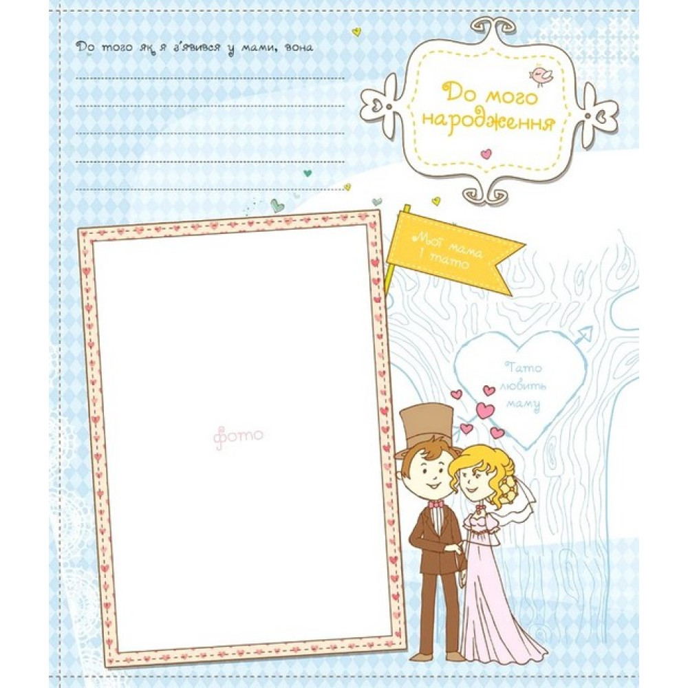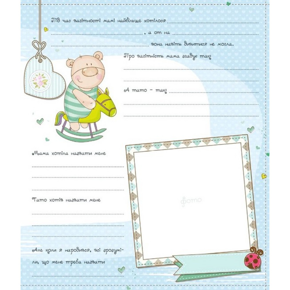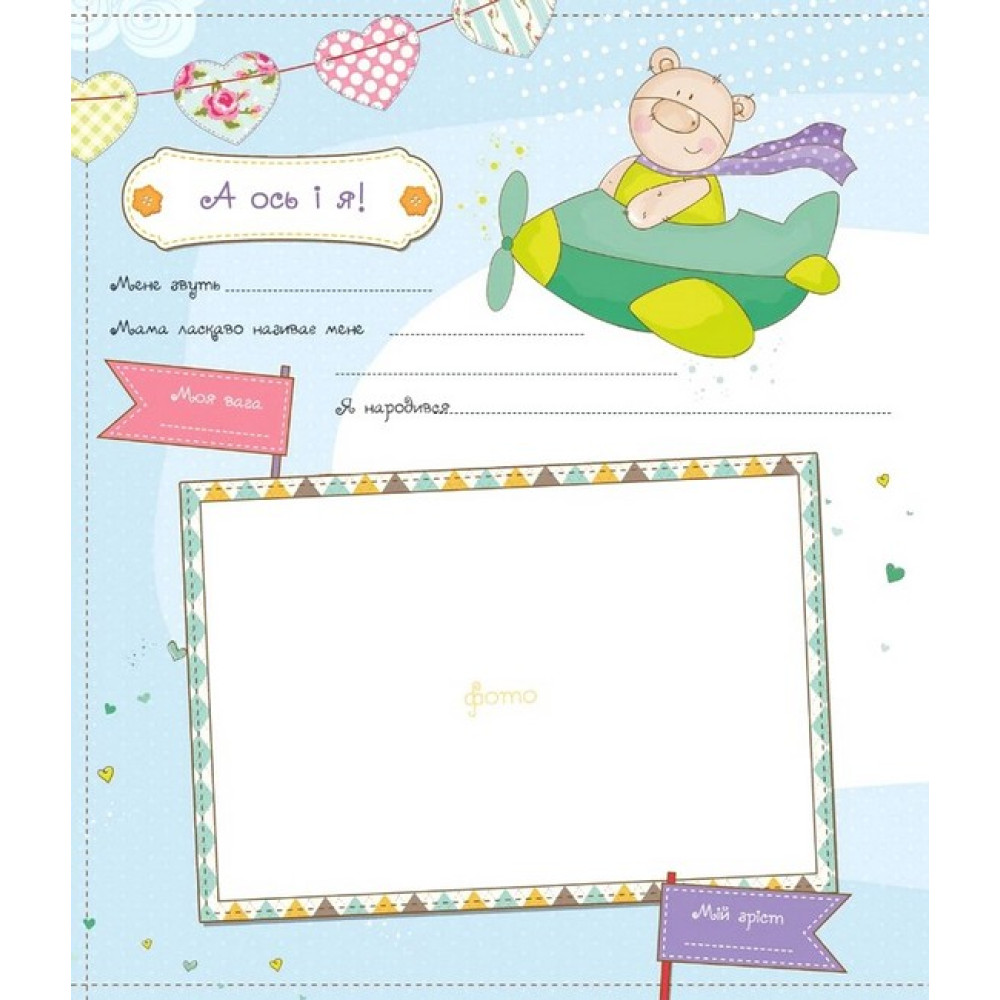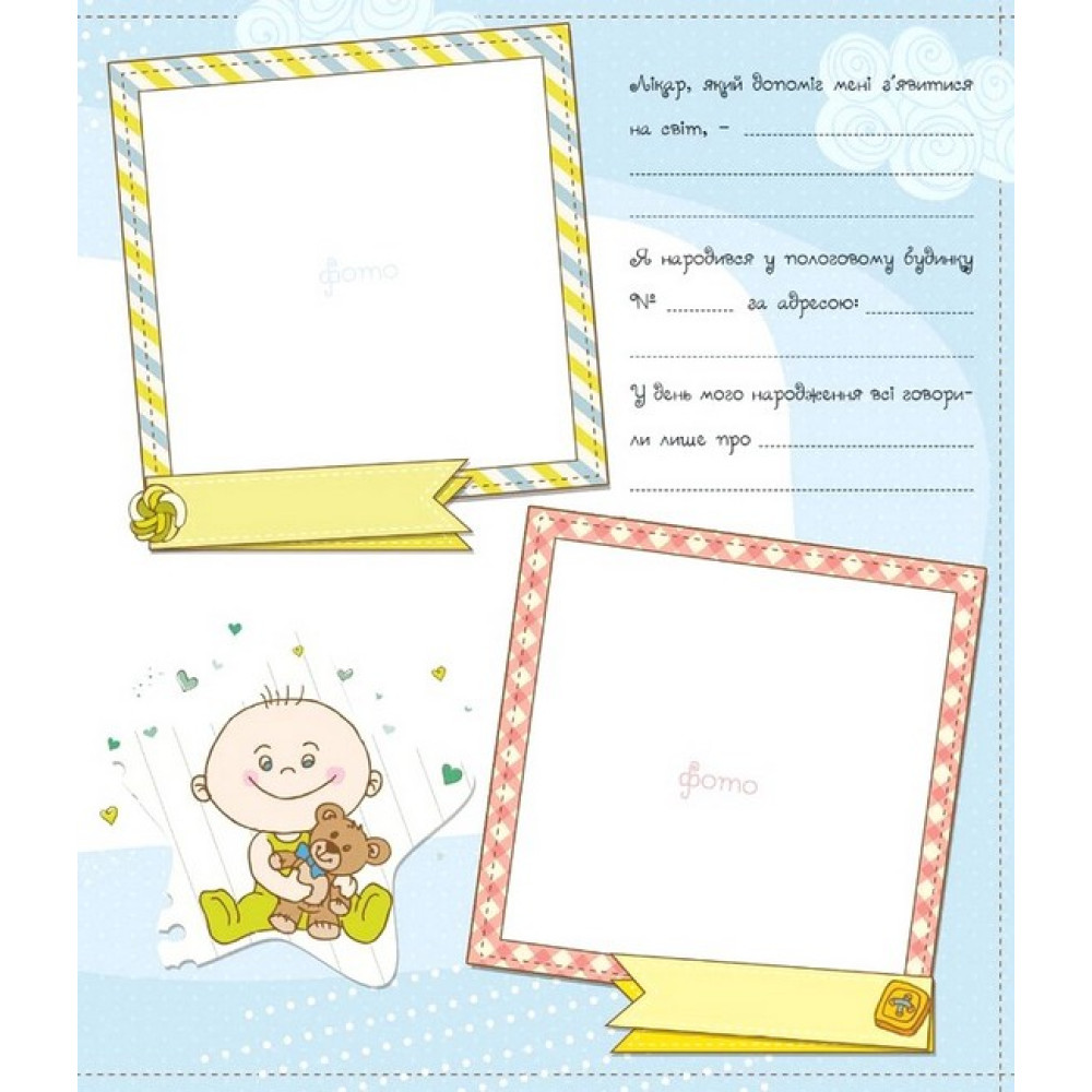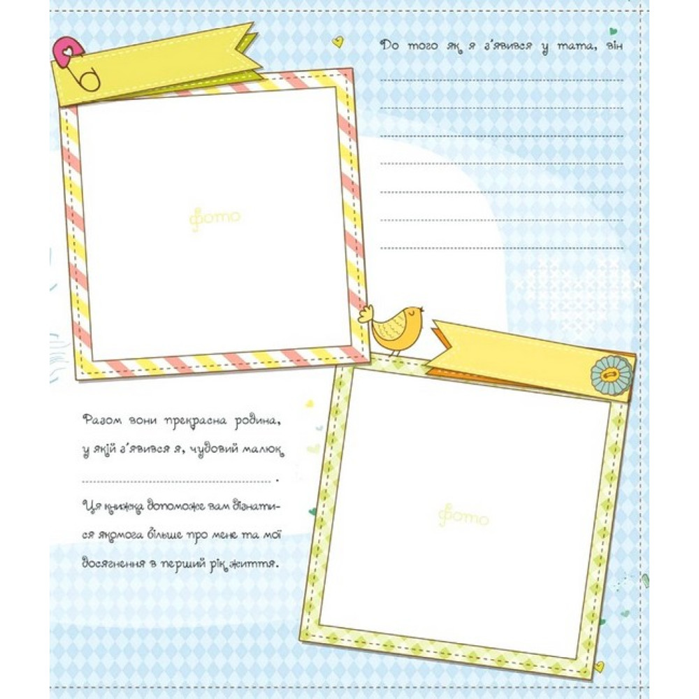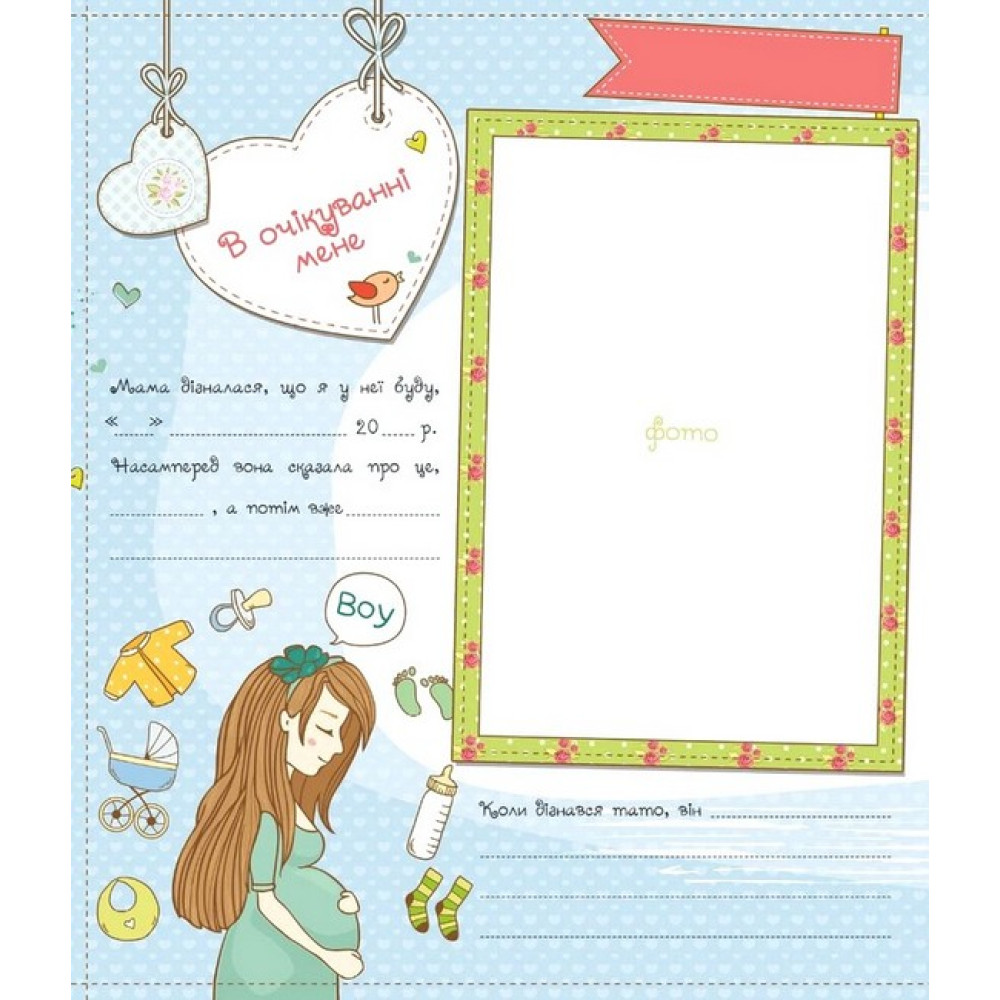Поява маляти — це найзворушливіша і найдовгоочікуваніша подія в родині. Хіба ви не хотіли б залишити її у пам’яті назавжди? У цьому вам допоможе альбом. Тільки уявіть, як через декілька років ви всією сім’єю переглядатимете знімки — перший день вдома і перше купання сина, його перший Новий рік і перші успіхи... Відбиток маленької долоньки, кумедні слівця — альбом допоможе вам зберегти кожну хвилинку дитинства найдорожчої для вас людини. Запевняємо, завдяки цьому альбому ваш малюк залишиться з вами навіть тоді, коли сам стане батьком!Обкладинка книги має віконце у формі серця для фото вашої крихітки.Поява маляти — це найзворушливіша і найдовгоочікуваніша подія в родині. Хіба ви не хотіли б залишити її у пам’яті назавжди? У цьому вам допоможе альбом. Тільки уявіть, як через декілька років ви всією сім’єю переглядатимете знімки — перший день вдома і перше купання сина, його перший Новий рік і перші успіхи... Відбиток маленької долоньки, кумедні слівця — альбом допоможе вам зберегти кожну хвилинку дитинства найдорожчої для вас людини. Запевняємо, завдяки цьому альбому ваш малюк залишиться з вами навіть тоді, коли сам стане батьком!