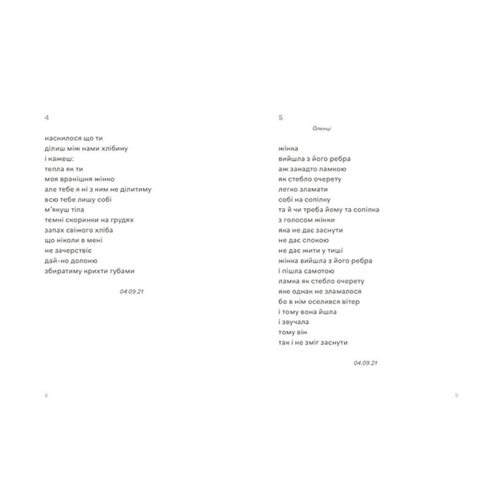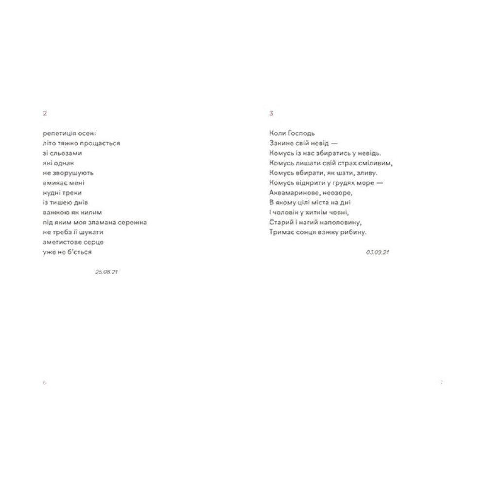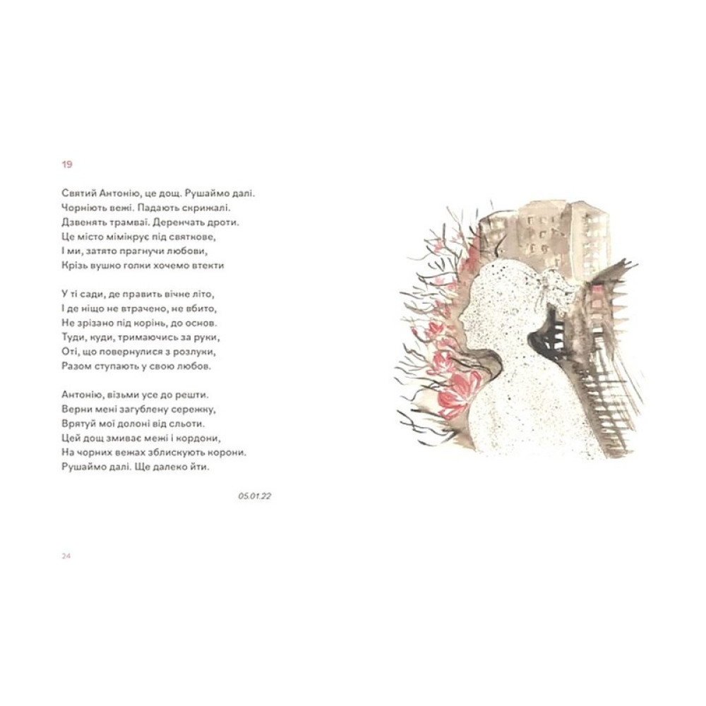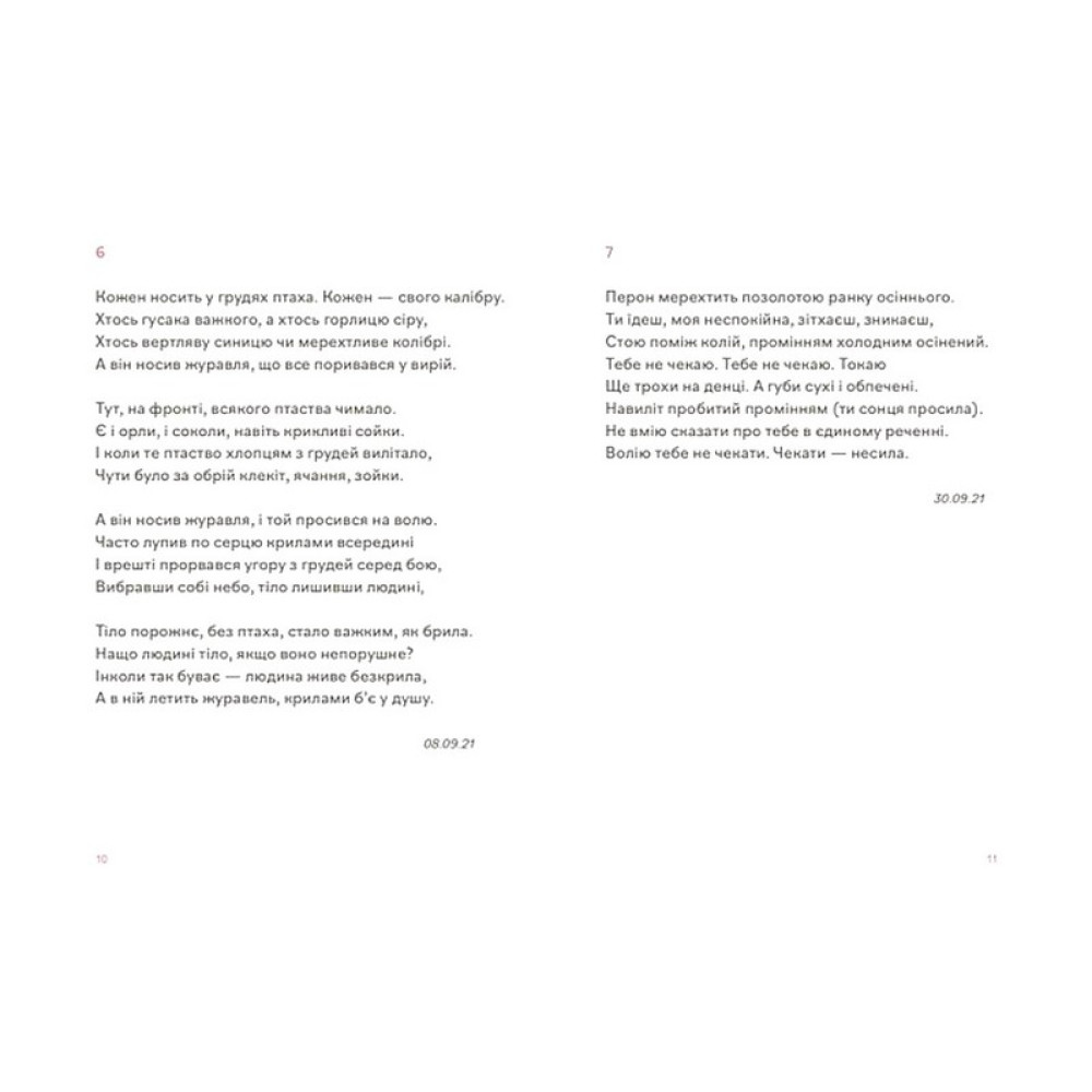 Ця книга віршів має чітку внутрішню послідовність. Усі вірші тут охоплюють два роки — з серпня 2021-го до серпня 2023-го. Це ніби цільний шмат життя — почуттів, передчуттів, болю, ненависті, розпачу, витривалості, терпіння, чекання, боротьби, любові, сили і ніжності. Так, ніжності, без якої неможливо вистояти, витерпіти. Ніжності, яка свідчить про цінність життя.За цими віршами любові і віри, яких у книжці 77, можна відчитувати хронологію подій нашого безжального часу і розуміти, що дає нам силу боротися далі.