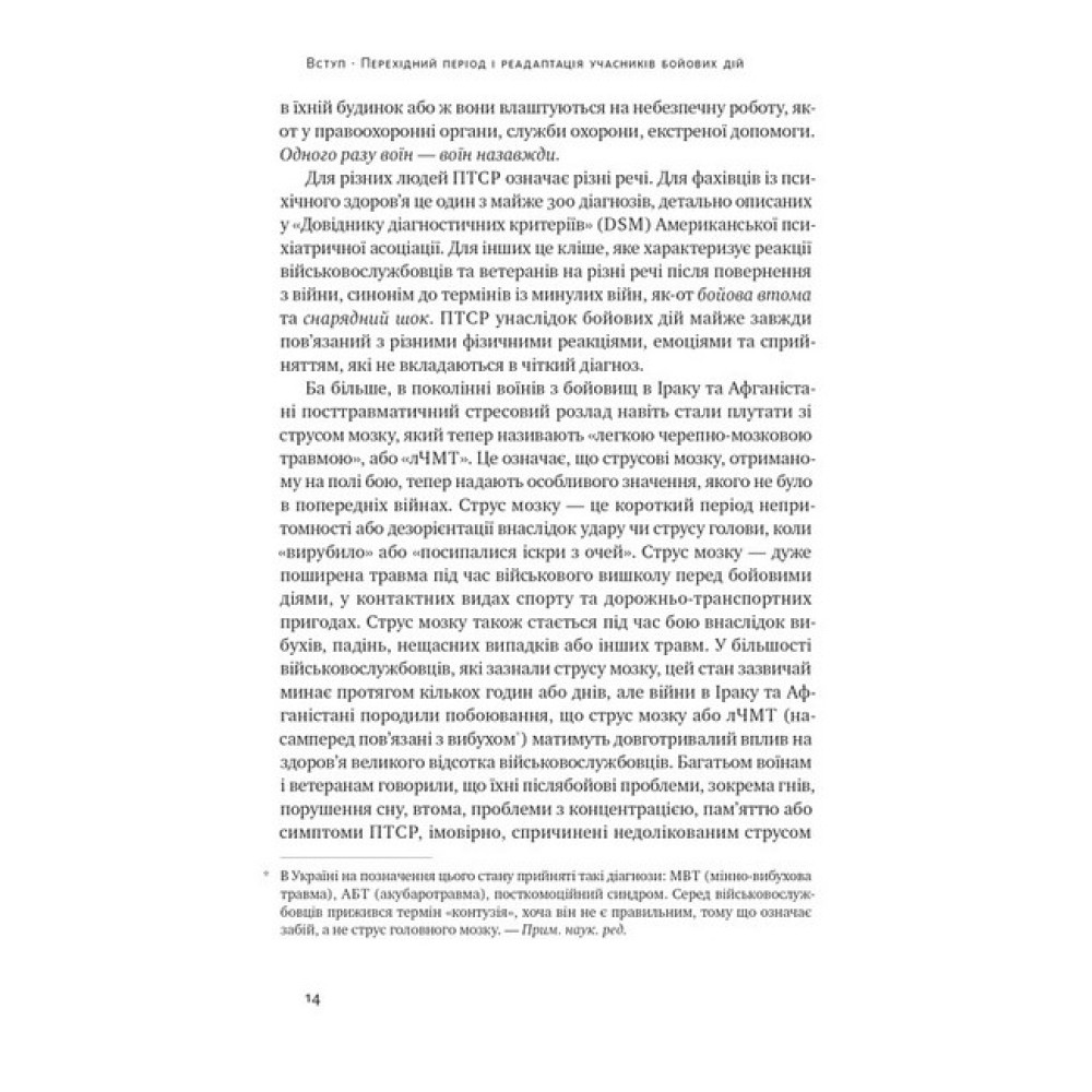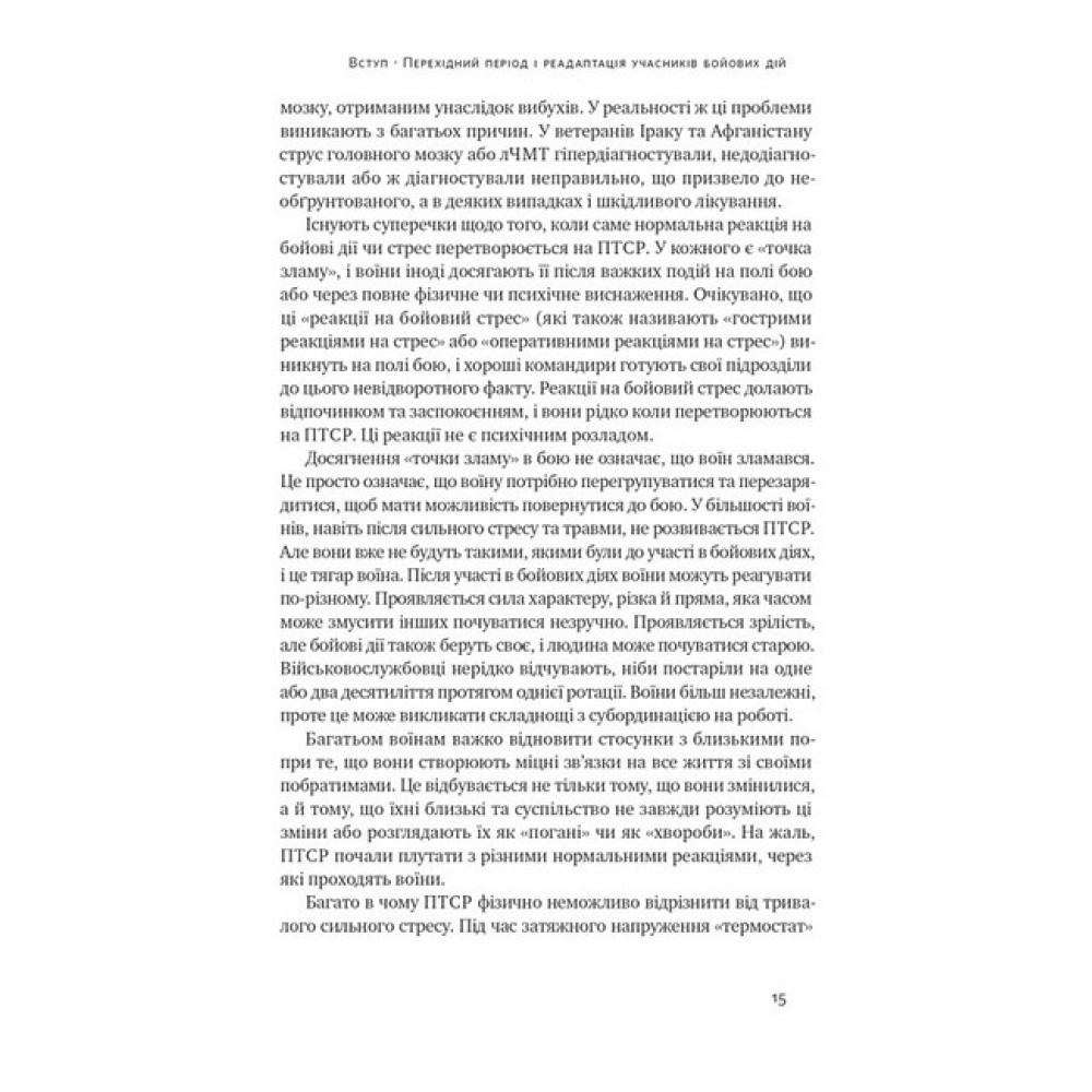 Військовий психіатр, полковник Армії США Чарльз Гоуґ присвятив своє життя допомозі ветеранам у подоланні впливу війни на психічне здоров’я. Його книжка пропонує конкретний набір навичок і порад, що допоможуть впоратися з психофізіологічними наслідками війни, бойовим стресом та посттравматичним стресовим розладом. Автор детально описує, як відслідковувати власний психічний стан та керувати стресом, щоб зрештою його подолати. Практичні рекомендації Гоуґа допомогли тисячам воїнів успішно здійснити перехід до мирного життя. Видання буде корисним учасникам бойових дій, членам їхніх родин, військовим лікарям, психотерапевтам і психіатрам, викладачам та студентам медичних навчальних закладів, а також роботодавцям, працівникам держустанов, громадських та благодійних організацій. Про автора: Чарльз Гоуґ, доктор медицини, полковник Армії США (у відставці), експерт світового рівня з військової психіатрії. Автор понад ста рецензованих статей у міжнародних журналах. Його новаторські дослідження ПТСР, легкої черепно-мозкової травми та стигматизації проблем психічного здоров’я є найбільш цитованими медичними статтями про наслідки війн в Іраку та Афганістані.
