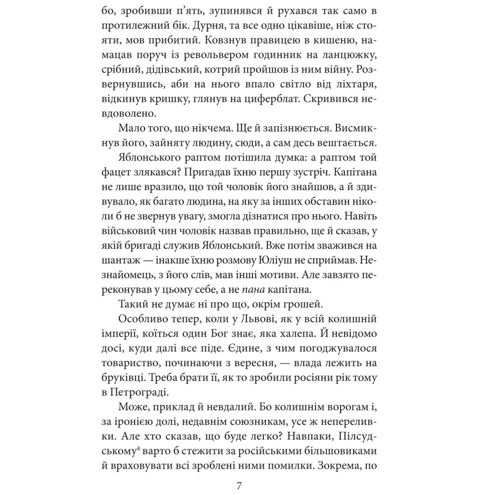 Львів, осінь 1918 року. Австро-Угорська імперія за крок до руйнації. Поляки та українці ведуть боротьбу за владу, кожна сторона претендує на Східну Галичину. Йдуть важкі політичні переговори. Українцям вигідно затягувати процес — є надія знайти сильного союзника. Аж раптом у Стрийському парку знаходять труп офіцера-поляка, який був членом таємного військового товариства. Переговорам кінець, і Климентій Кошовий, не так давно — відомий адвокат, а нині — особа без певних занять, має два дні, аби довести: вбивство не має стосунку до політики. Вбитий мав безліч ворогів, звести з ним рахунки міг хто завгодно. Але правда вже нікого не цікавить, збройне протистояння у Львові неминуче... І все одно Кошовий, під кулями листопадових вуличних боїв, вперто шукає істину. Відкриття приголомшить. А події тих буремних днів змінять його долю, вплинуть на погляди його друга Йозефа Шацького та можуть розвести по різні боки вуличних барикад Клима і його кохану Магду Богданович.