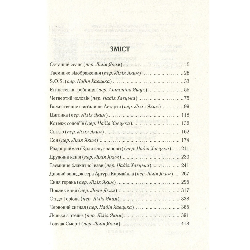 На сторінках оповідань, що увійшли до збірки, перед читачами постає нова Аґата Крісті — майстриня химерної і моторошної прози, де головним героєм є Надприродне. У цих історіях ви завітаєте до будинку з привидами, зазирнете у дзеркало, в якому видно майбутнє, станете свідком гніву богів, повірите в переселення душ, побуваєте на руїнах стародавніх цивілізацій і зустрінетеся віч-на-віч із пекельним Гончаком Смерті. А ще ви ніколи не забудете спіритичний сеанс від мадам Сімони. Ця відома медіум планує завершити свою практику. Але перед цим їй потрібно провести останній сеанс — із померлою донькою мадам Ікс…