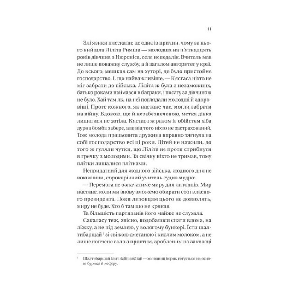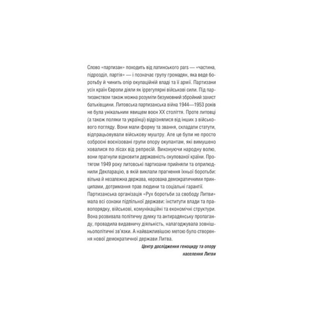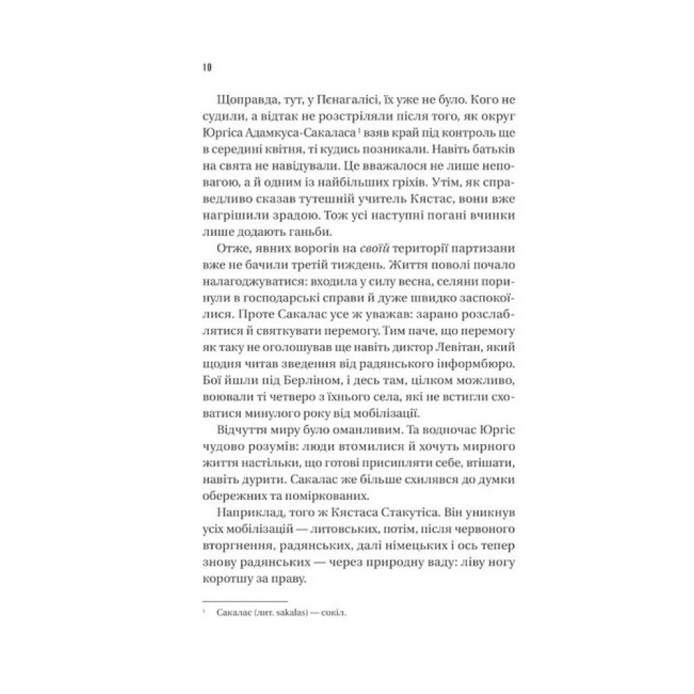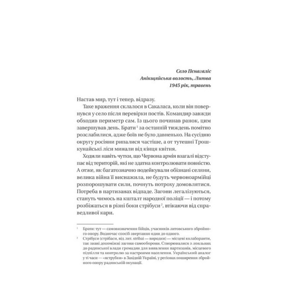 Гостросюжетний історичний роман про силу «маленької людини» і безсилість тоталітарної системи. Засновано на реальних подіях. Травень 1945 року, Литва. Завершується Друга світова війна. Однак Сакалас, командир загону литовського збройного опору, переконаний: святкувати перемогу литовцям зарано. Адже з розгромом нацистської Німеччини державну незалежність Литви не відновлено. Територію знову контролює радянська влада. Замість визволення й свободи вона принесла терор, репресії, насильство. Литовські села змушені годувати армію окупанта. «Лісові брати» — так називають себе партизани, які стають регулярною армією підпільної литовської держави. Герої роману, Сакалас, Лютас, Тарзанас, Ажуолас, Шарунас і українець Іван Мартинюк, названий Йонасом, являють читачам колективний портрет повстанців, що кинули виклик російській окупаційній владі. Вони раз по раз доводять: всесильна радянська держбезпека на чужій землі може виявитися безсилою…