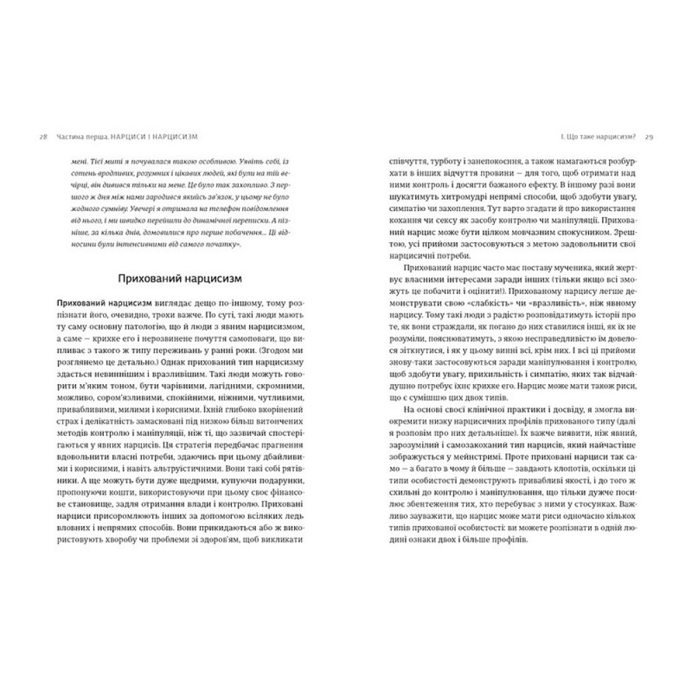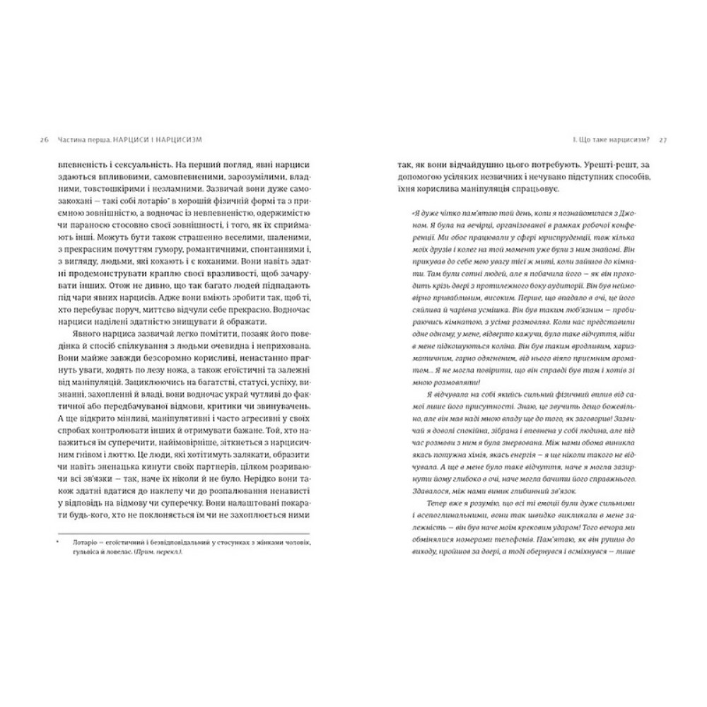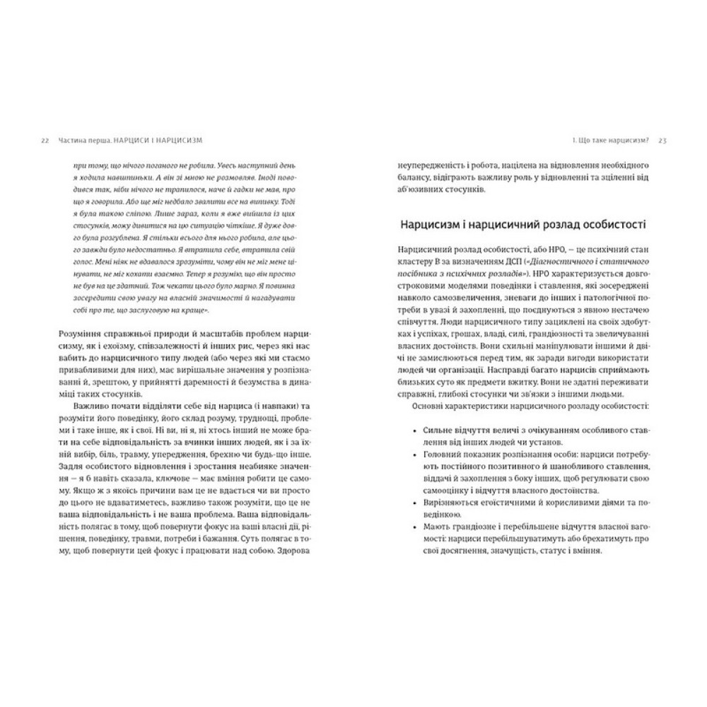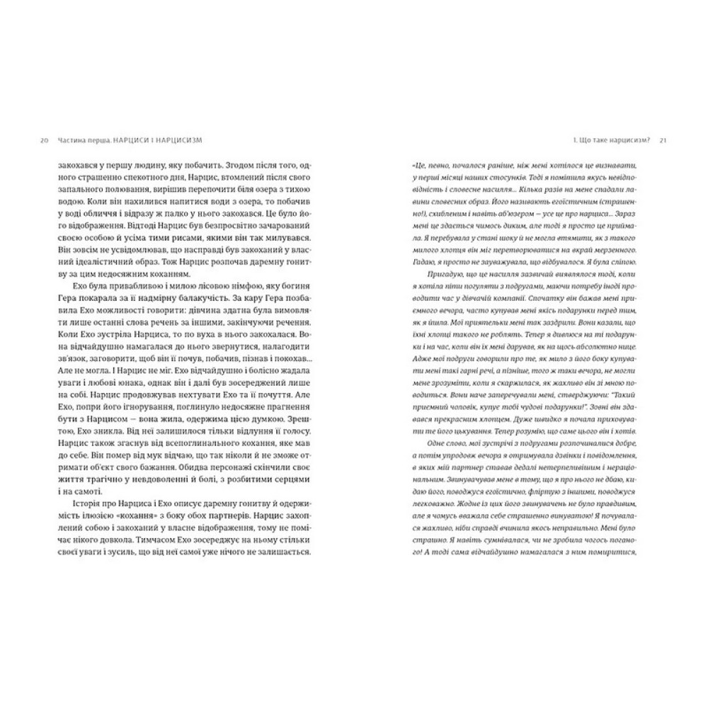Легенда про самозакоханого грецького Нарциса та закохану в нього Ехо — стара як світ, але вона до нині про одержимість та сліпоту ілюзорного кохання та даремність подібних стосунків. Як розпізнати нарциса, розуміти його поведінку, склад розуму, задля особистого відновлення? Як розірвати токсичні стосунки з особою-нарцисом, а найголовніше, як зрозуміти, прийняти і пережити цей досвід? Ви не можете змінити нарциса, але можете змінити спосіб поводження з ним. Психологиня і терапевтка з психічного здоров’я докторка Сара Девіс, яка спеціалізується на лікуванні нарцисичного насильства, співзалежності, стресу, тривоги та травми, пропонує у цьому практичному посібнику зрозуміти природу стосунків із нарцисом і назавжди звільнитися від них.