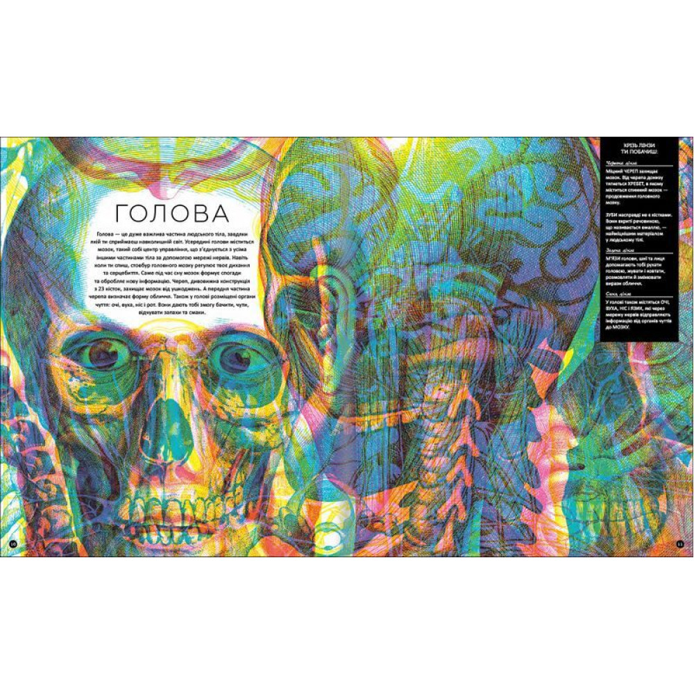 Таких уроків з анатомії ще не було. У цьому дивовижному виданні приховані секрети про те, як працює людське тіло вдень і вночі, чому ми бачимо і чуємо, чому відчуваємо смаки та запахи і навіть про те, що відбувається з людиною до її народження. Але все це можна прочитати і побачити тільки за допомогою спеціальних лінз. Через червону лінзу читач зможе вивчати скелет людини, через зелену – дізнатися все про людські м’язи, а через синю – побачити всі внутрішні органи. Це пізнавальне та інтерактивне видання – не лише про будову тіла, а й про роботу всіх його систем. І ця наукова інформація подана у таких спосіб, щоб зацікавити дитинучитати науково-популярні книжки і пізнавати цей світ.